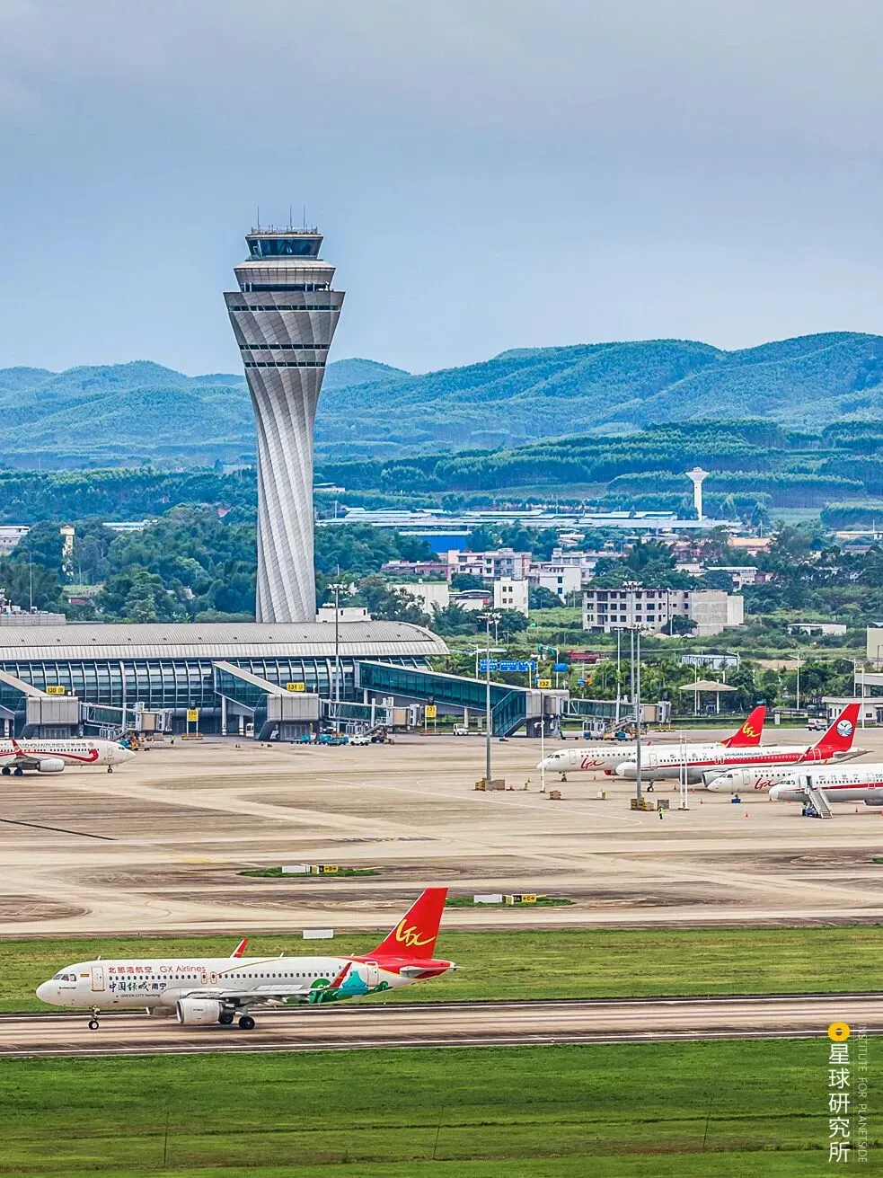 南宁国际空港项目在南宁吴圩国际机场T2航站楼动工;下图是南宁吴圩国际机场,机场跑道上的飞机是以南宁冠名的“中国绿城南宁号”,上面绘有“绿城”特色的创意图案 | 摄影师@余明
