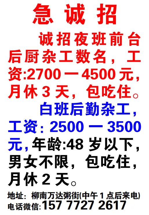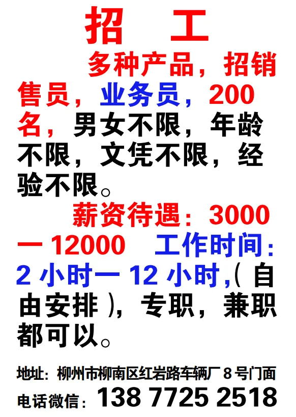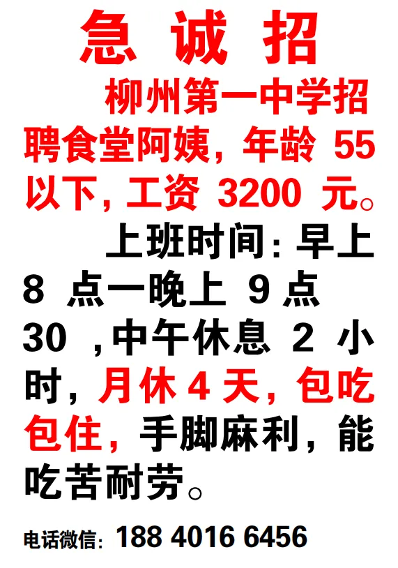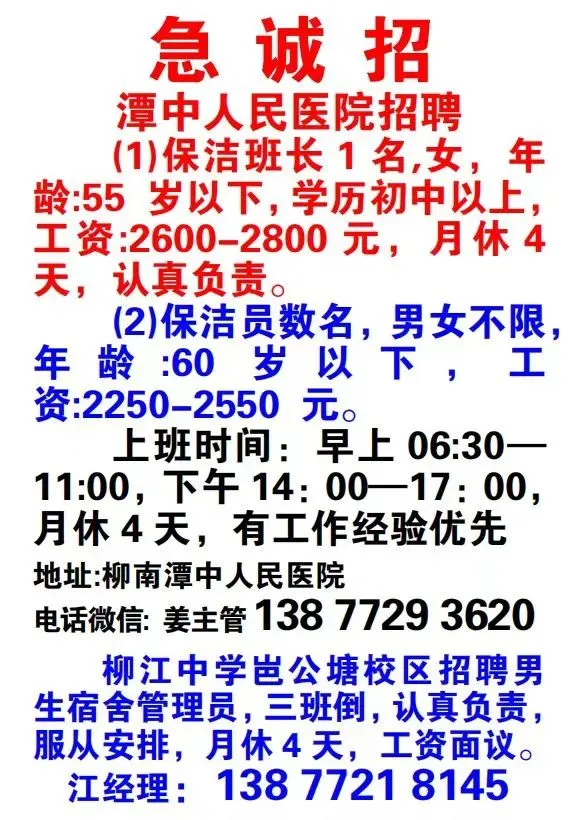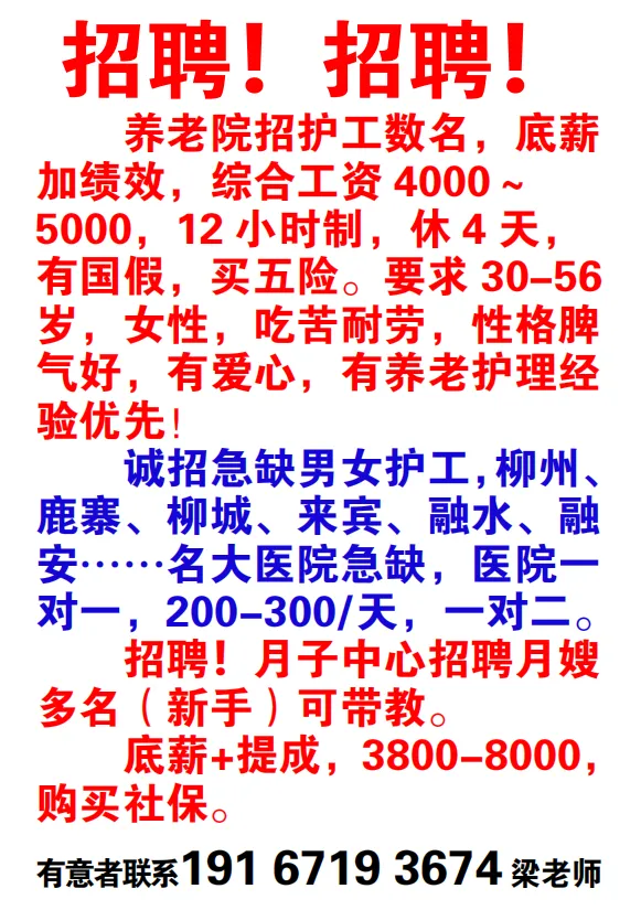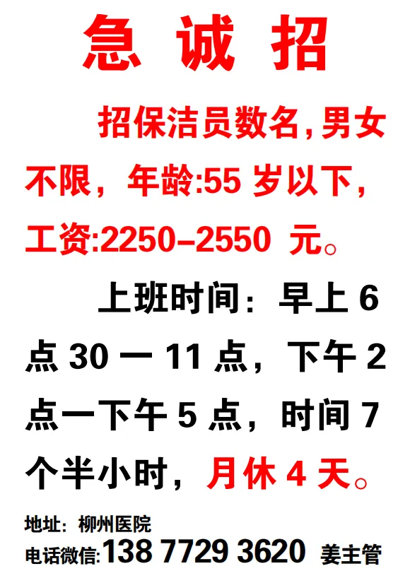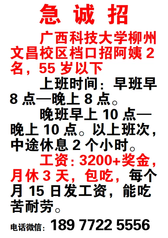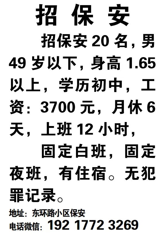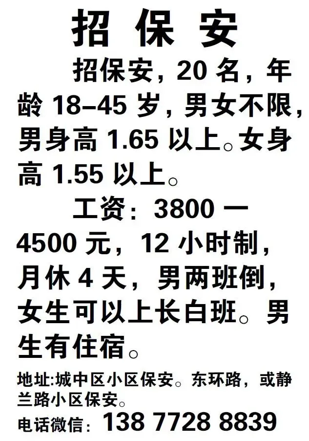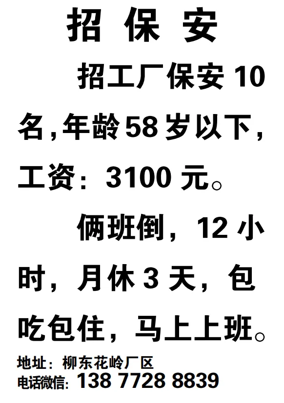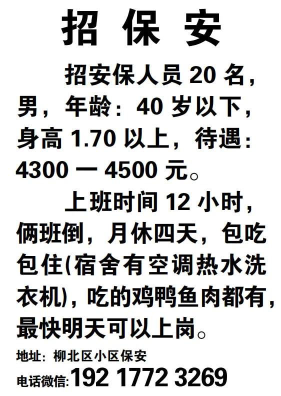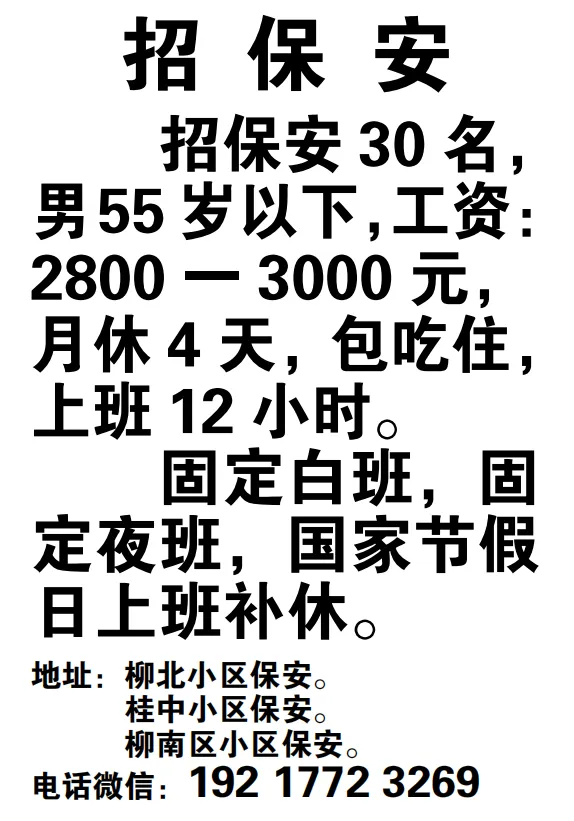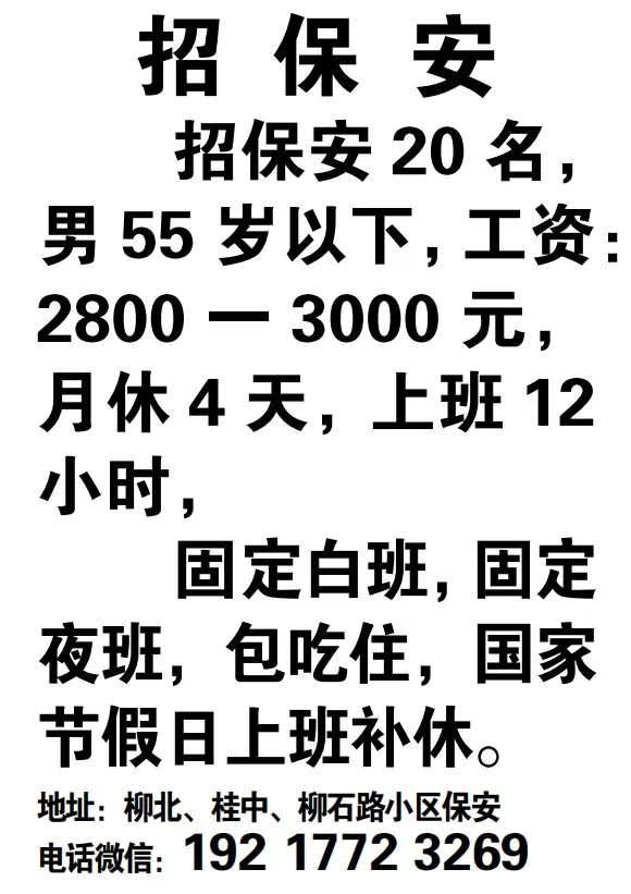 招保安20名,男53岁以下,工资:3800元,月休3天,上班12小时,固定白班、夜班,地址:静兰路、古亭山小区、柳南区基隆小区保安,电话微信:19217723269