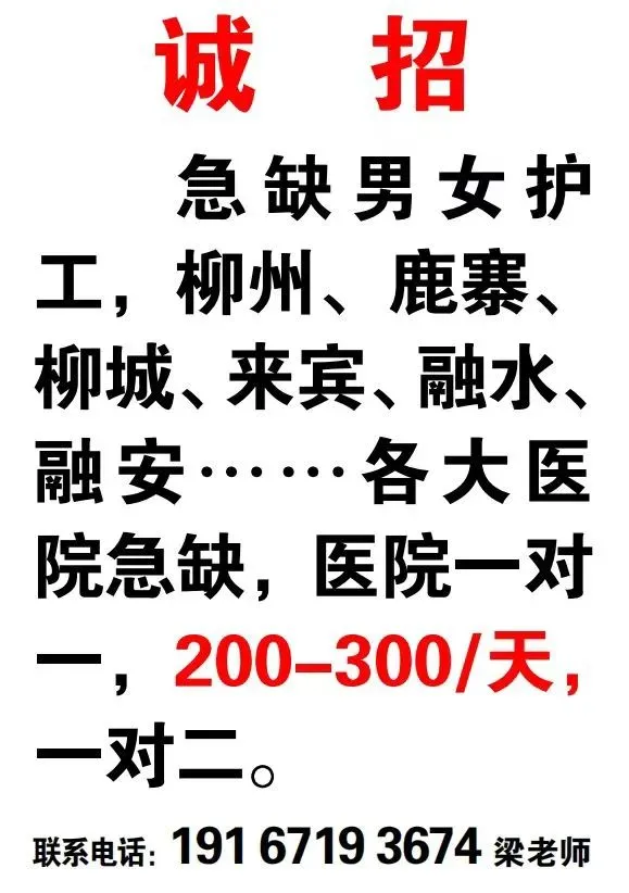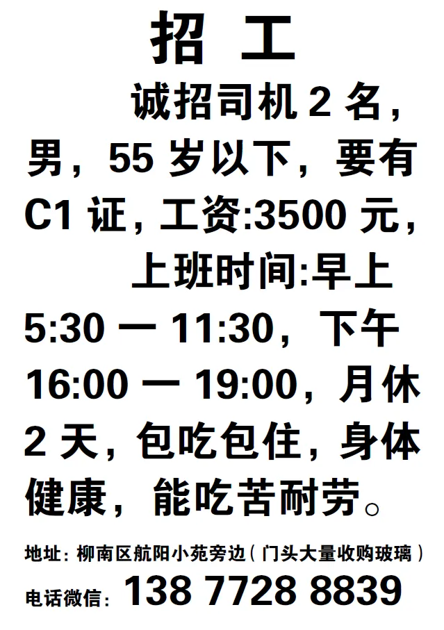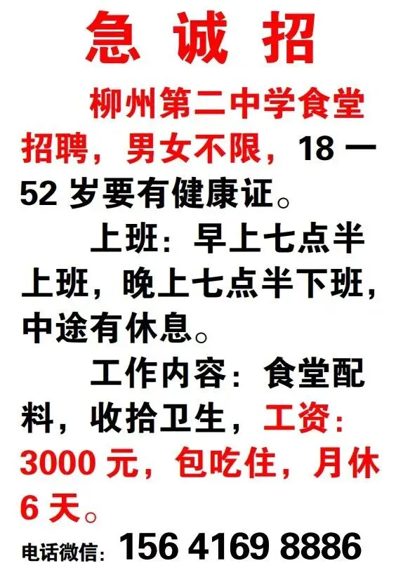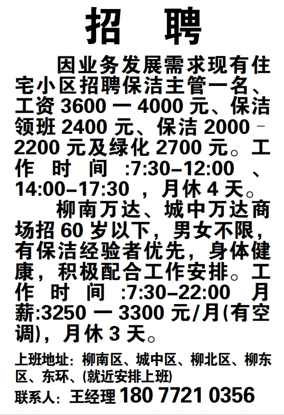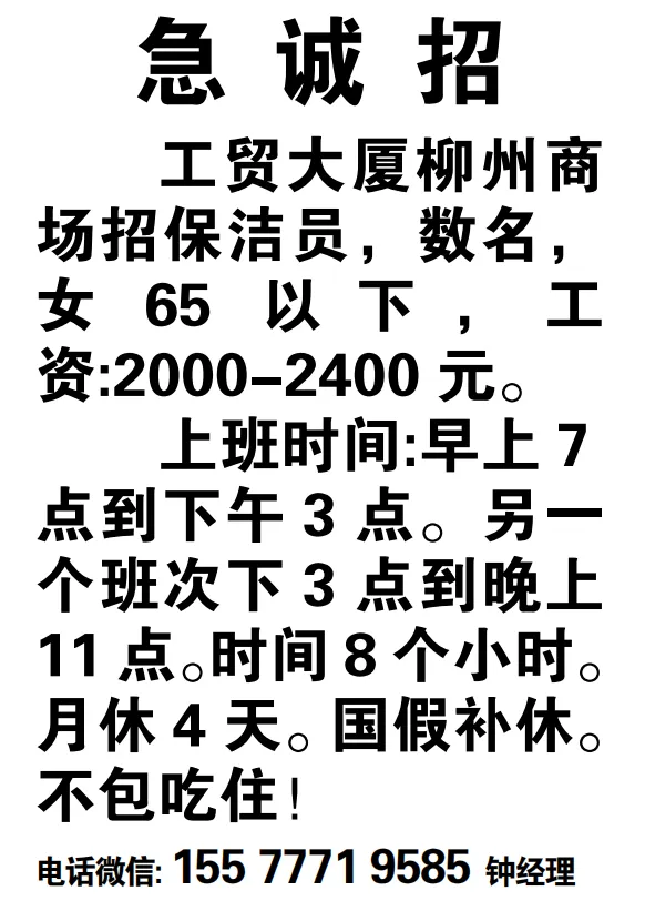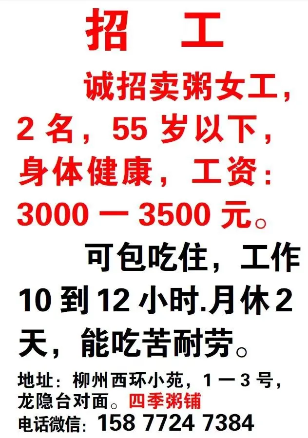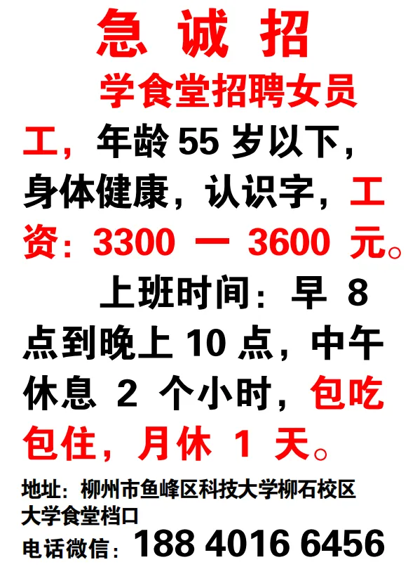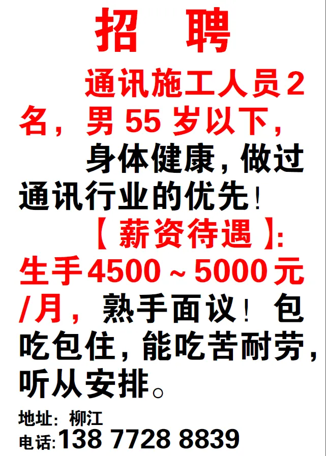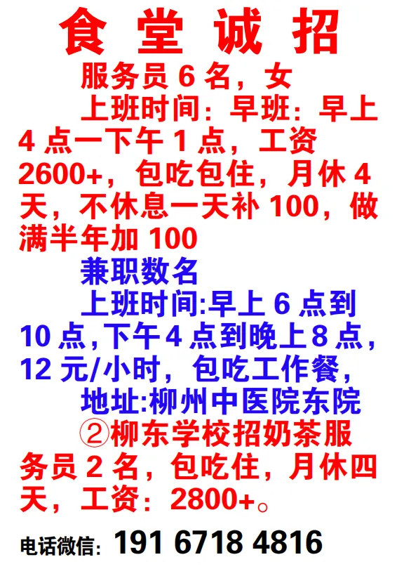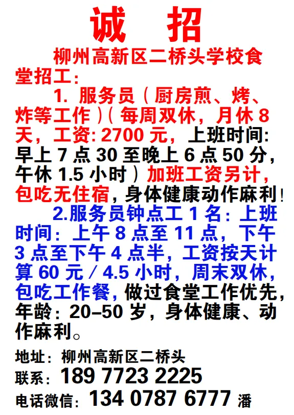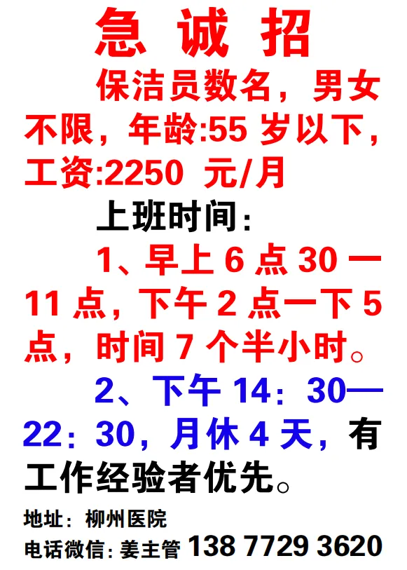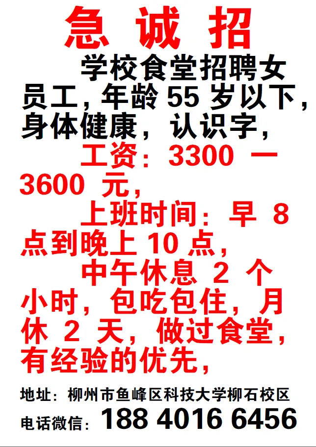招保安20名,男53岁以下,工资:3800元,月休3天,上班12小时,固定白班、夜班,地址:静兰路、古亭山小区、柳南区基隆小区保安,电话微信:19217723269