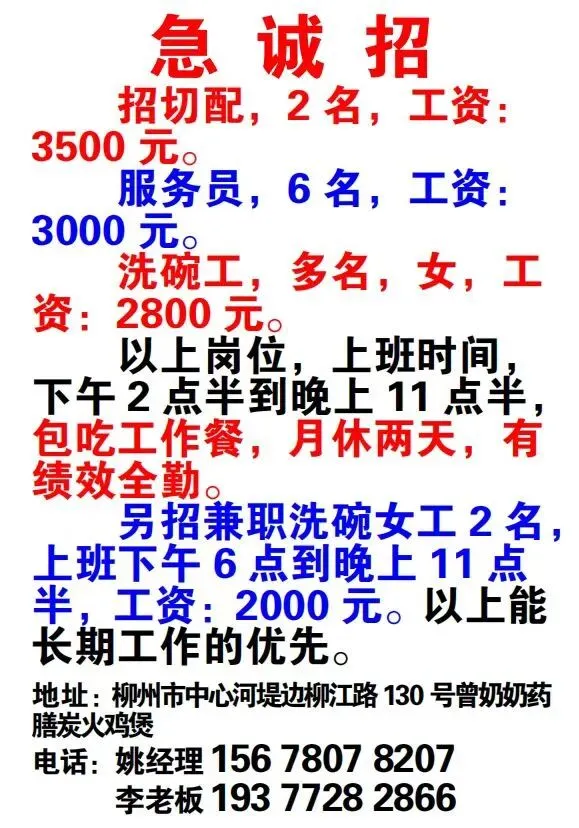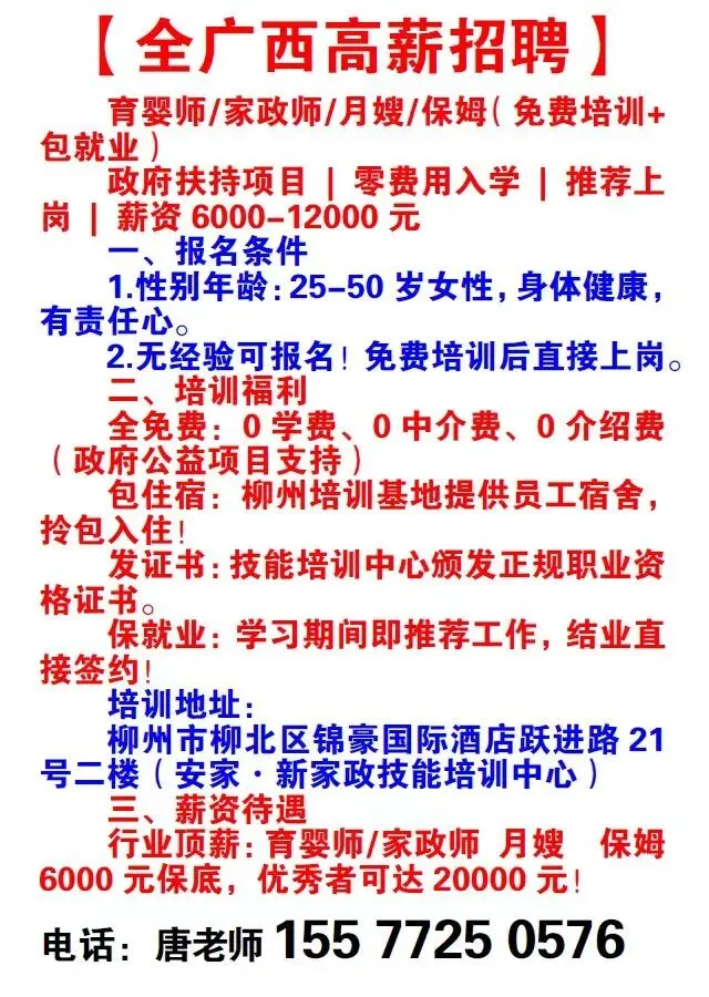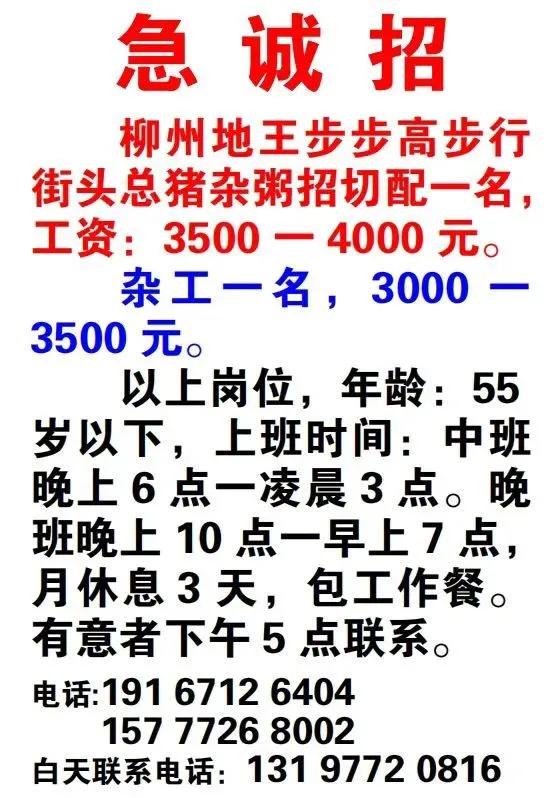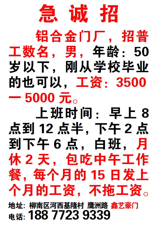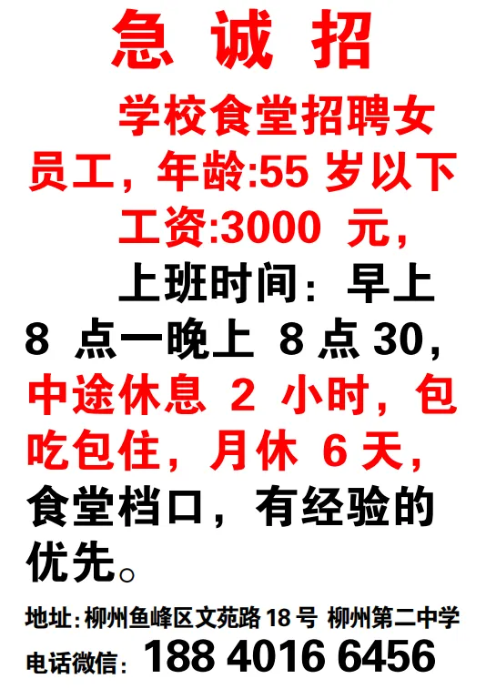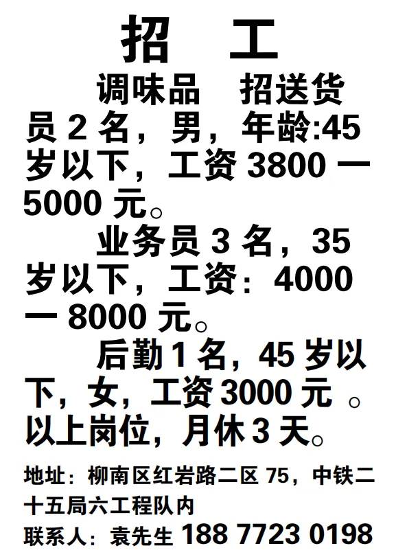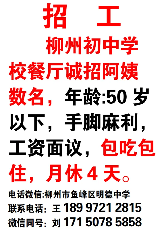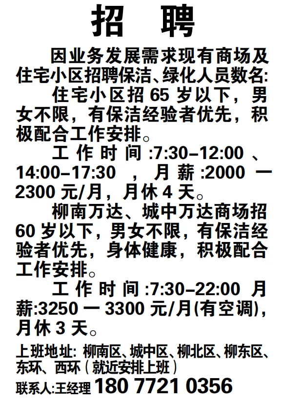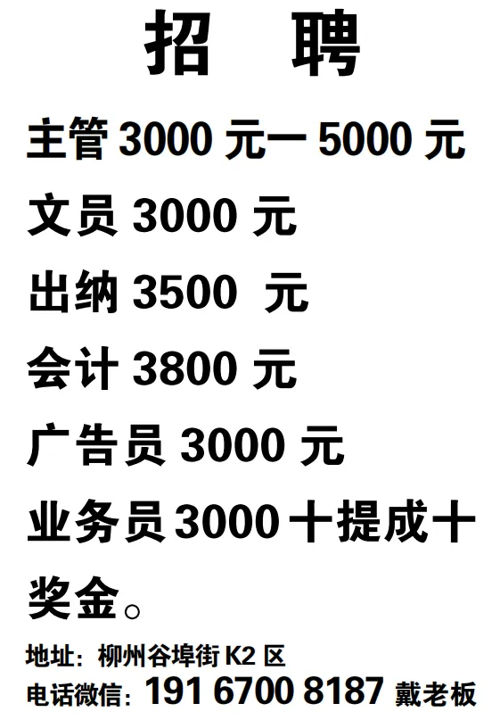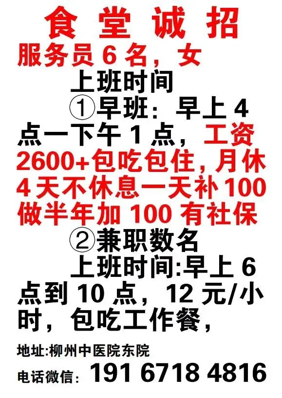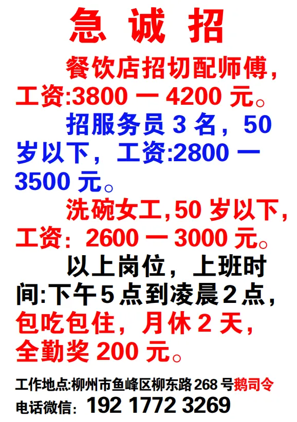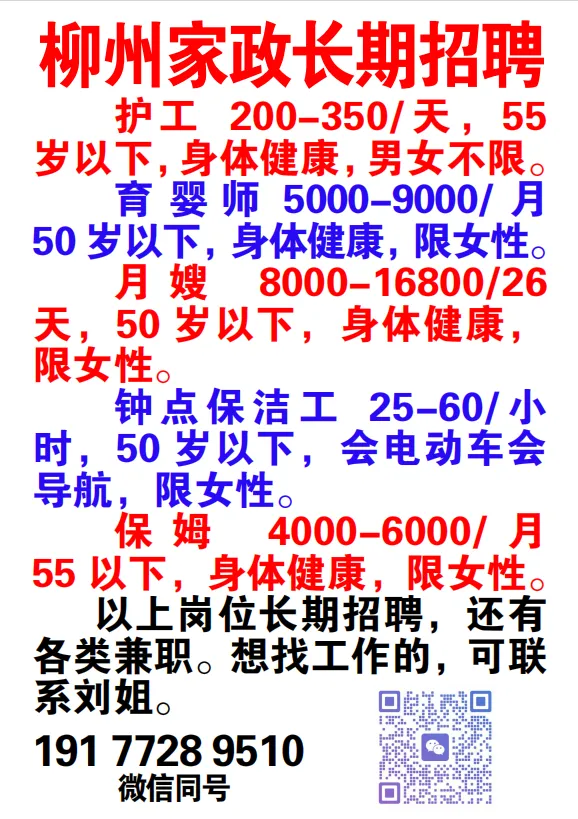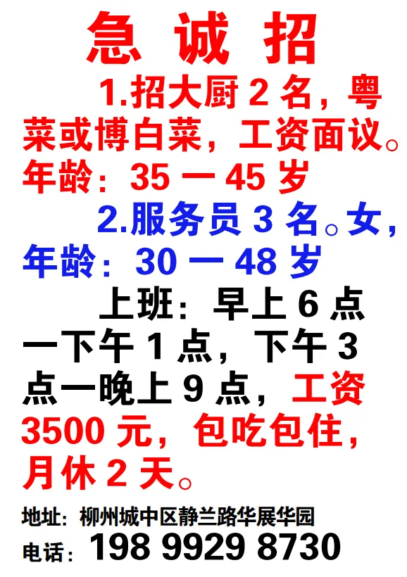 招保安20名,男53岁以下,工资:3800元,月休3天,上班12小时,固定白班、夜班,地址:静兰路、古亭山小区、柳南区基隆小区保安,电话微信:19217723269