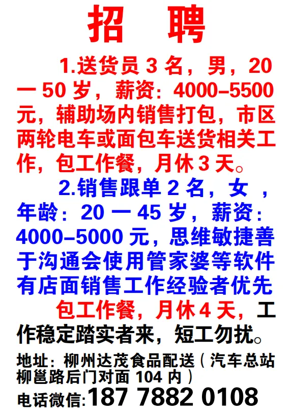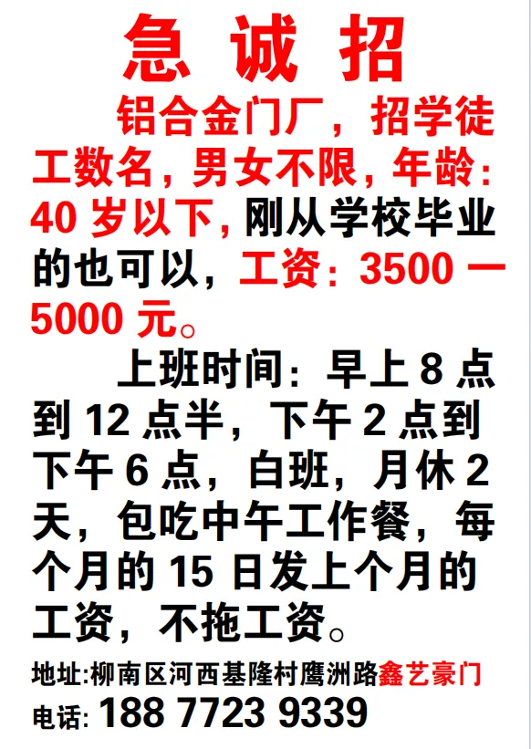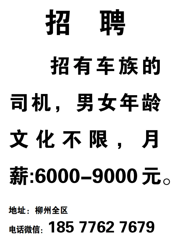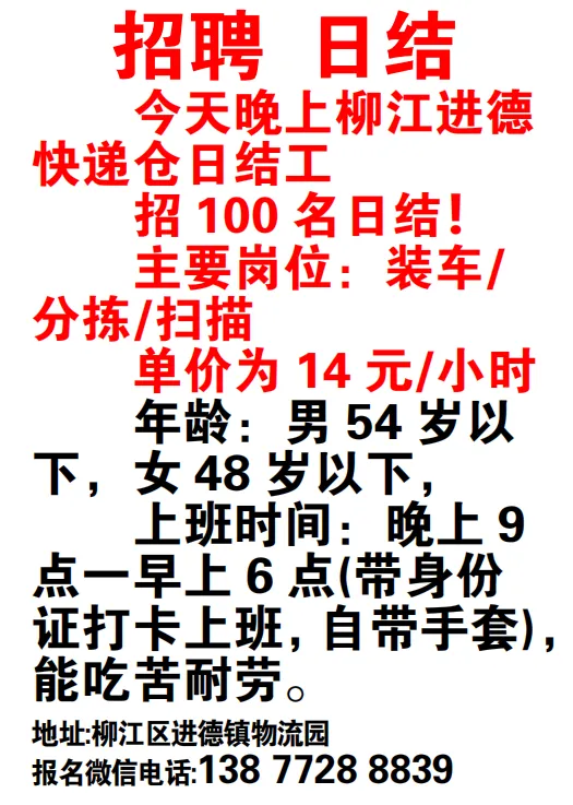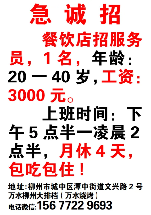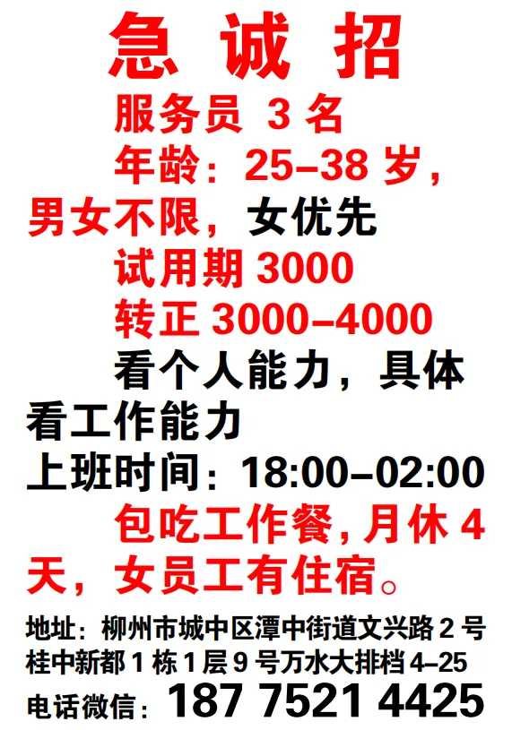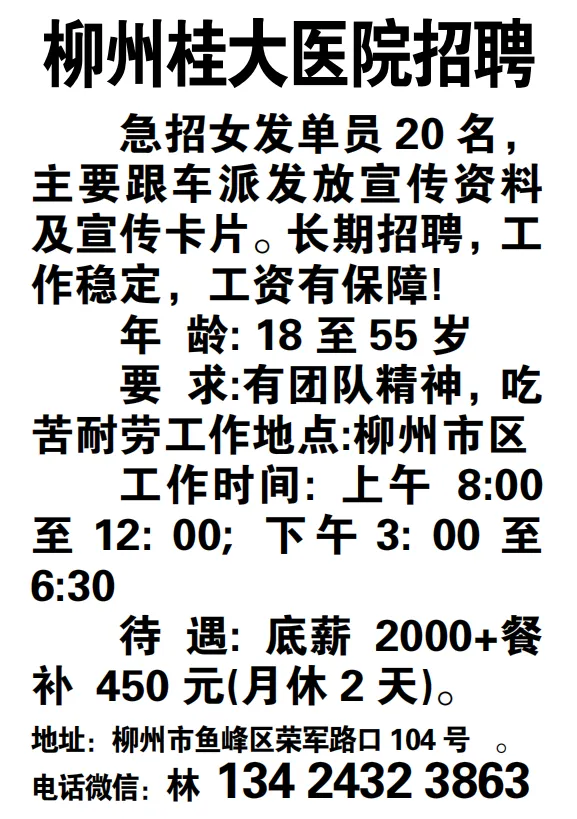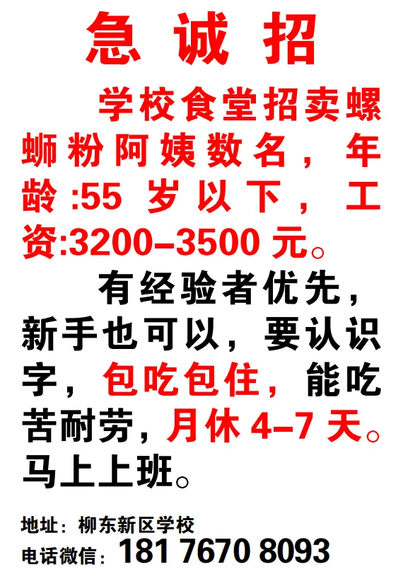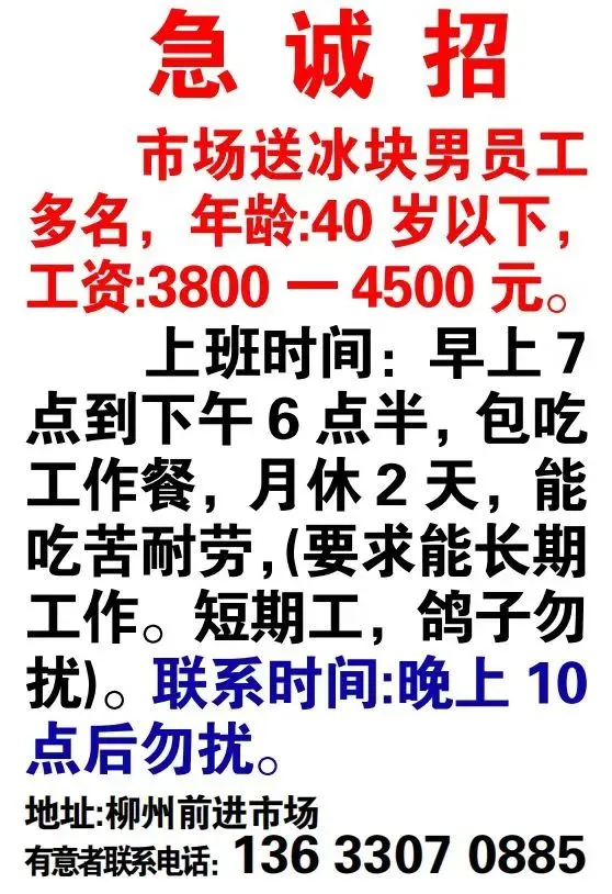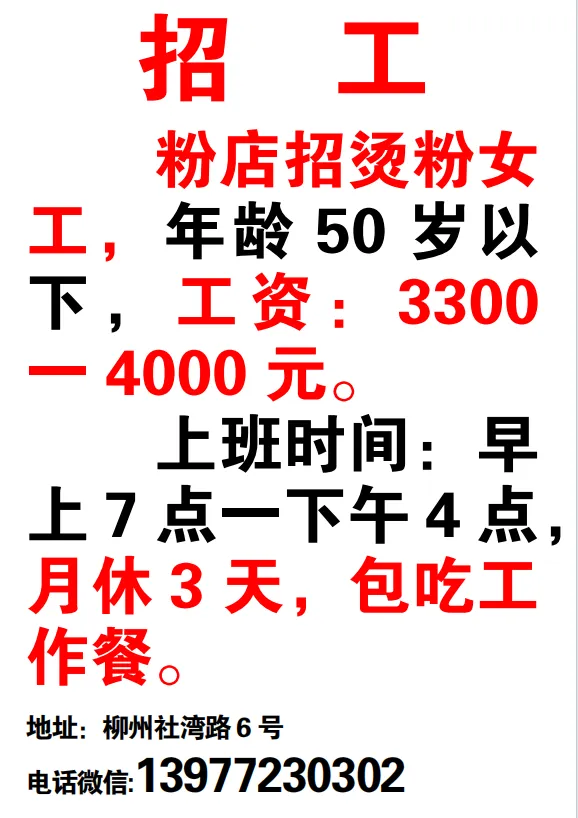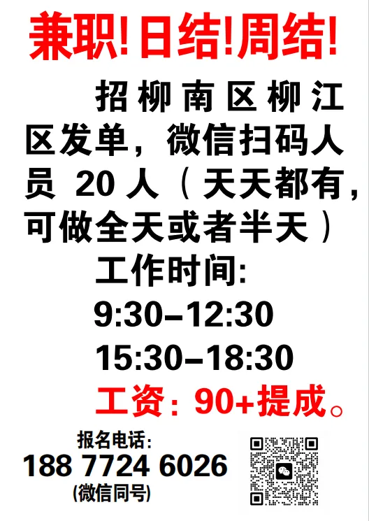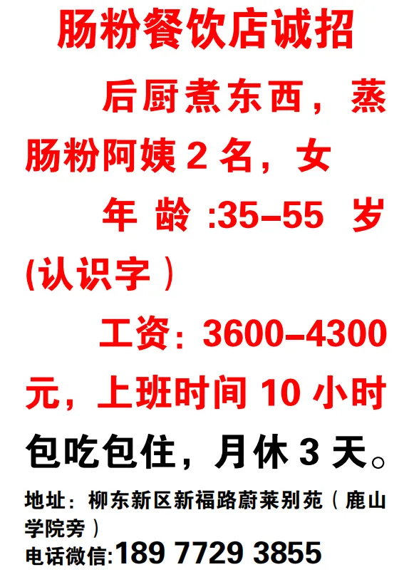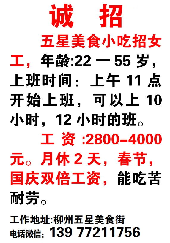 招保安20名,男53岁以下,工资:3800元,月休3天,上班12小时,固定白班、夜班,地址:静兰路、古亭山小区、柳南区基隆小区保安,电话微信:19217723269