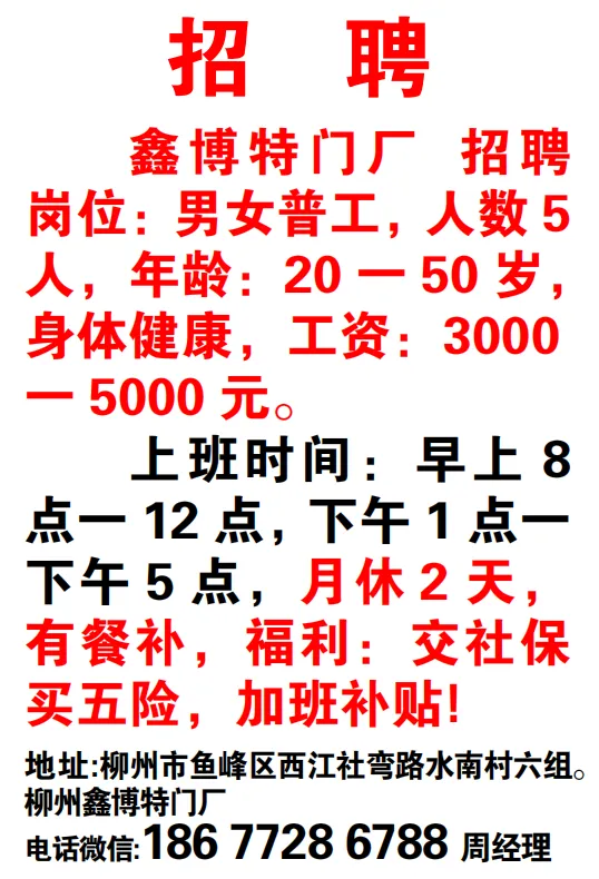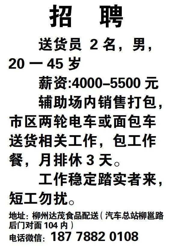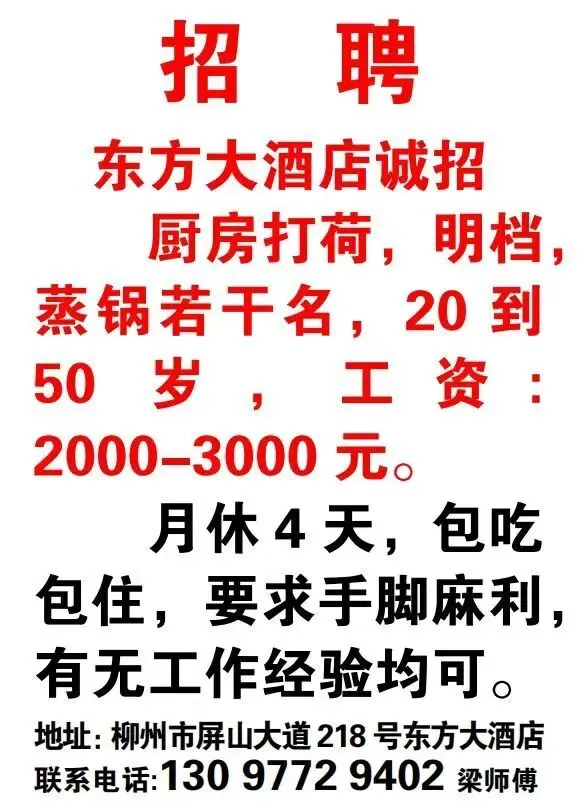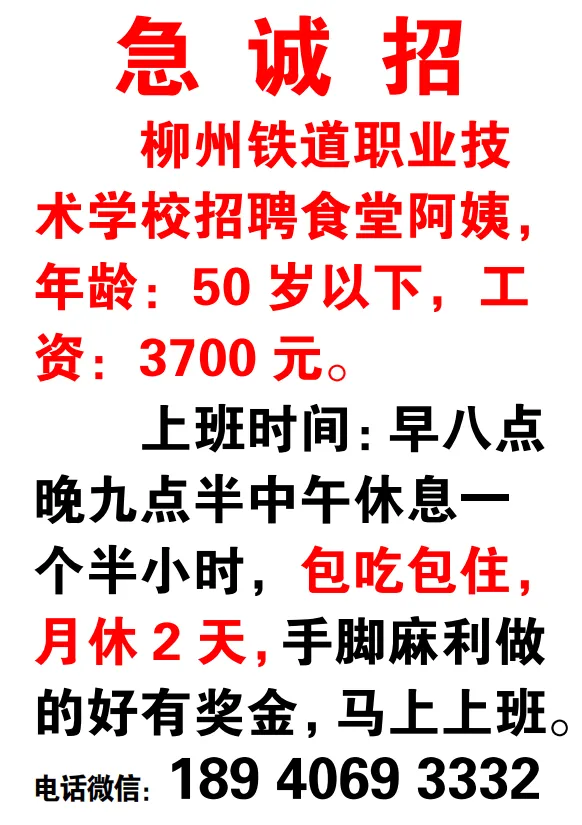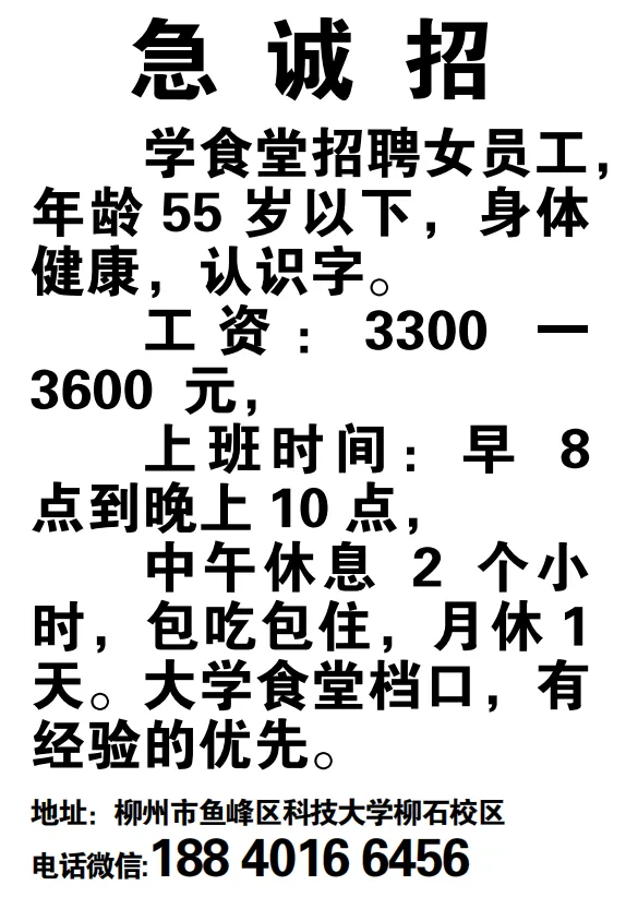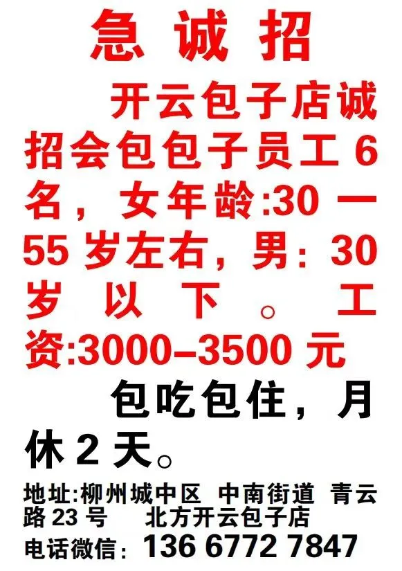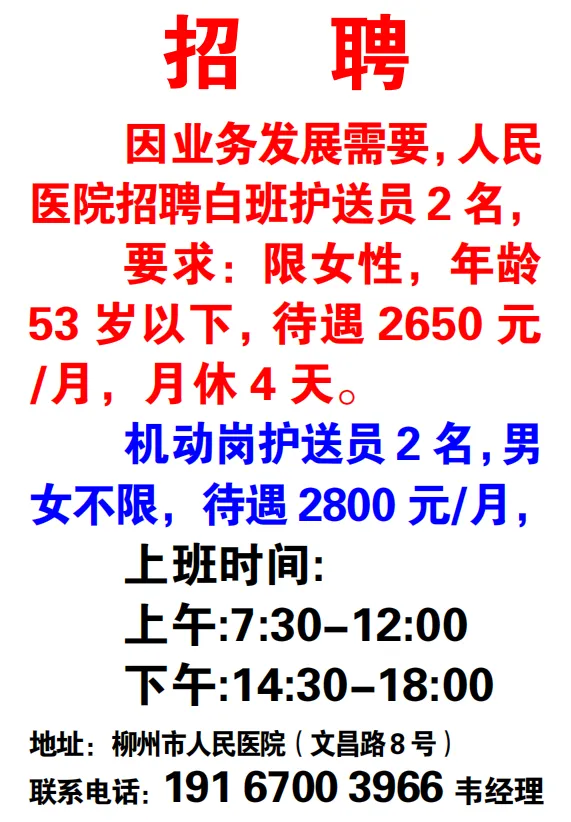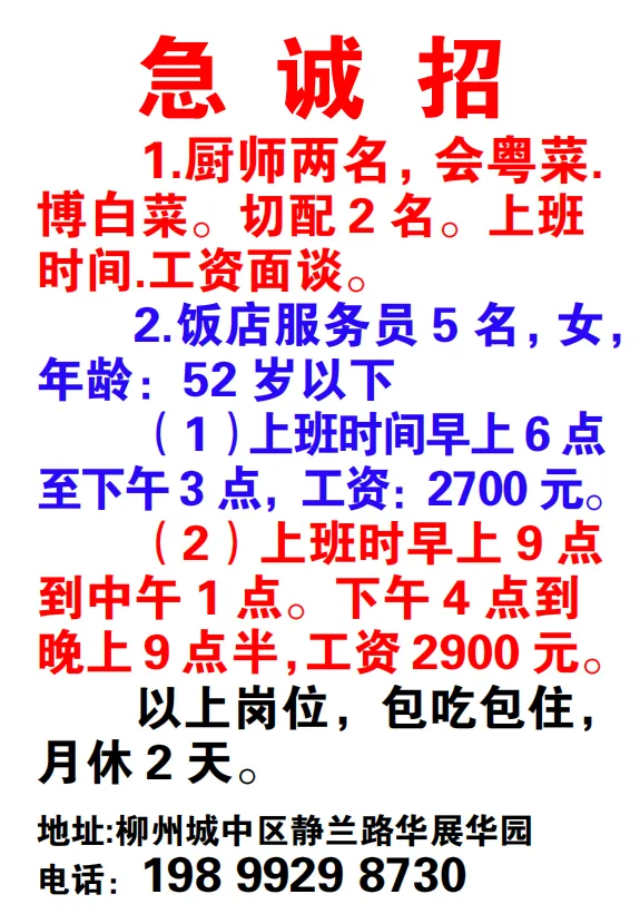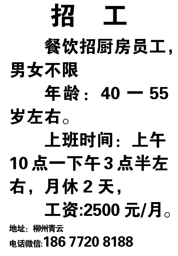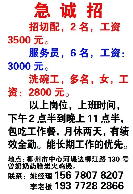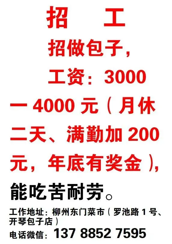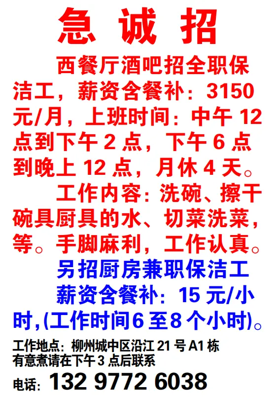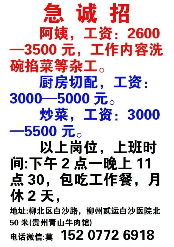 招保安20名,男53岁以下,工资:3800元,月休3天,上班12小时,固定白班、夜班,地址:静兰路、古亭山小区、柳南区基隆小区保安,电话微信:19217723269