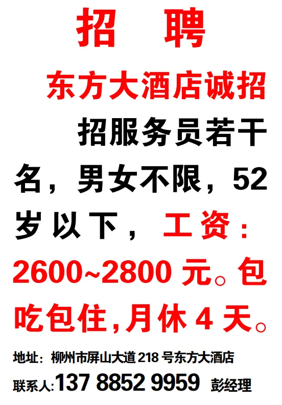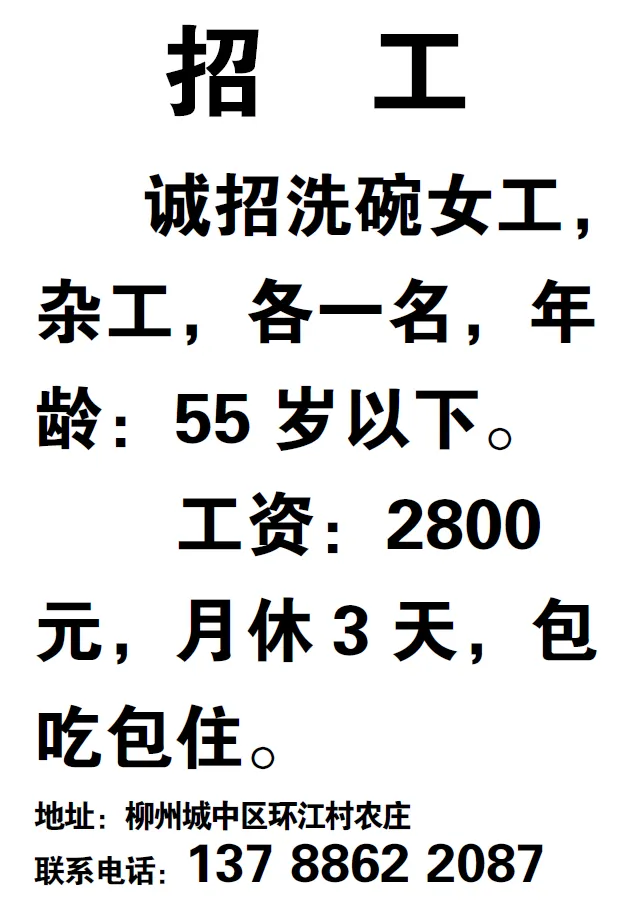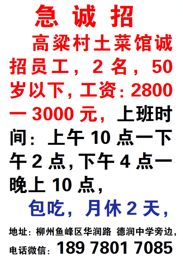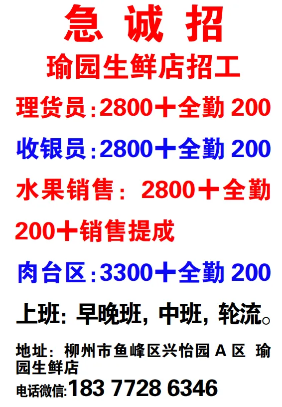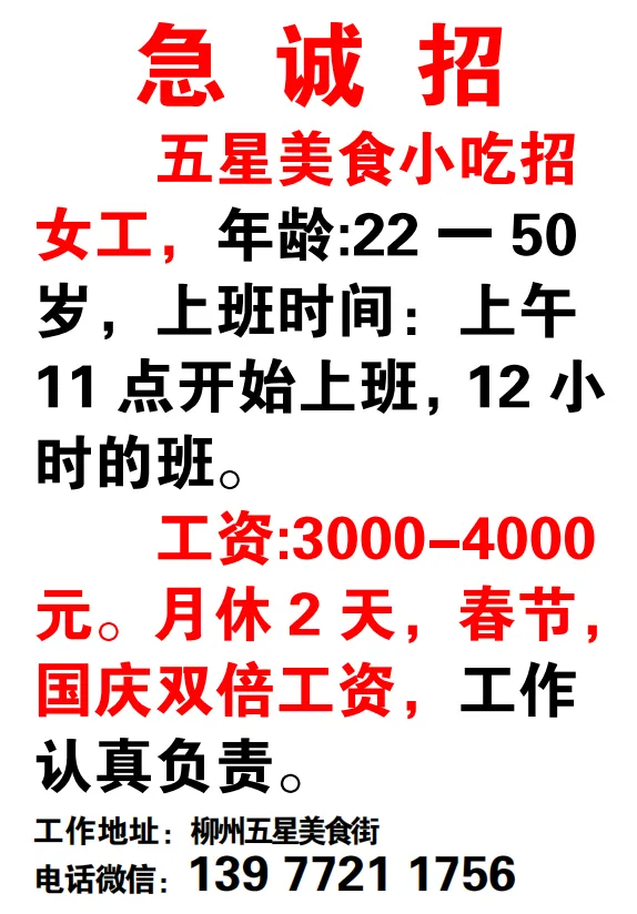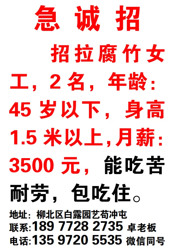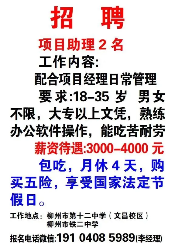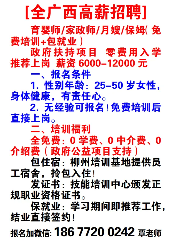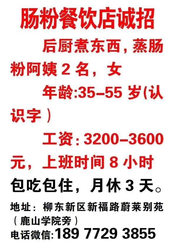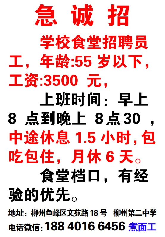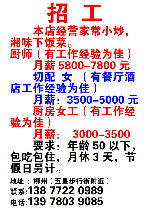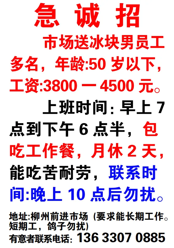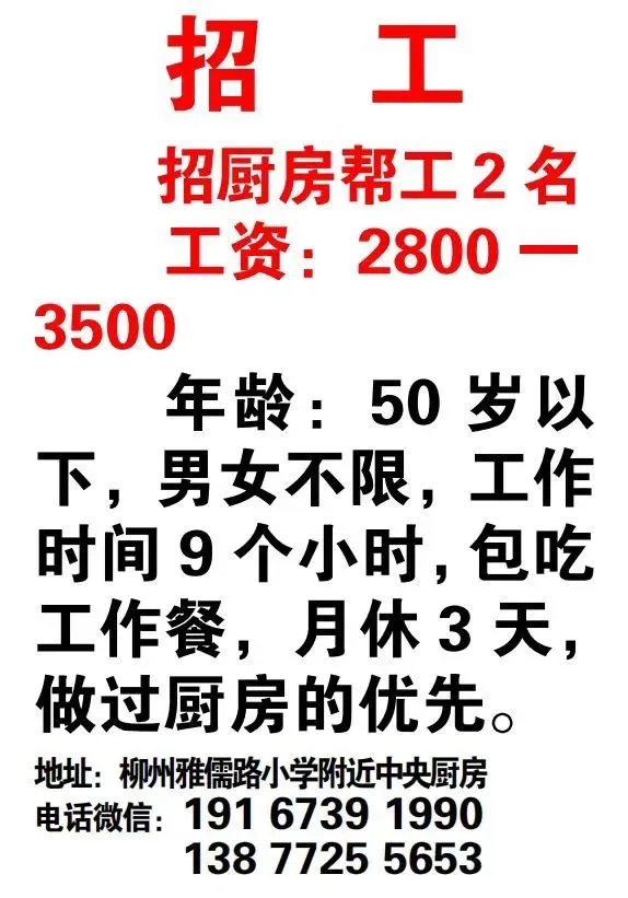 招保安20名,男53岁以下,工资:3800元,月休3天,上班12小时,固定白班、夜班,地址:静兰路、古亭山小区、柳南区基隆小区保安,电话微信:19217723269
