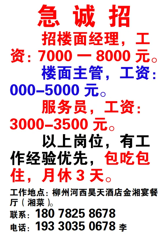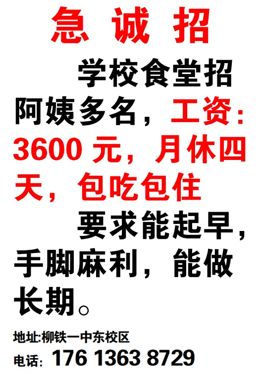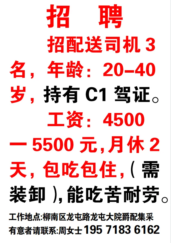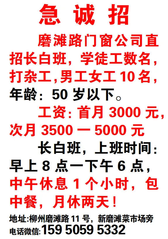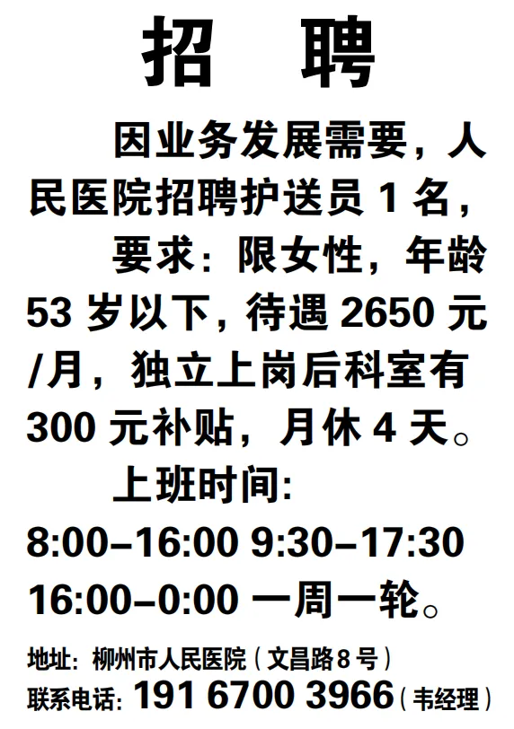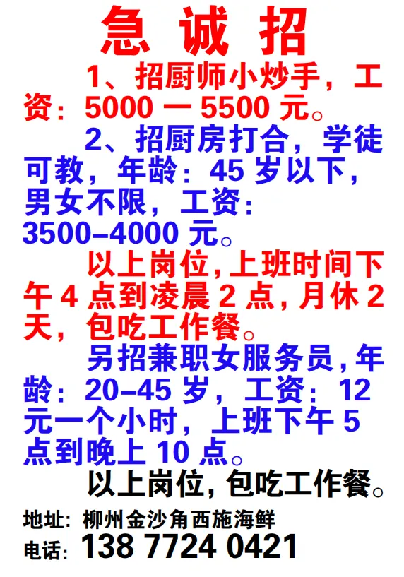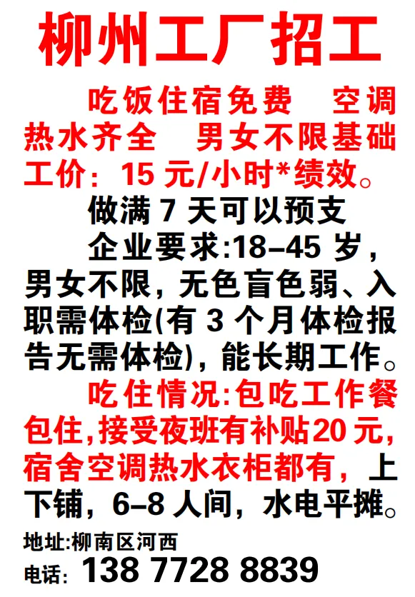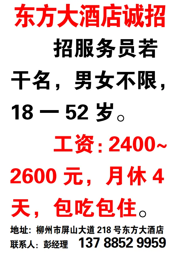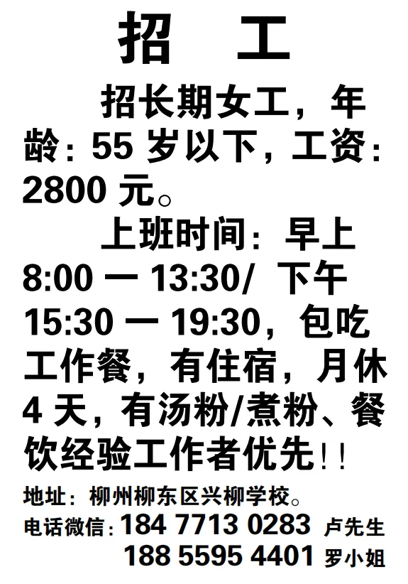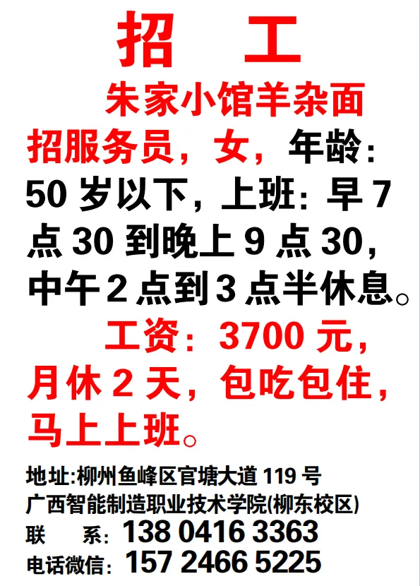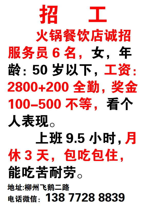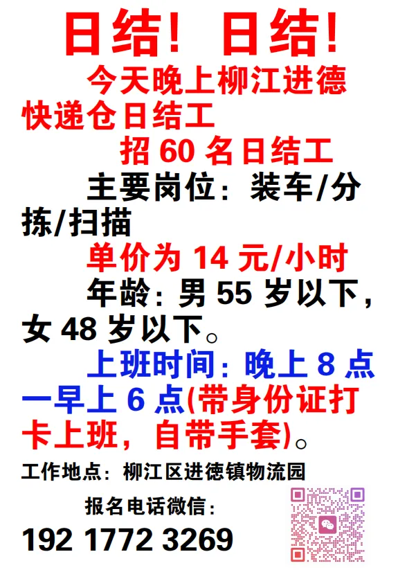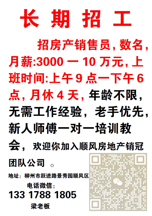 招保安20名,男53岁以下,工资:3800元,月休3天,上班12小时,固定白班、夜班,地址:静兰路、古亭山小区、柳南区基隆小区保安,电话微信:19217723269