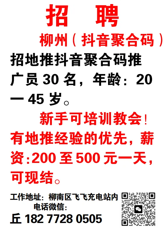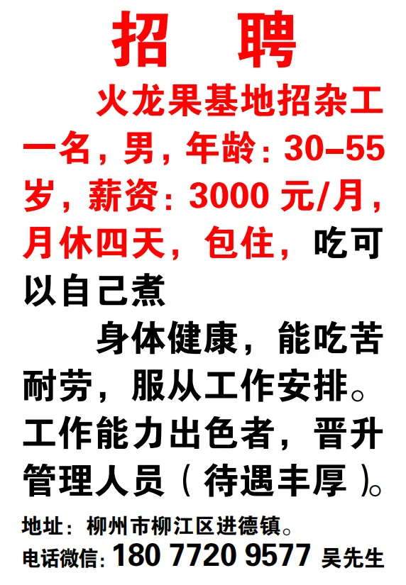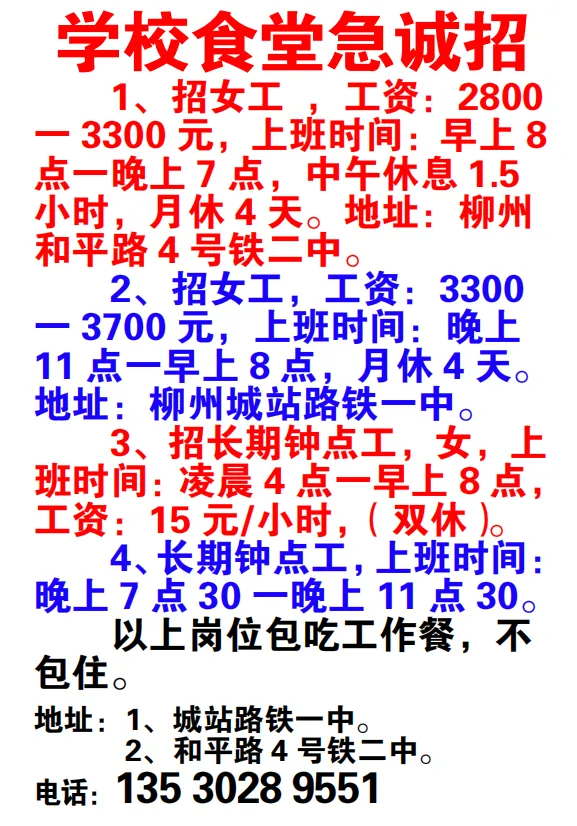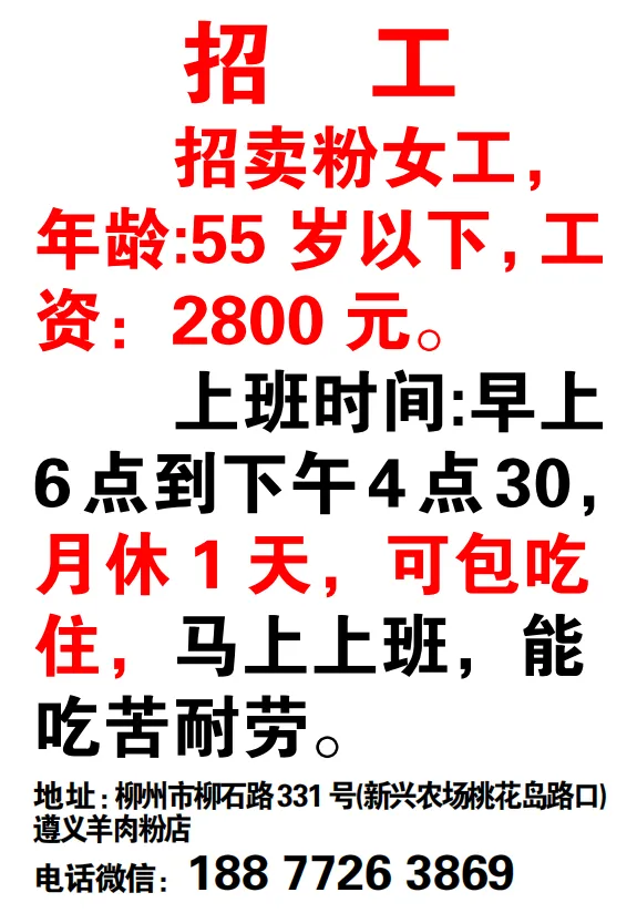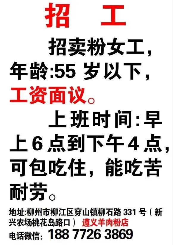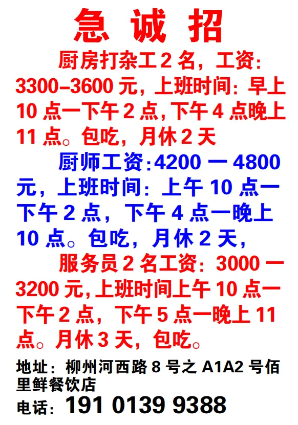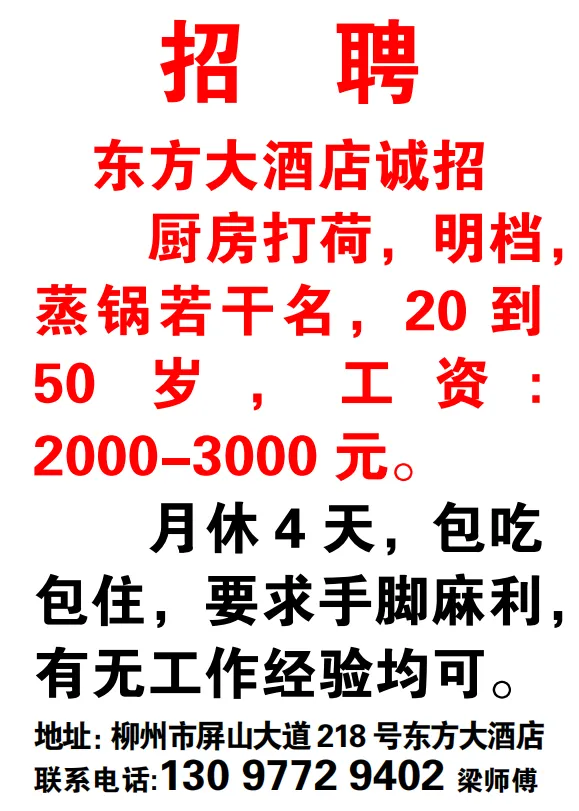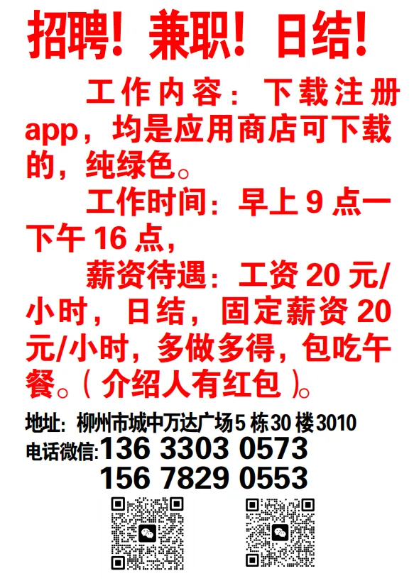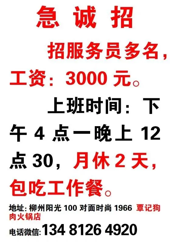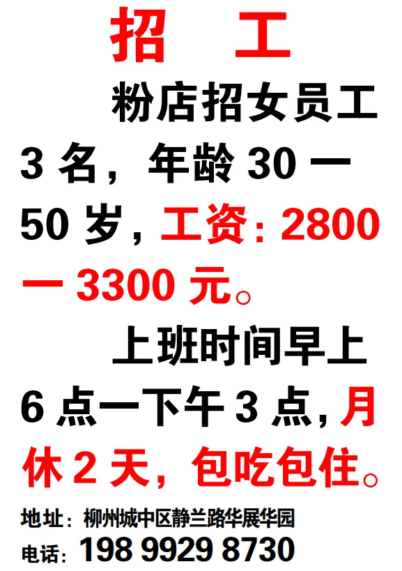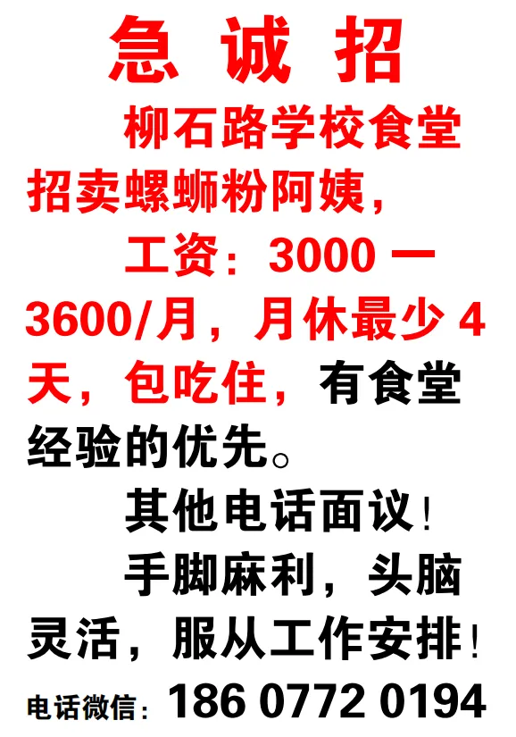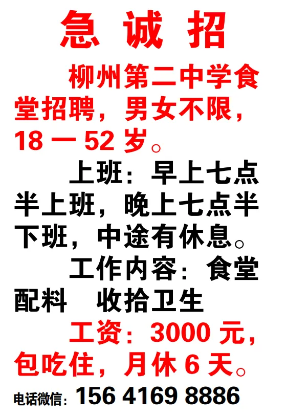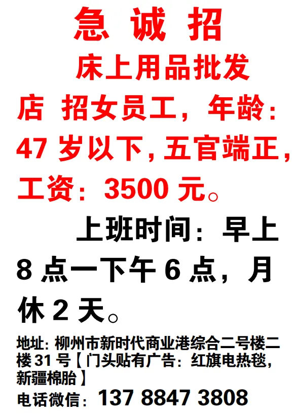 招保安20名,男53岁以下,工资:3800元,月休3天,上班12小时,固定白班、夜班,地址:静兰路、古亭山小区、柳南区基隆小区保安,电话微信:19217723269