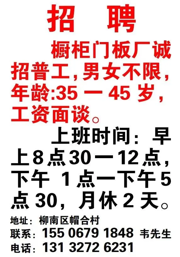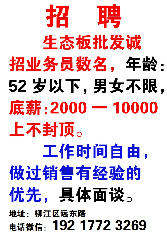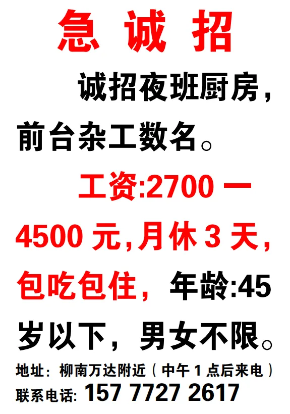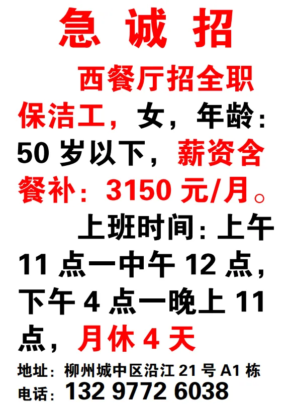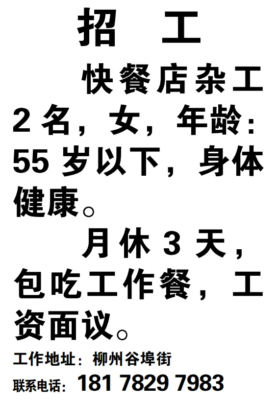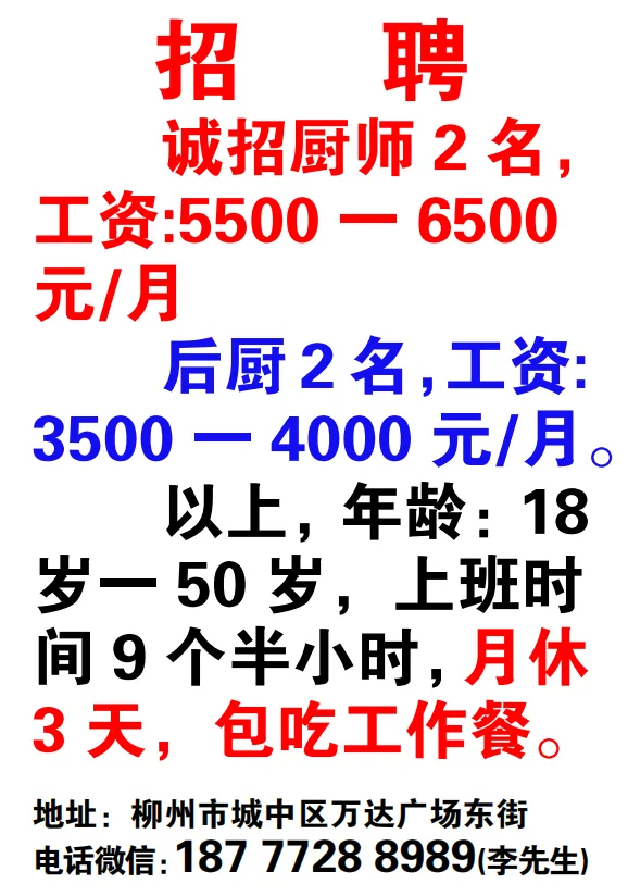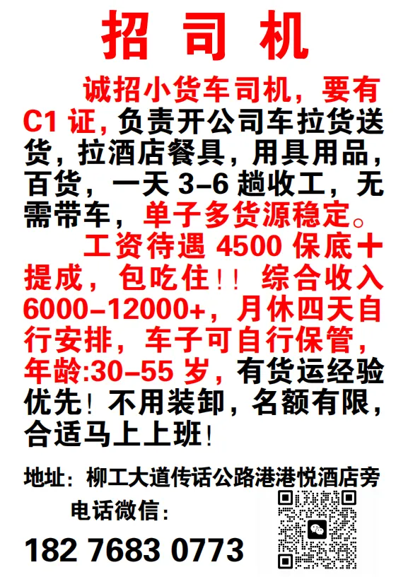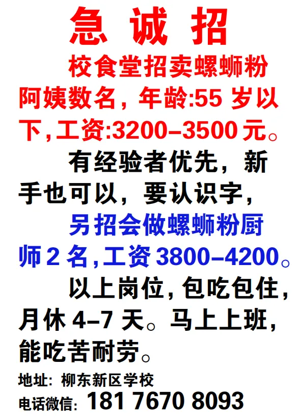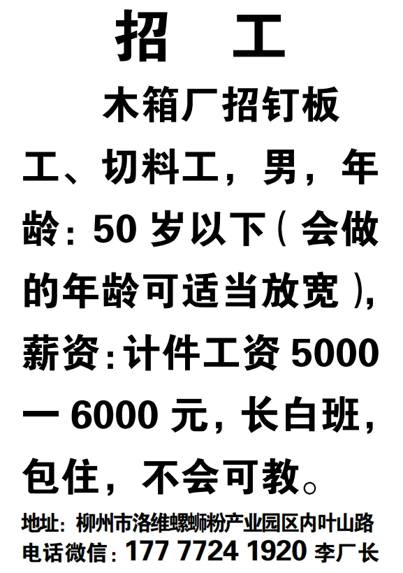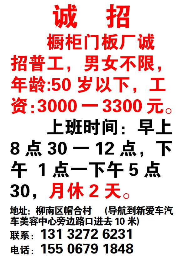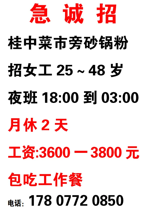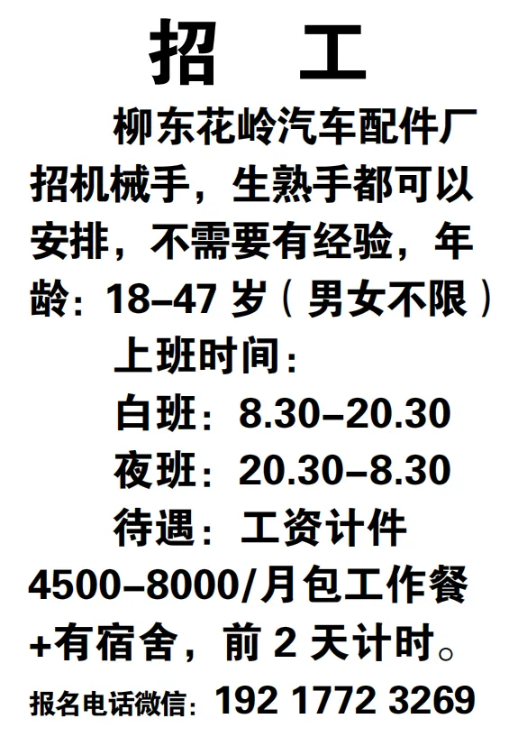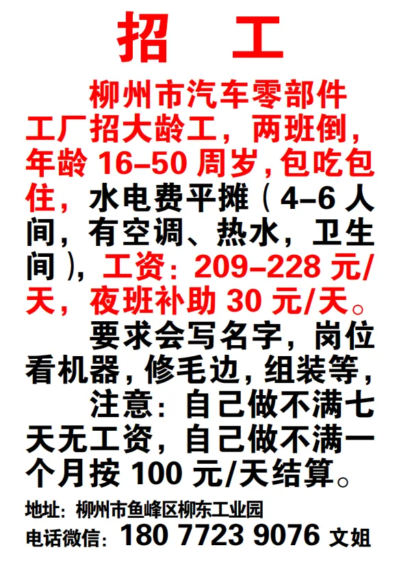 招保安20名,男53岁以下,工资:3800元,月休3天,上班12小时,固定白班、夜班,地址:静兰路、古亭山小区、柳南区基隆小区保安,电话微信:19217723269