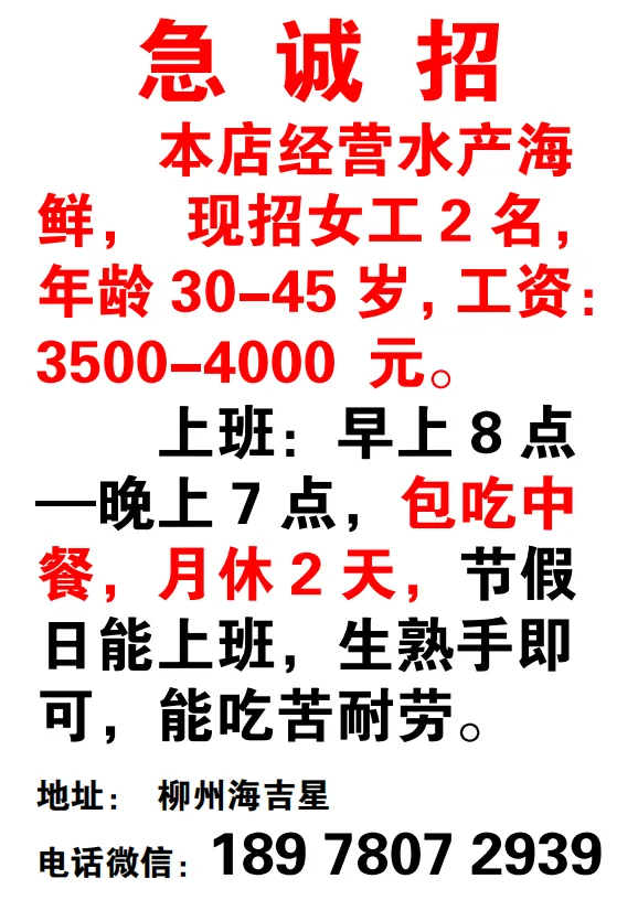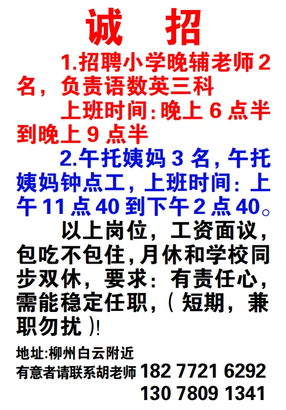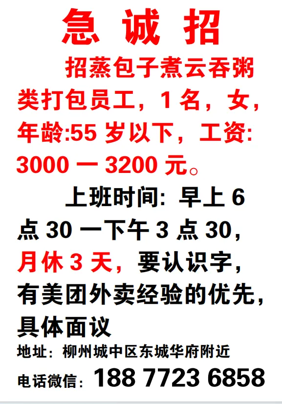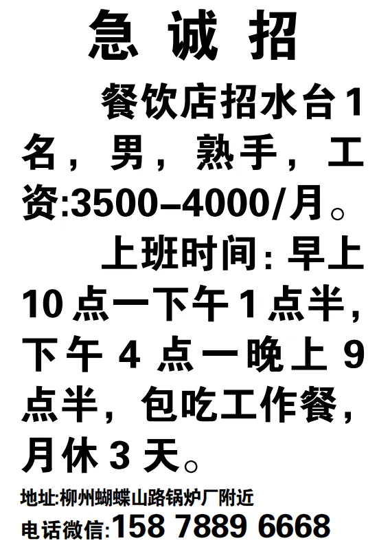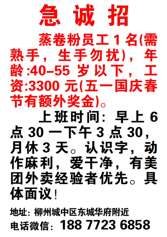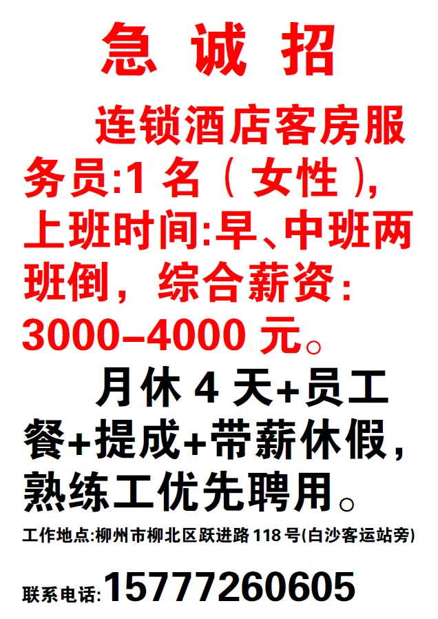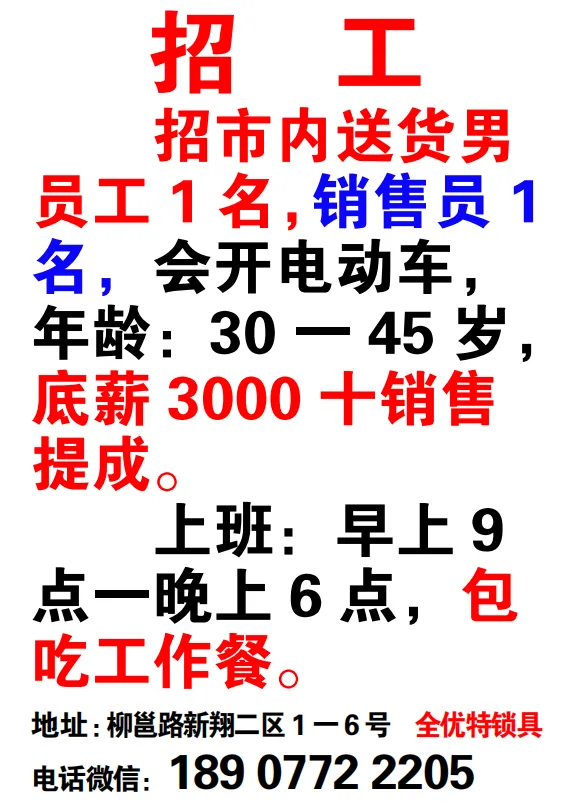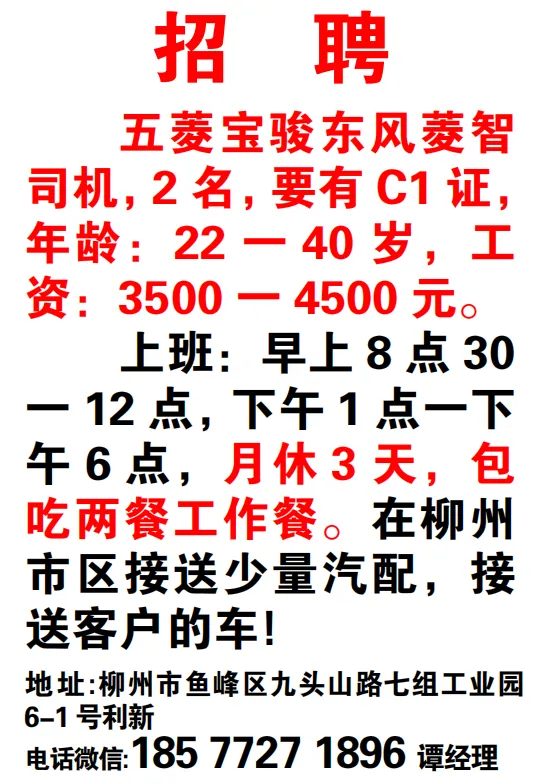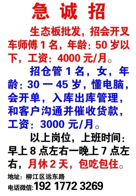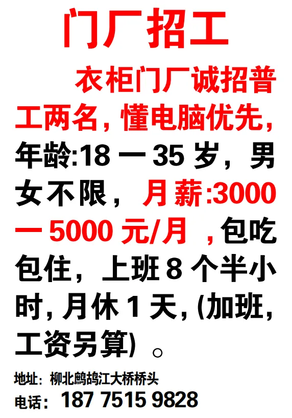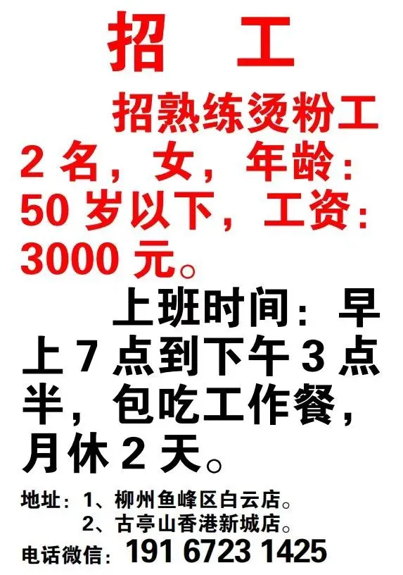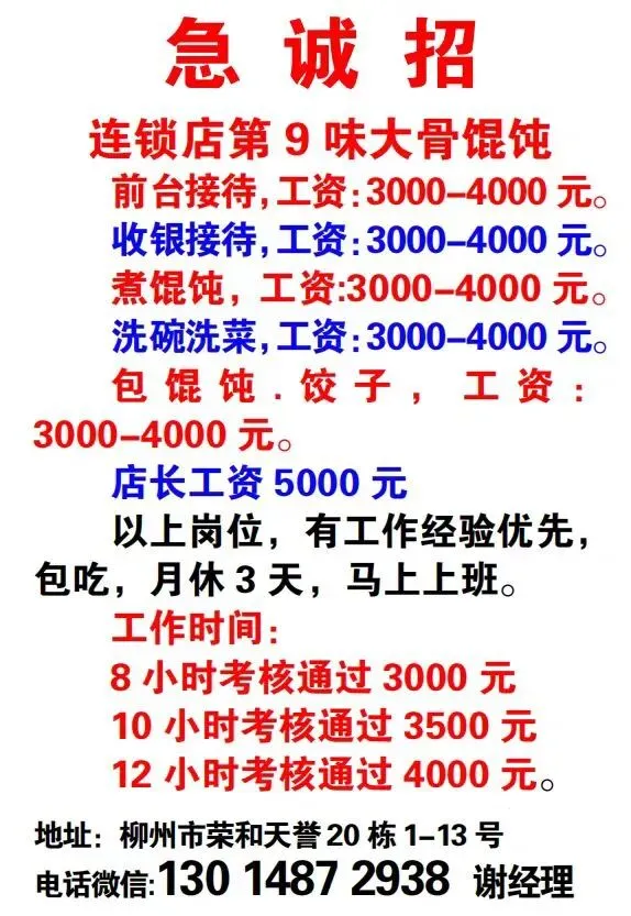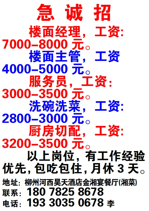 招保安20名,男53岁以下,工资:3800元,月休3天,上班12小时,固定白班、夜班,地址:静兰路、古亭山小区、柳南区基隆小区保安,电话微信:19217723269