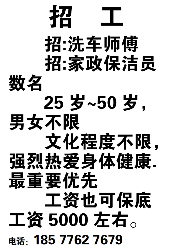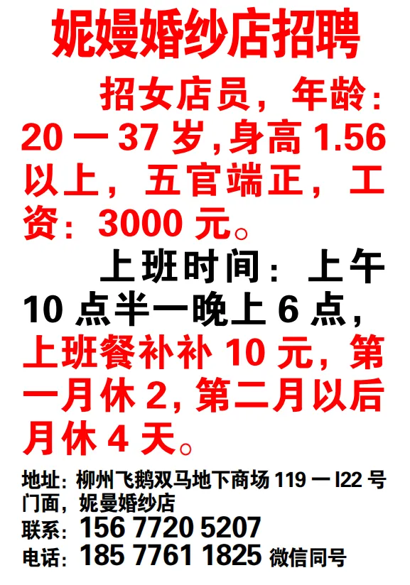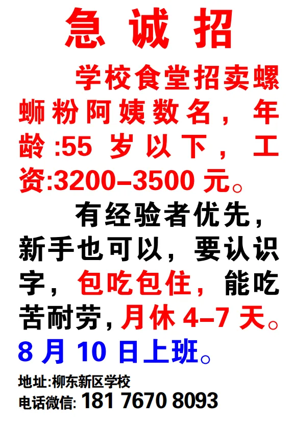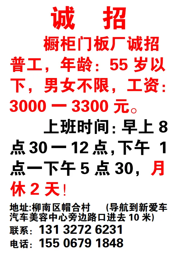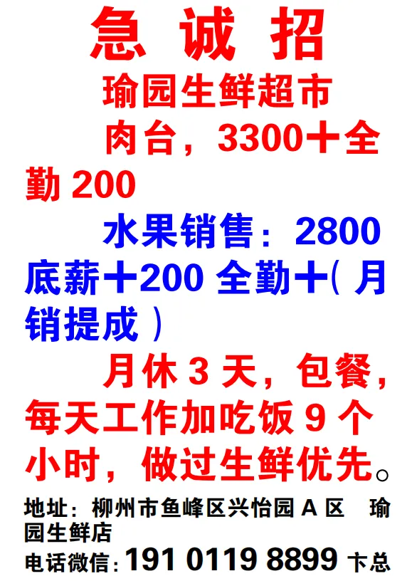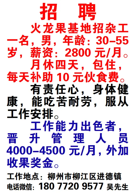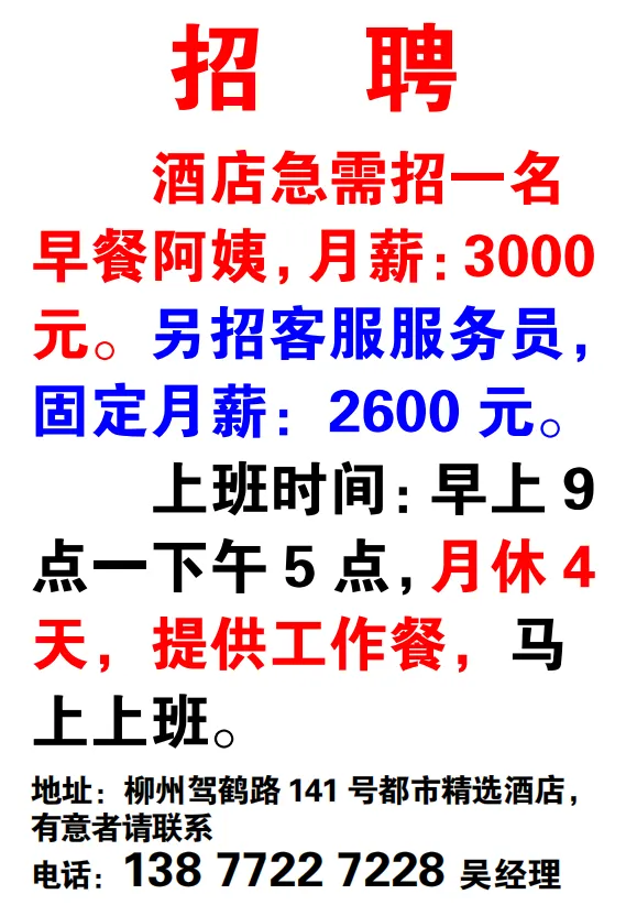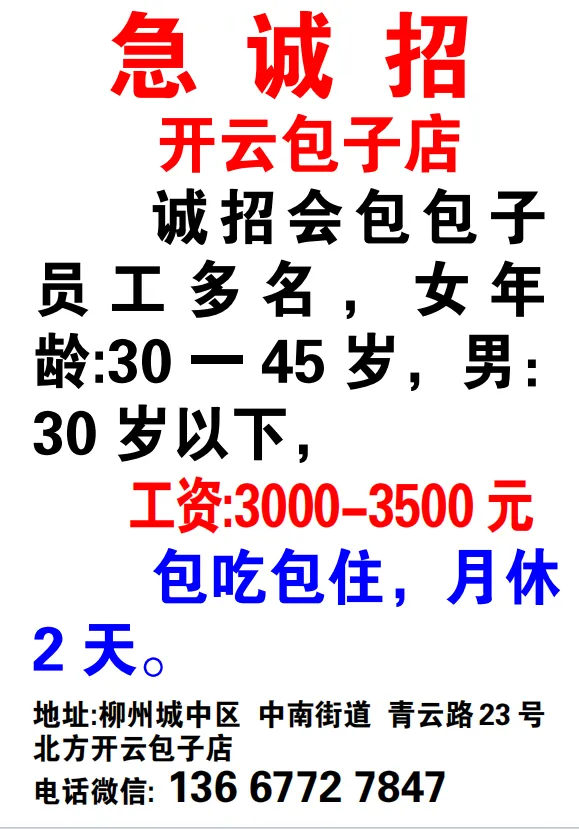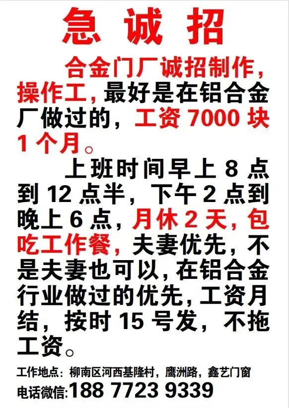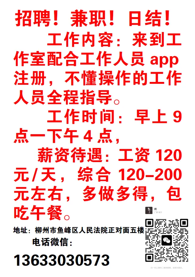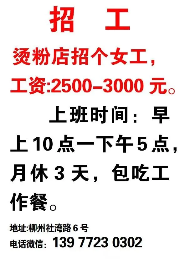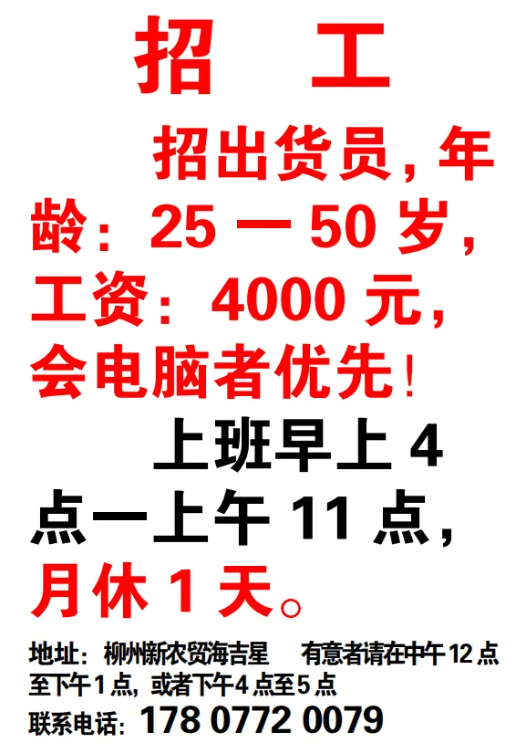 招保安20名,男53岁以下,工资:3800元,月休3天,上班12小时,固定白班、夜班,地址:静兰路、古亭山小区、柳南区基隆小区保安,电话微信:19217723269