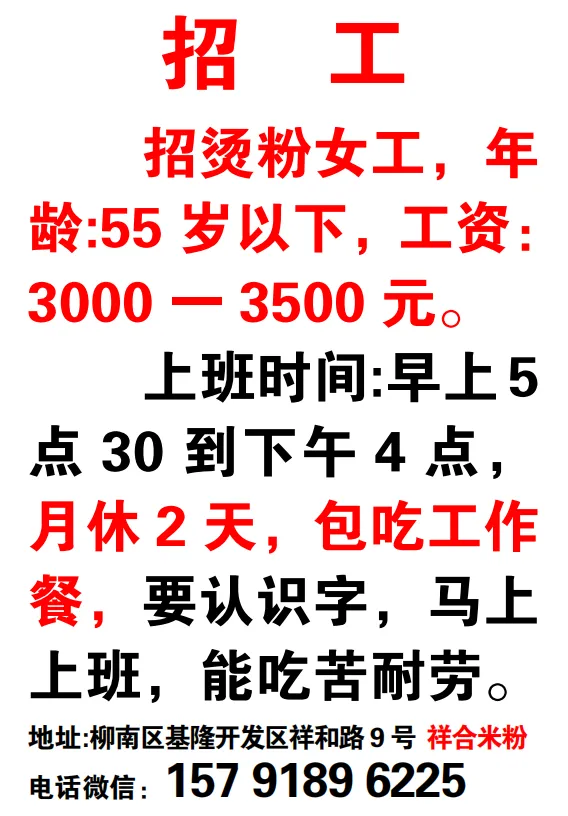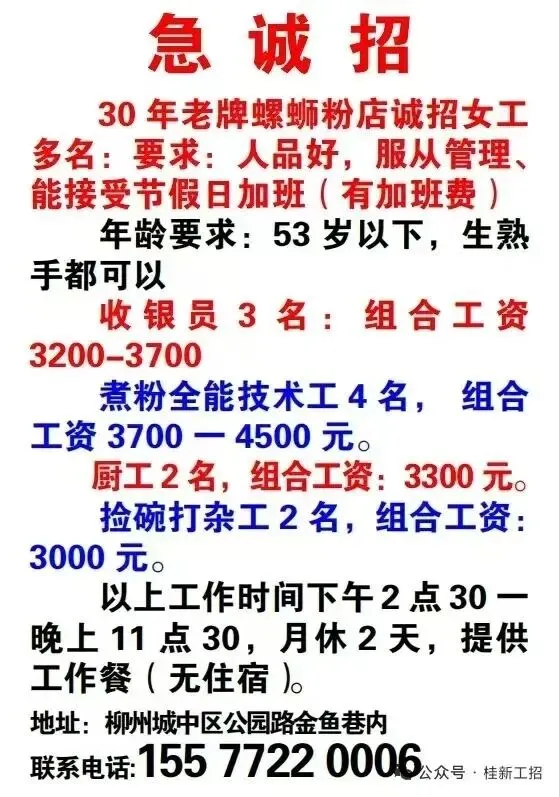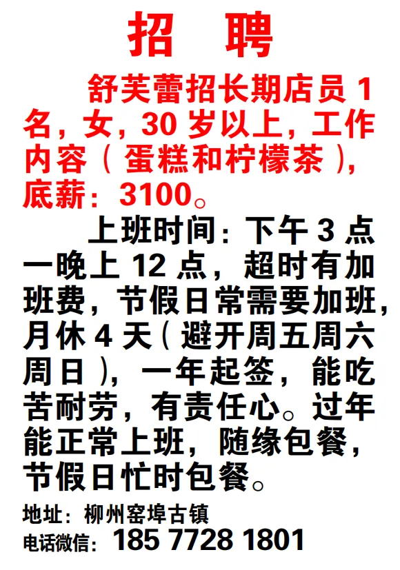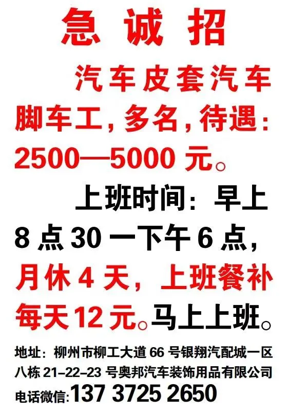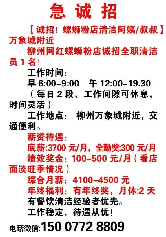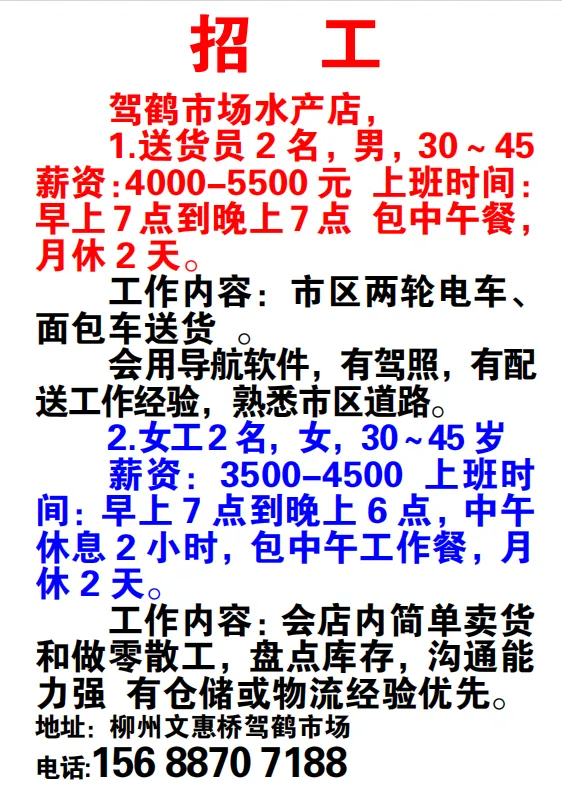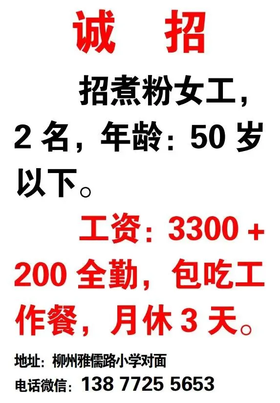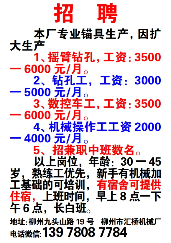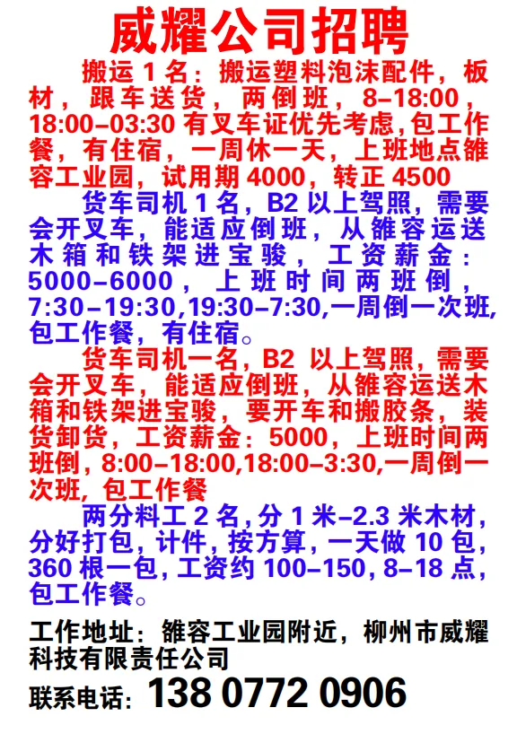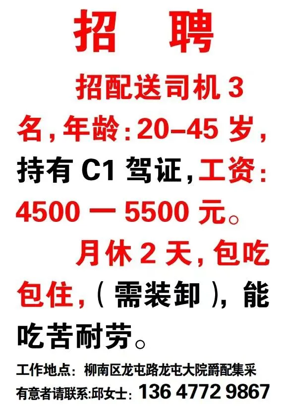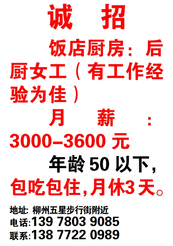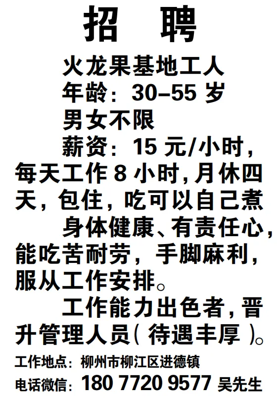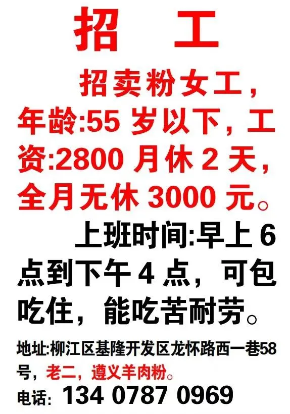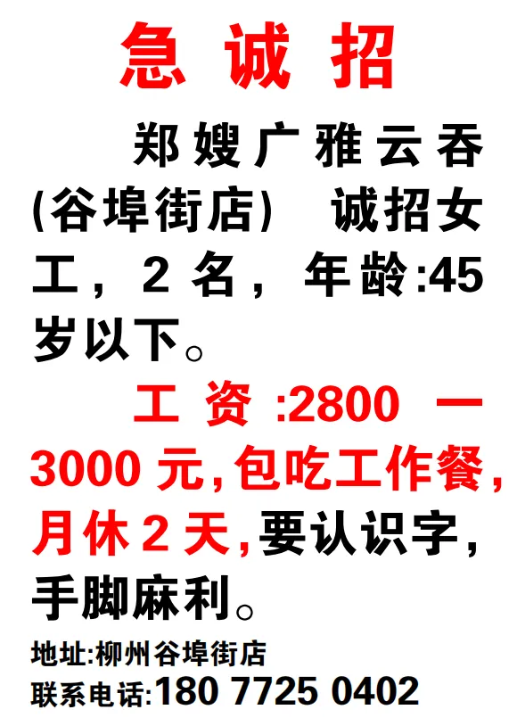 招保安20名,男53岁以下,工资:3800元,月休3天,上班12小时,固定白班、夜班,地址:静兰路、古亭山小区、柳南区基隆小区保安,电话微信:19217723269