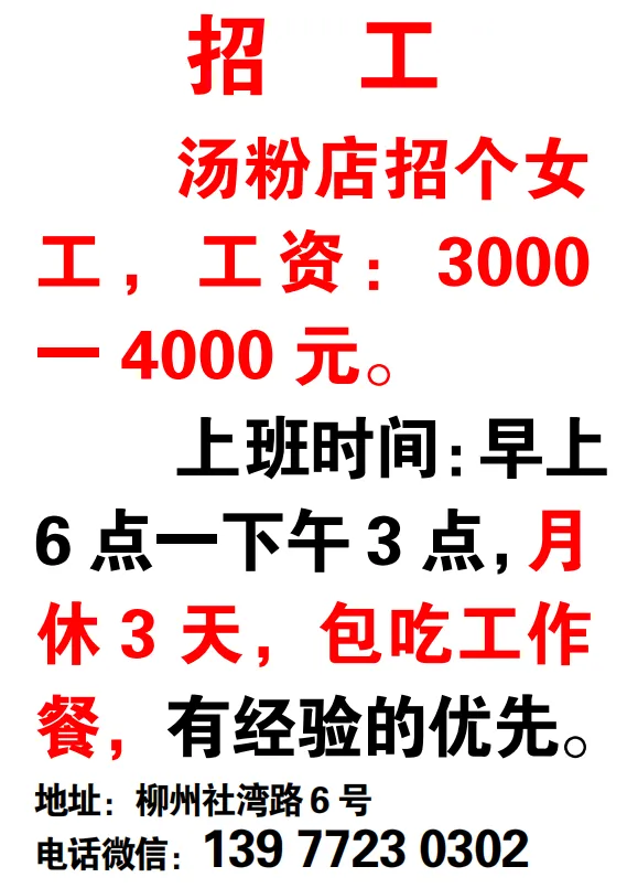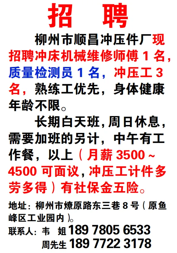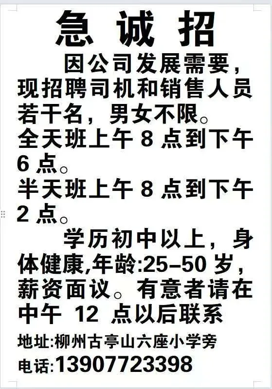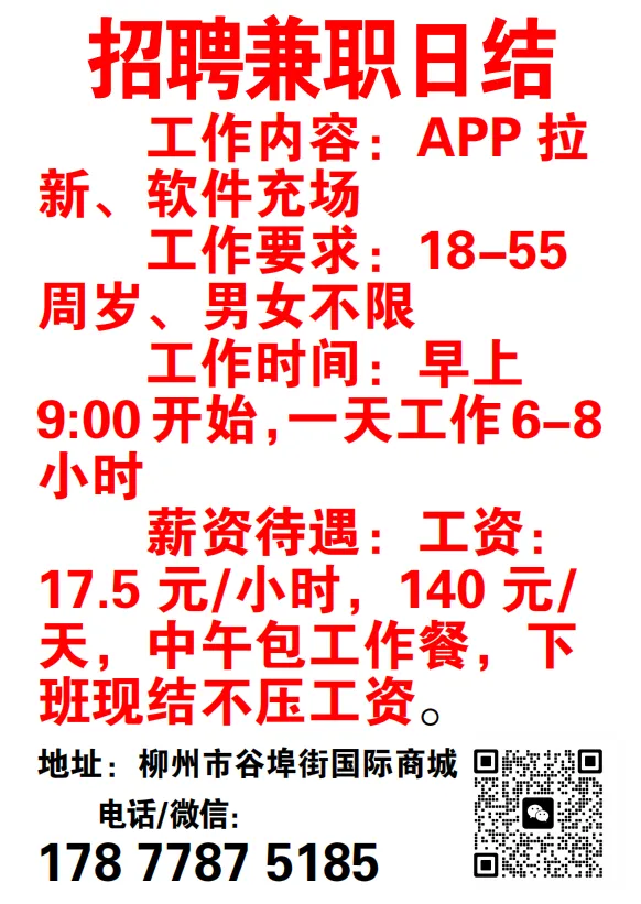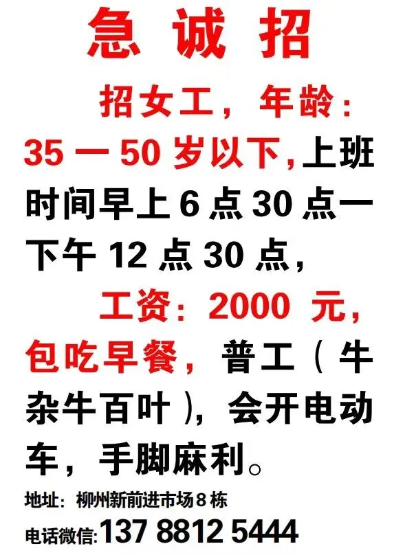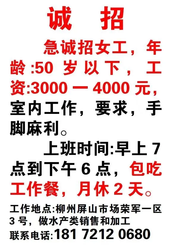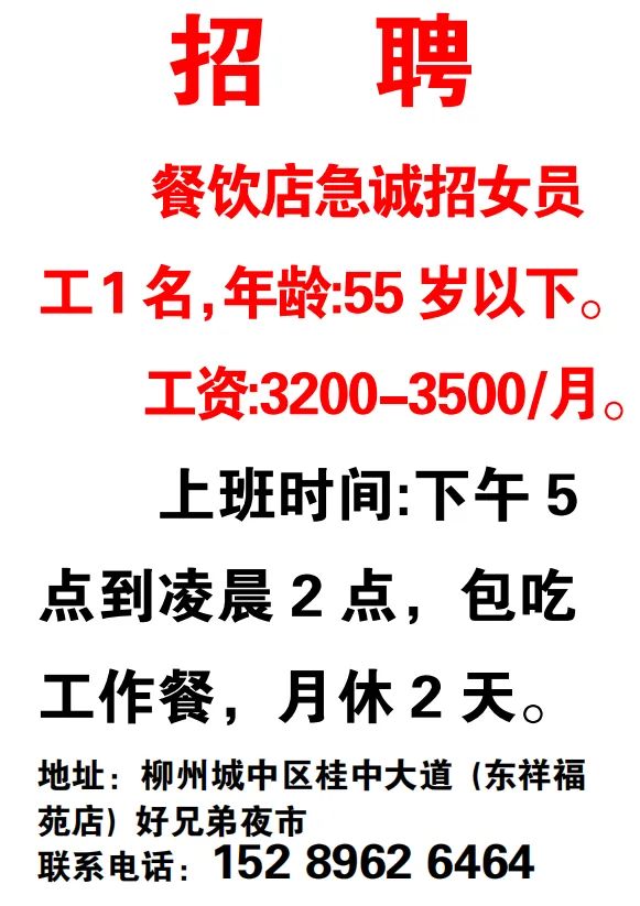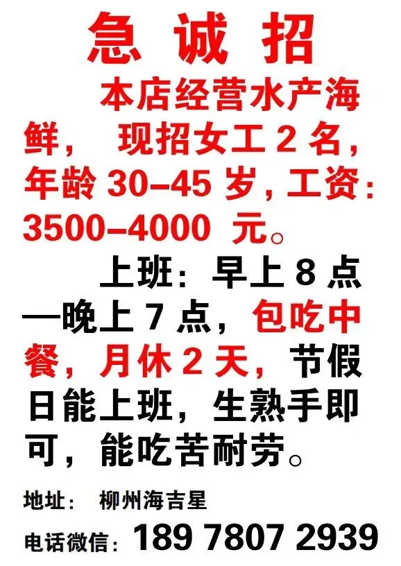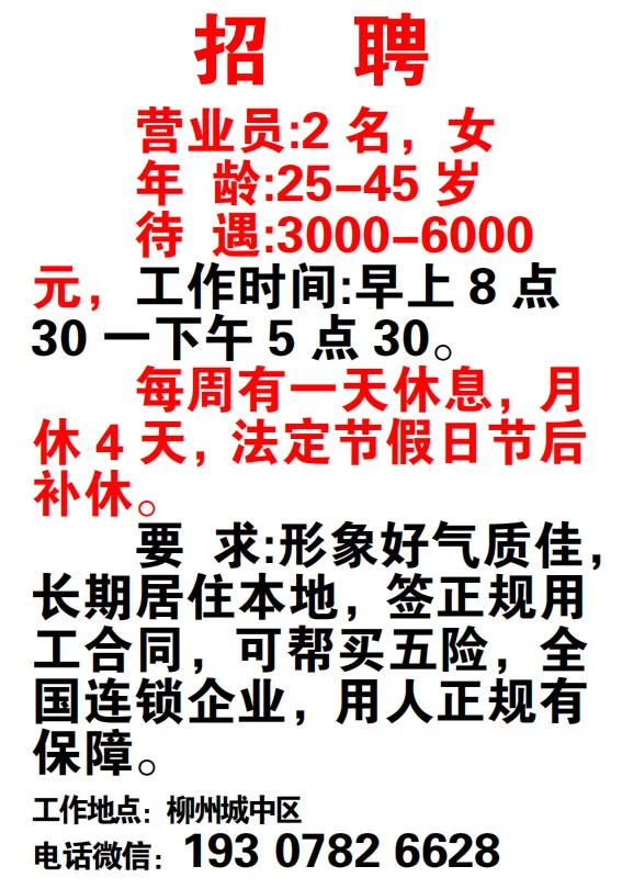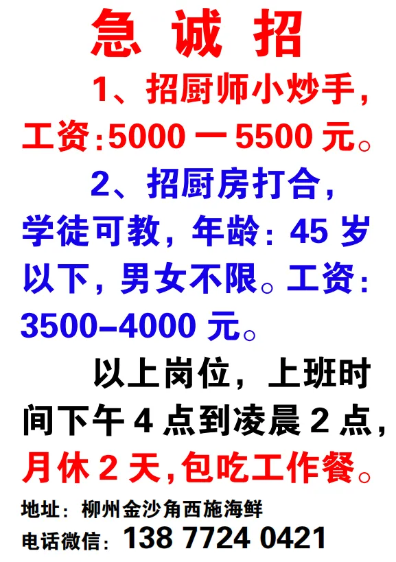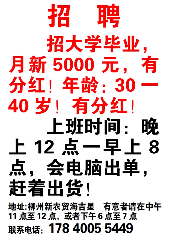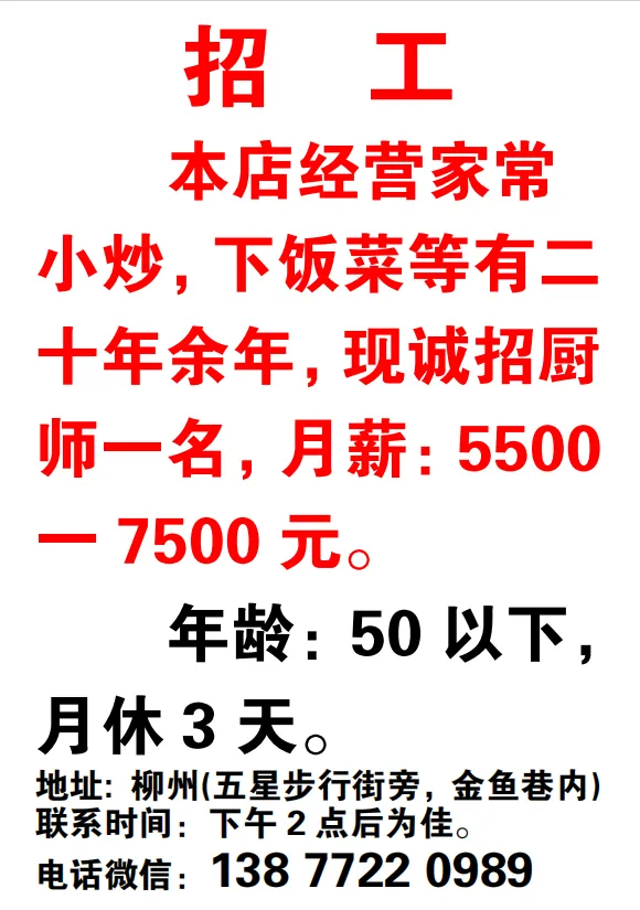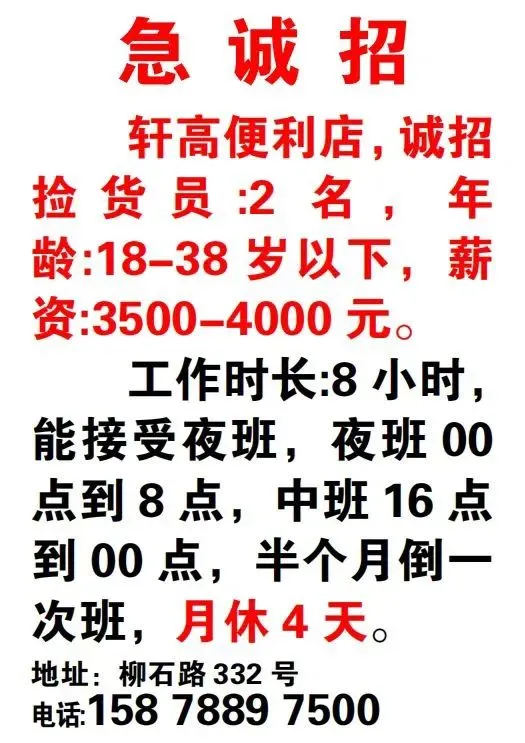 招保安20名,男53岁以下,工资:3800元,月休3天,上班12小时,固定白班、夜班,地址:静兰路、古亭山小区、柳南区基隆小区保安,电话微信:19217723269