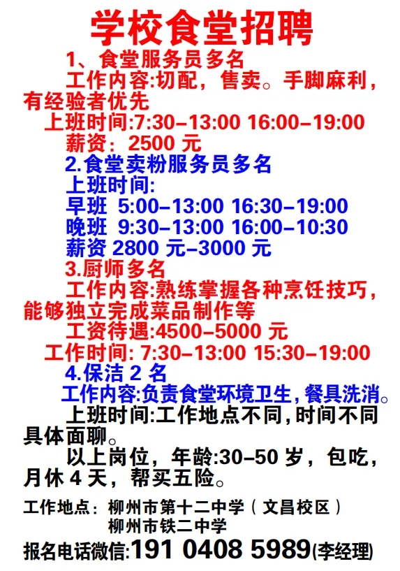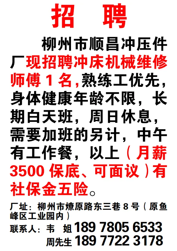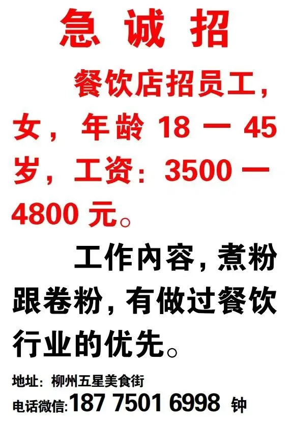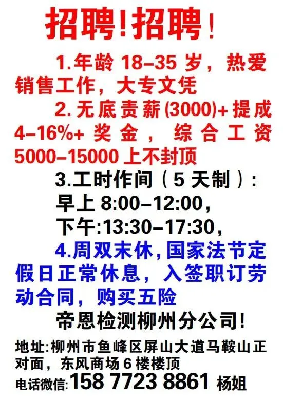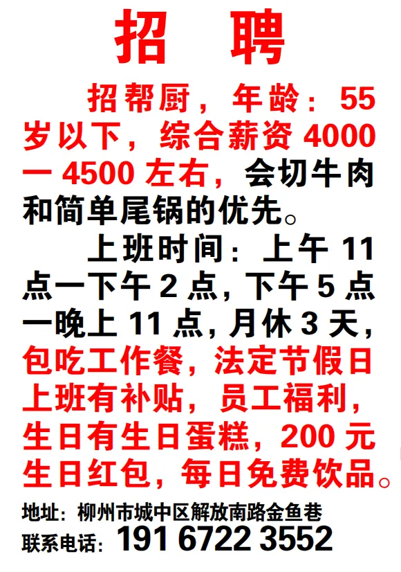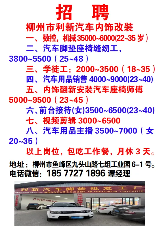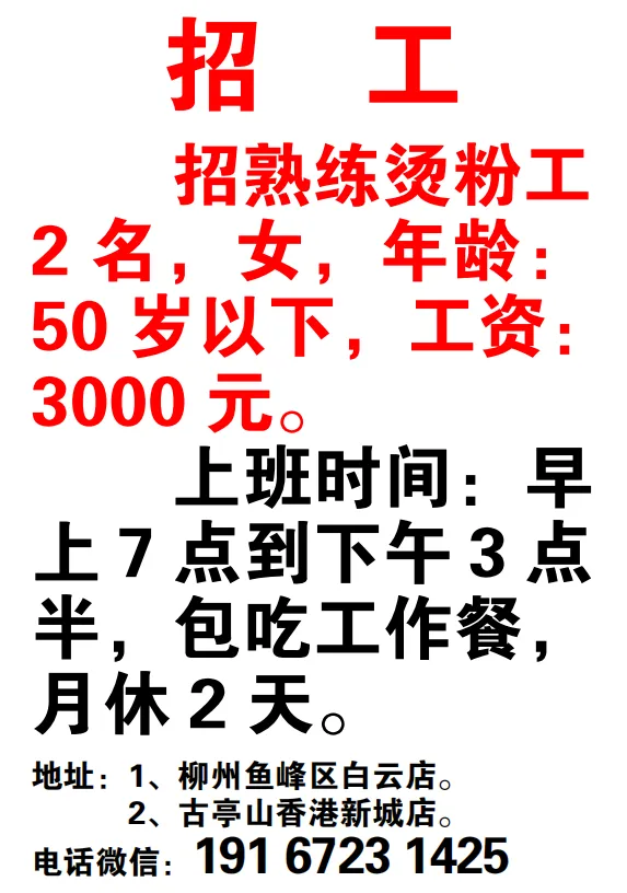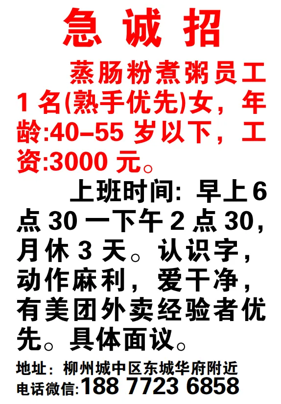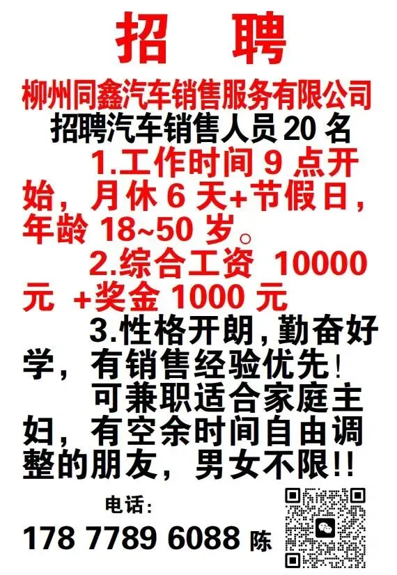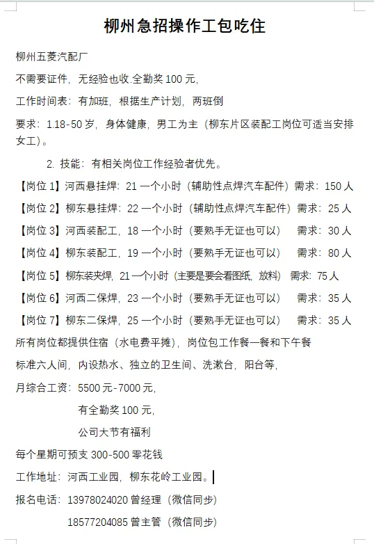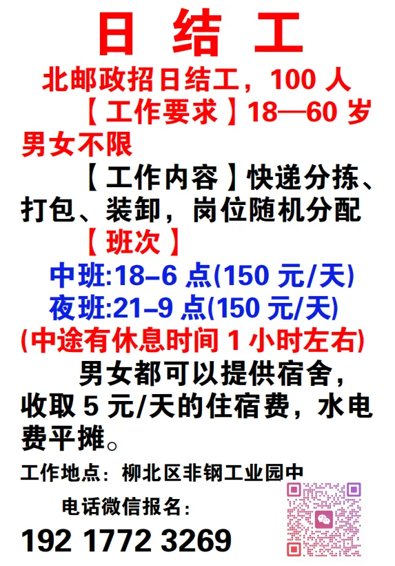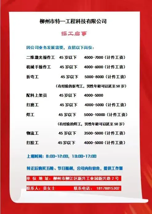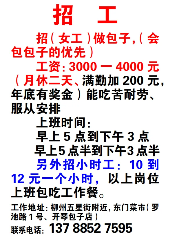 招保安20名,男53岁以下,工资:3800元,月休3天,上班12小时,固定白班、夜班,地址:静兰路、古亭山小区、柳南区基隆小区保安,电话微信:19217723269