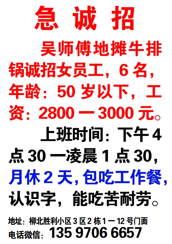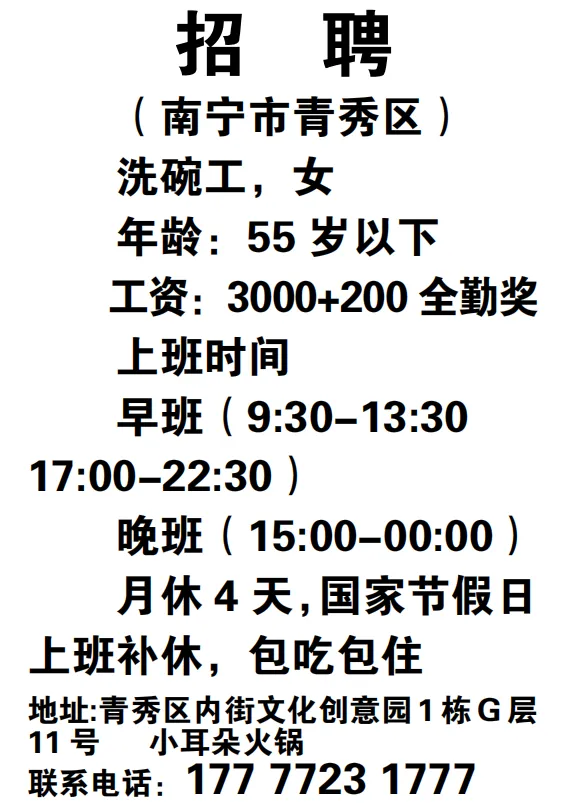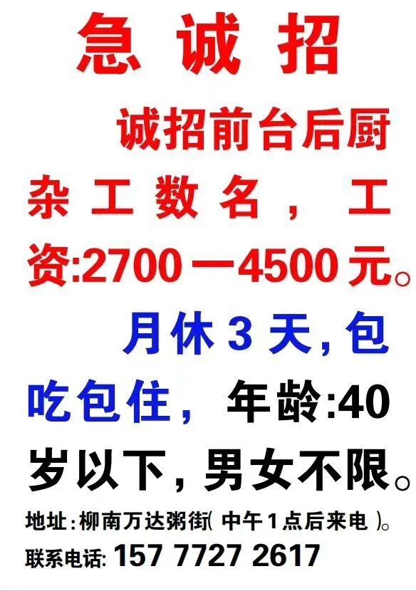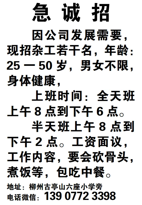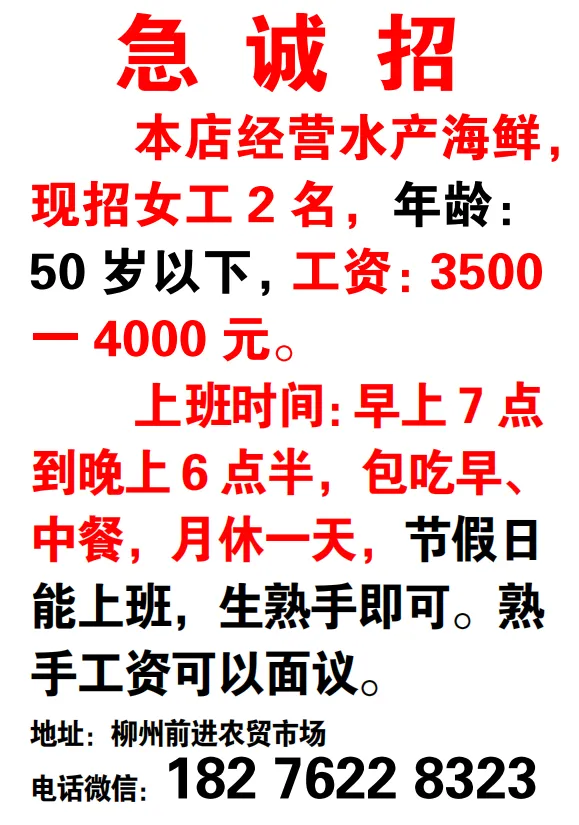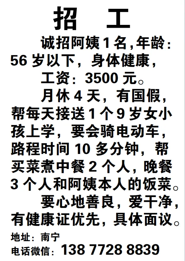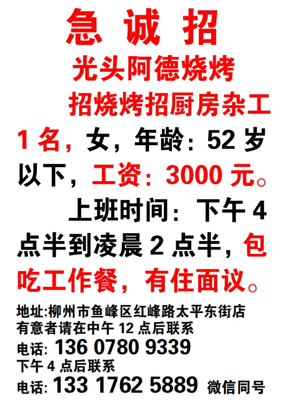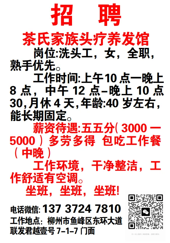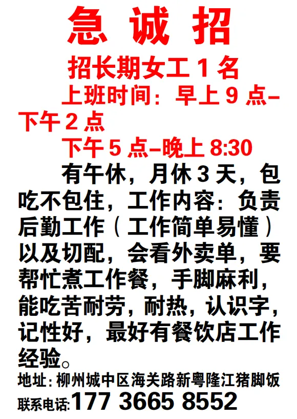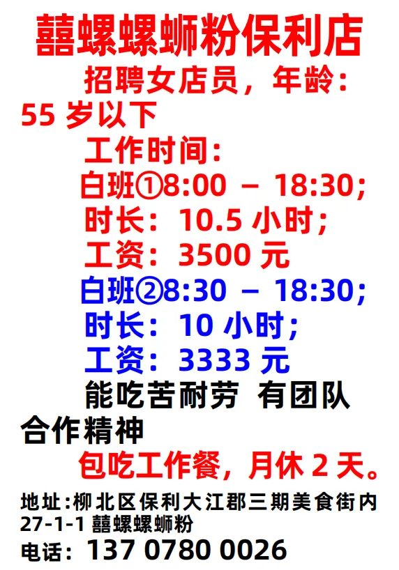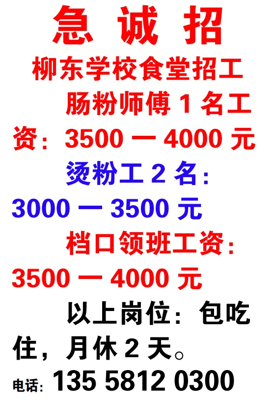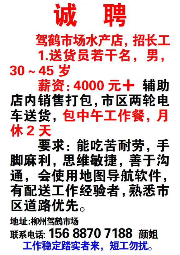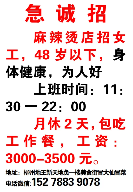 招保安20名,男53岁以下,工资:3800元,月休3天,上班12小时,固定白班、夜班,地址:静兰路、古亭山小区、柳南区基隆小区保安,电话微信:19217723269