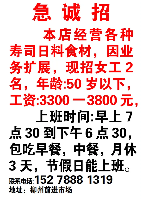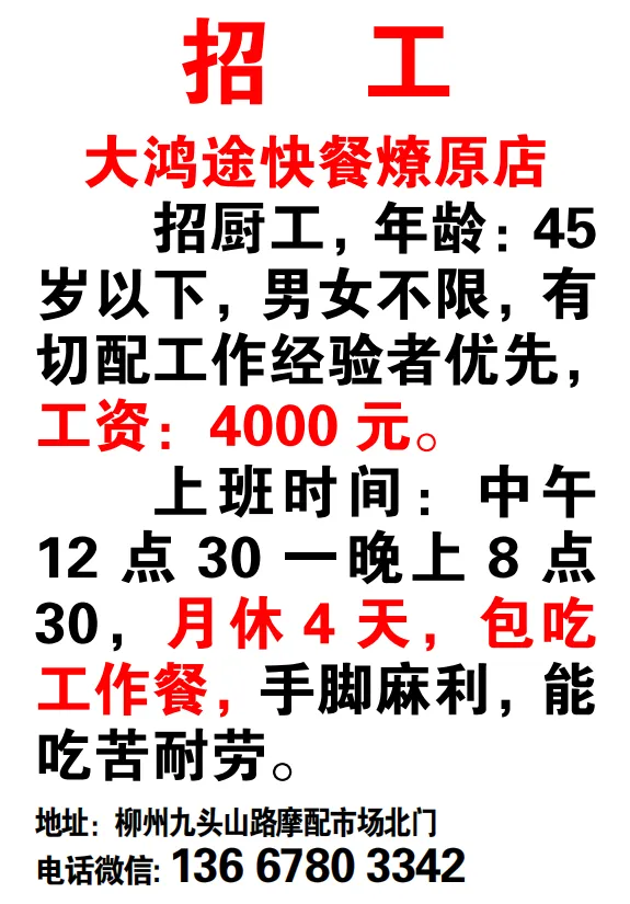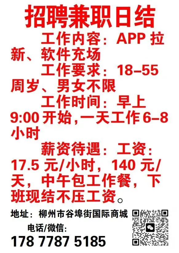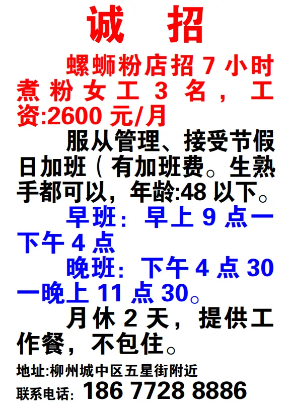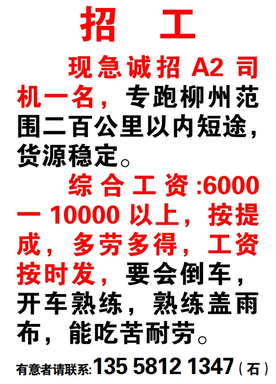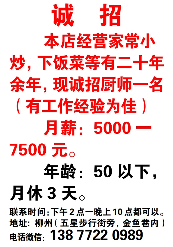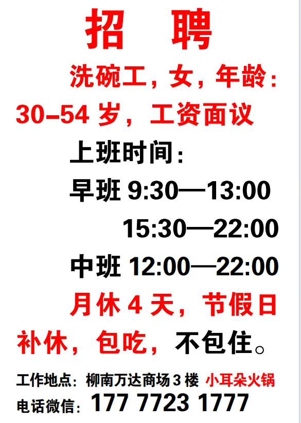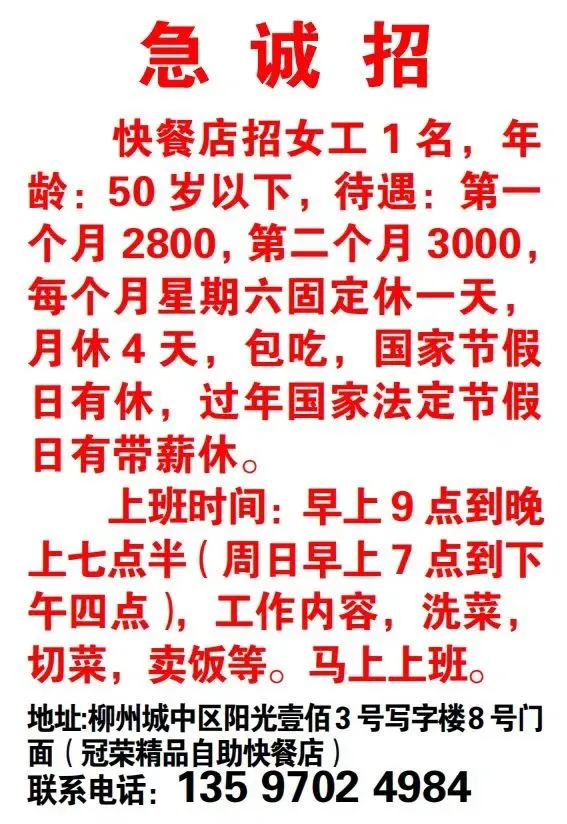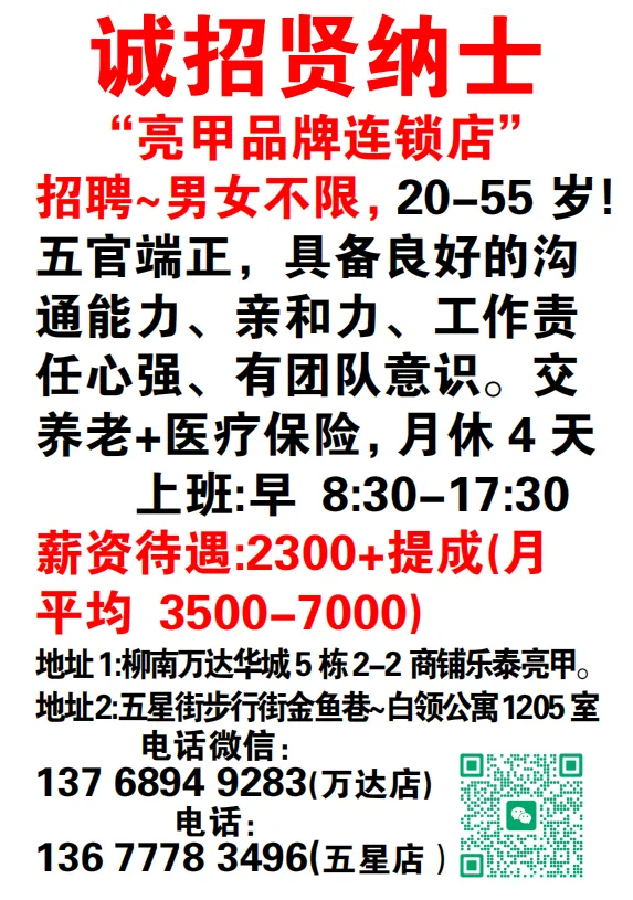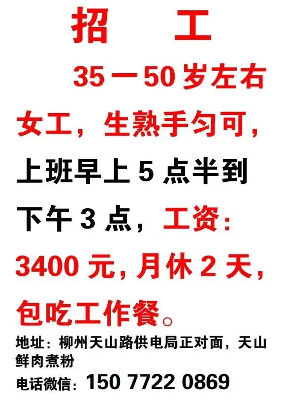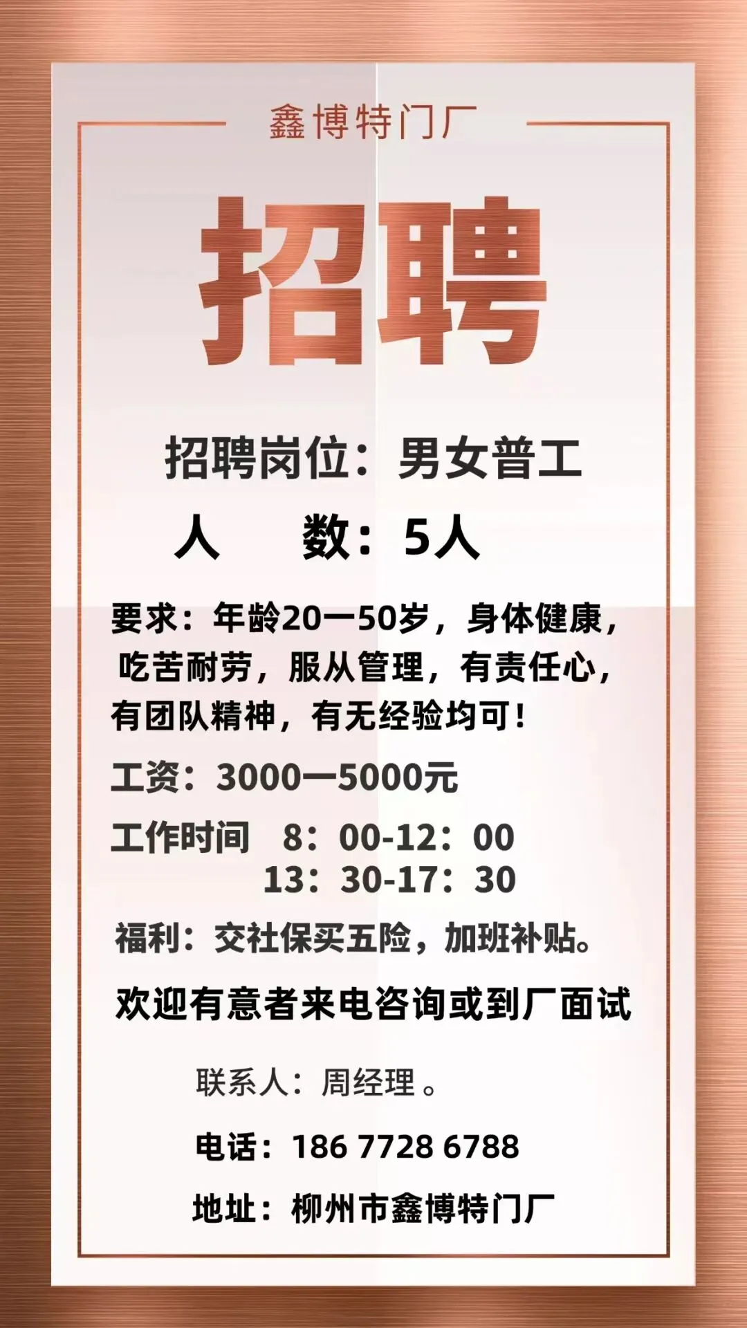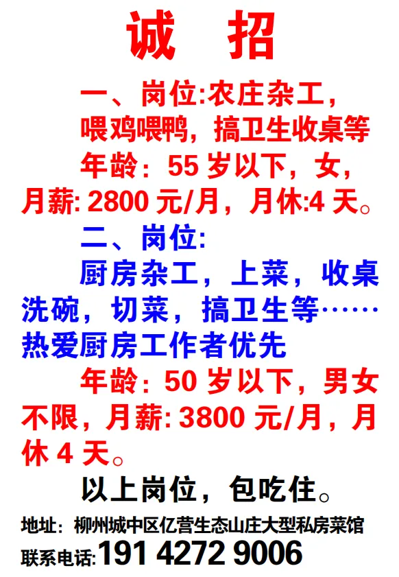 招保安20名,男53岁以下,工资:3800元,月休3天,上班12小时,固定白班、夜班,地址:静兰路、古亭山小区、柳南区基隆小区保安,电话微信:19217723269