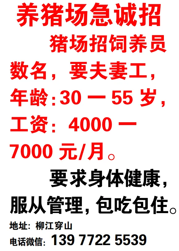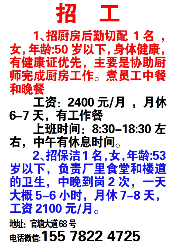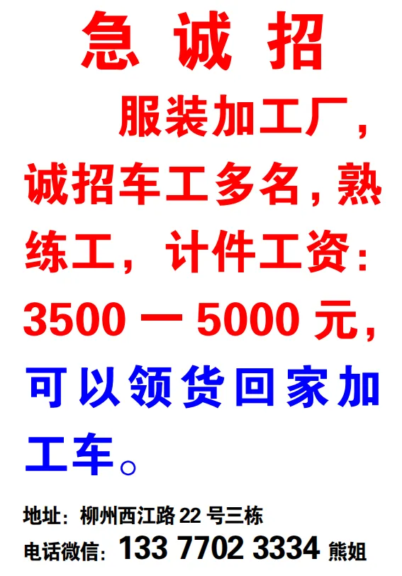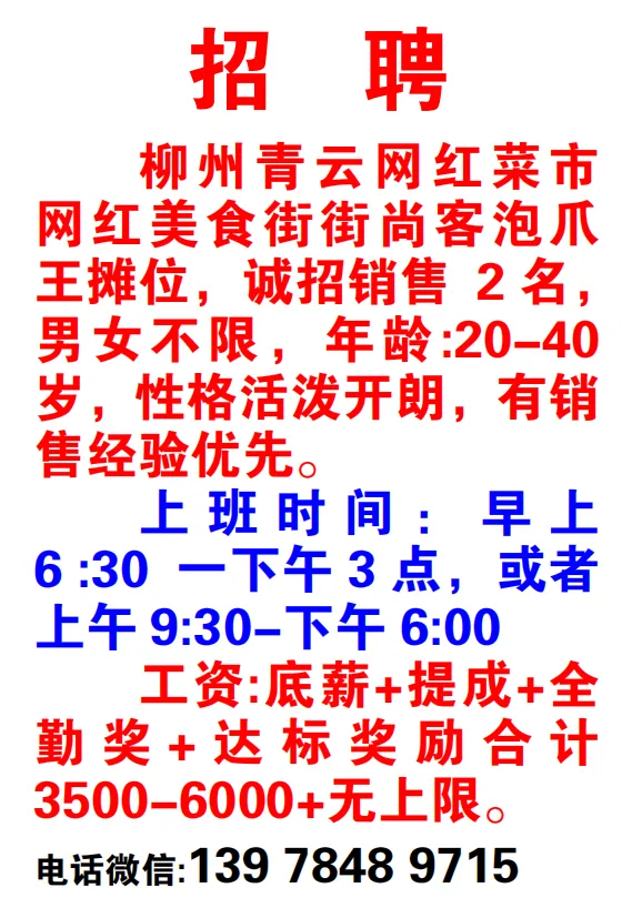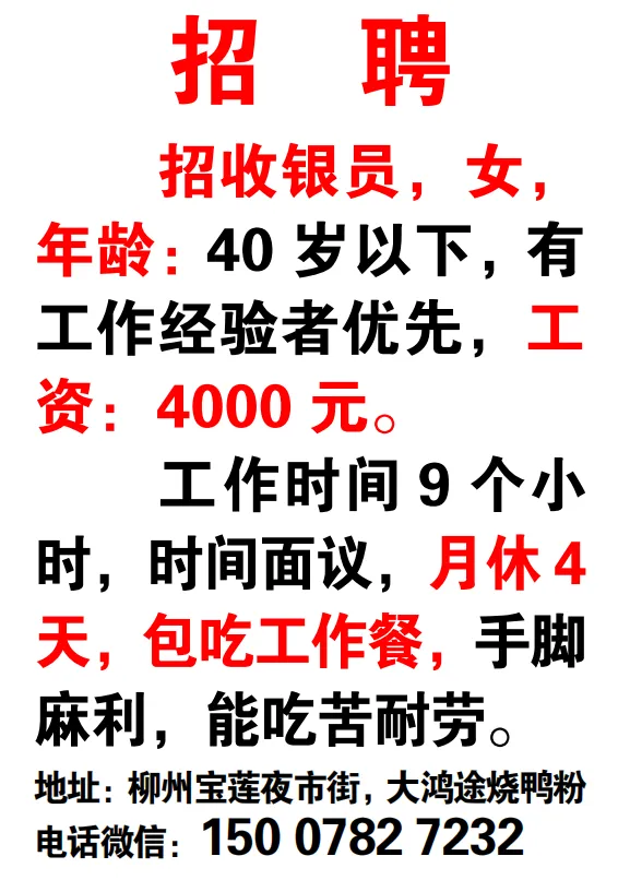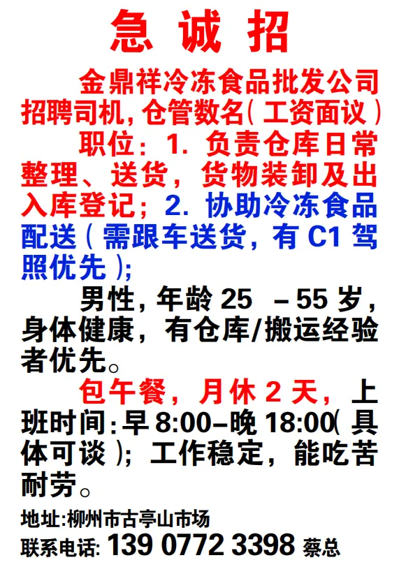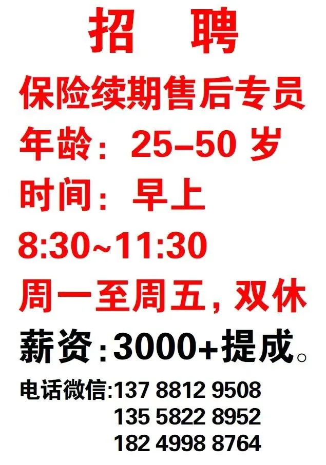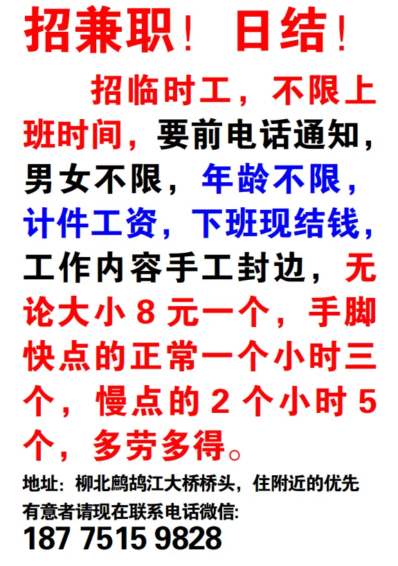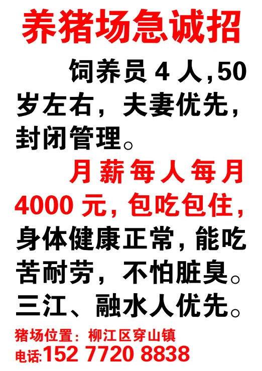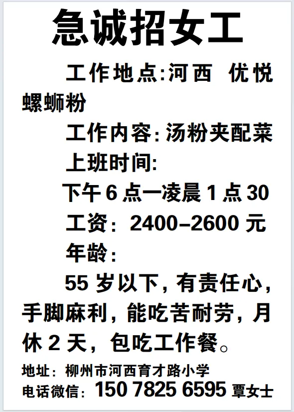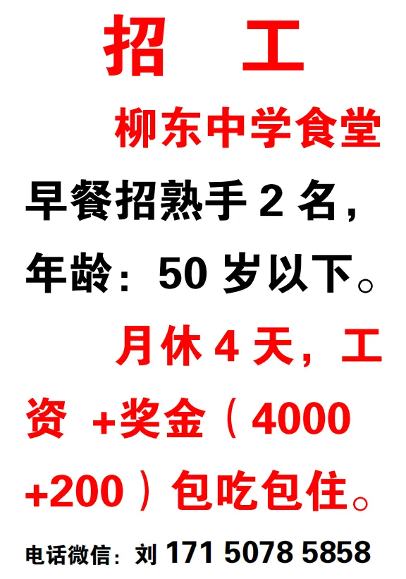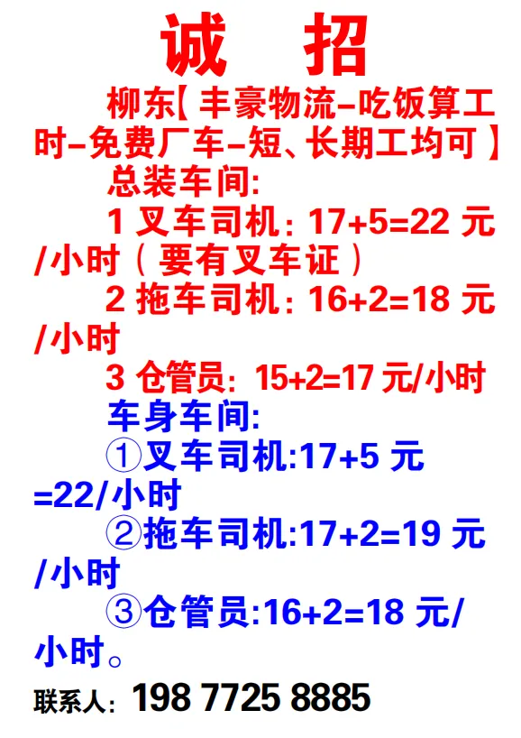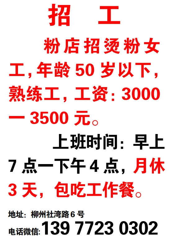 招保安20名,男53岁以下,工资:3800元,月休3天,上班12小时,固定白班、夜班,地址:静兰路、古亭山小区、柳南区基隆小区保安,电话微信:19217723269