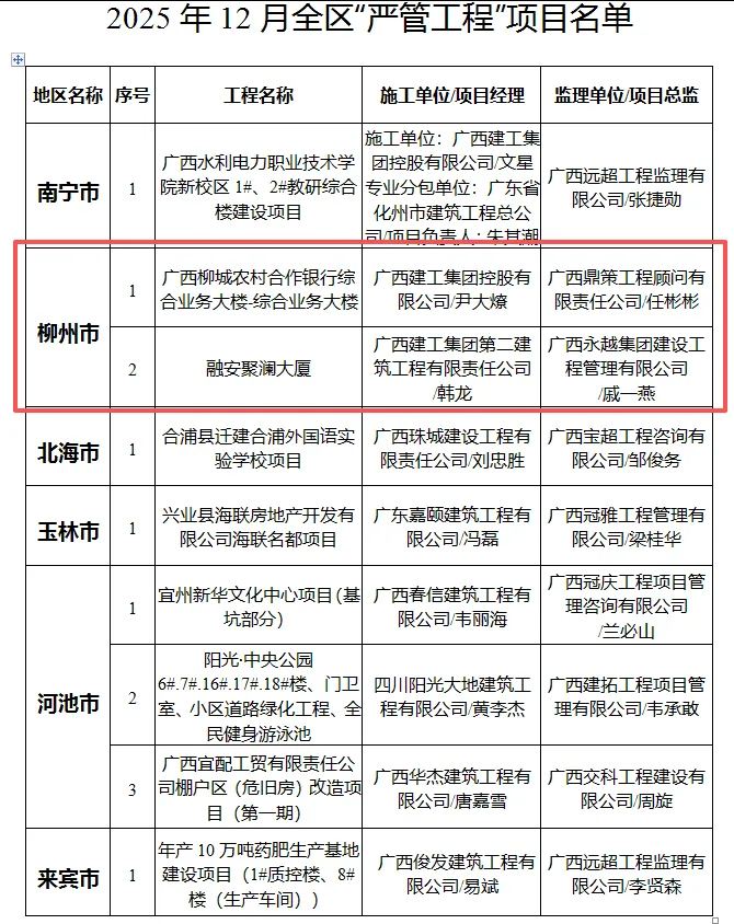据上述通报,本次共有9个项目被列入广西12月份“严管工程”名单,其中南宁市1个,柳州市2个,北海市1个,玉林市1个,河池市3个,来宾市1个。