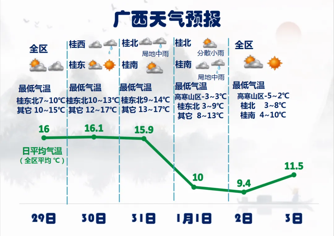 2025年12月31日晚至2026年1月1日白天,桂北、桂西阴天有小到中雨、局地大雨,其他地区阴天有小雨、局地中雨。高寒山区局地有雨夹雪、冰冻或道路结冰。最低气温:高寒山区0℃~5℃,桂东北7℃~12℃,其他地区8℃~16℃。