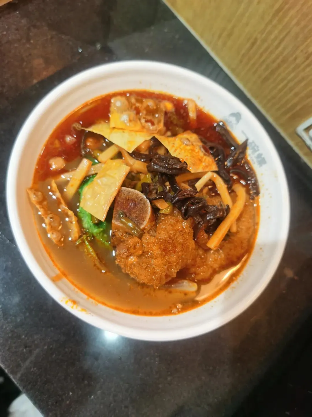 红油亮得晃眼,酸笋鲜辣够劲,腐竹吸饱汤汁酥到掉渣,木耳脆嫩、花生焦香,每一口都是暴击!
