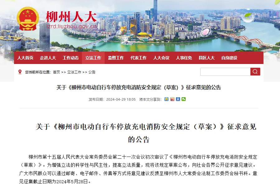 电动车“进楼入户”“飞线充电”等违规停放、充电问题,隐患重重。4月28日至29日,柳州市第十五届人大常委会第二十一次会议召开,首次审议了《柳州市电动自行车停放充电消防安全规定(草案)》。4月29日,“柳州人大”网站发布了相关公告,对草案征求意见。