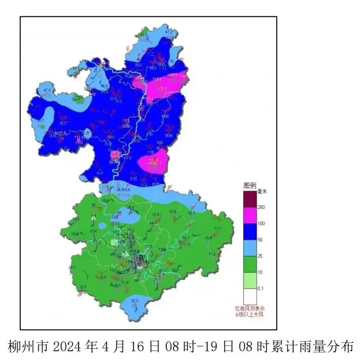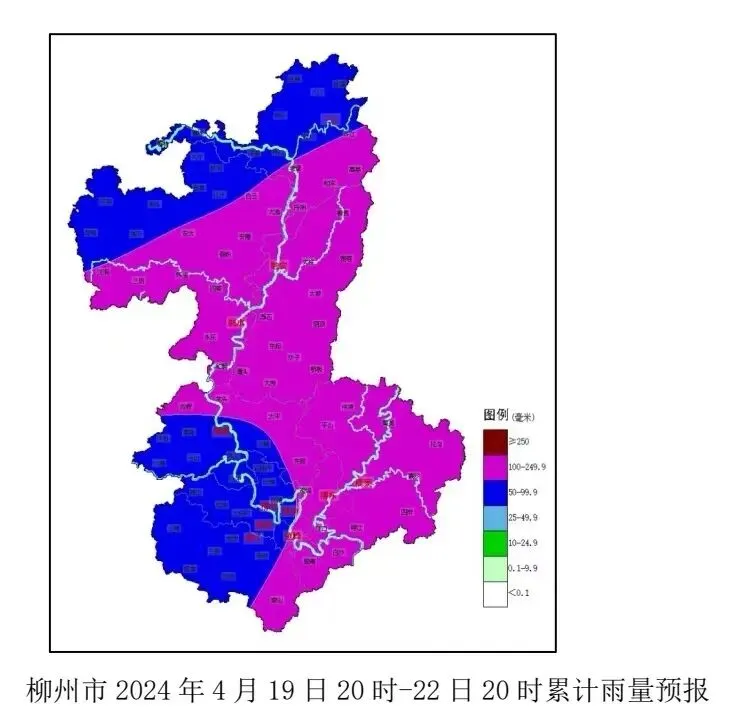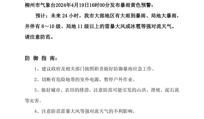 4月19日晚到明天,降雨范围扩大、强度增强。全市有大雨到暴雨,局地大暴雨,并伴有 8~10 级、局地 11 级以上的雷暴大风或冰雹等强对流天气。最有可能出现暴雨到大暴雨的乡镇有:三江的斗江、丹洲、高基、老堡、和平等,融安各乡镇,融水的融水、白云、香粉、安太、安陲、汪洞、四荣、大浪、三防、怀宝、和睦、永乐等,柳城的龙头、太平、古砦等,鹿寨的中渡、黄冕、平山等。