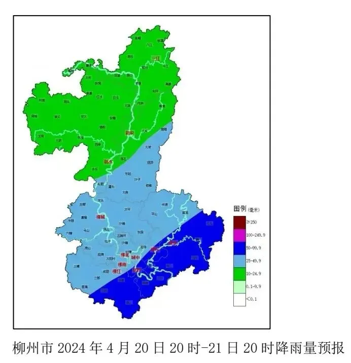 4月21日,全市有中到大雨,局地暴雨到大暴雨,并伴有短时雷暴大风、冰雹等强对流天气。最有可能出现暴雨到大暴雨的乡镇有:鹿寨的鹿寨、拉沟、江口、导江、四排、寨沙等,柳江的进德、百朋、穿山等,鱼峰区各地,柳东新区的雒容等。