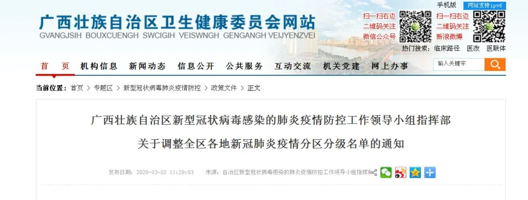 3月2日,自治区卫生健康委员会网站发布消息,根据《广西新冠肺炎疫情分区分级精准防控方案》有关要求,自治区新冠肺炎疫情防控工作领导小组指挥部结合当前疫情实际,决定对全区新冠肺炎疫情分区分级县(市、区)名单进行调整。