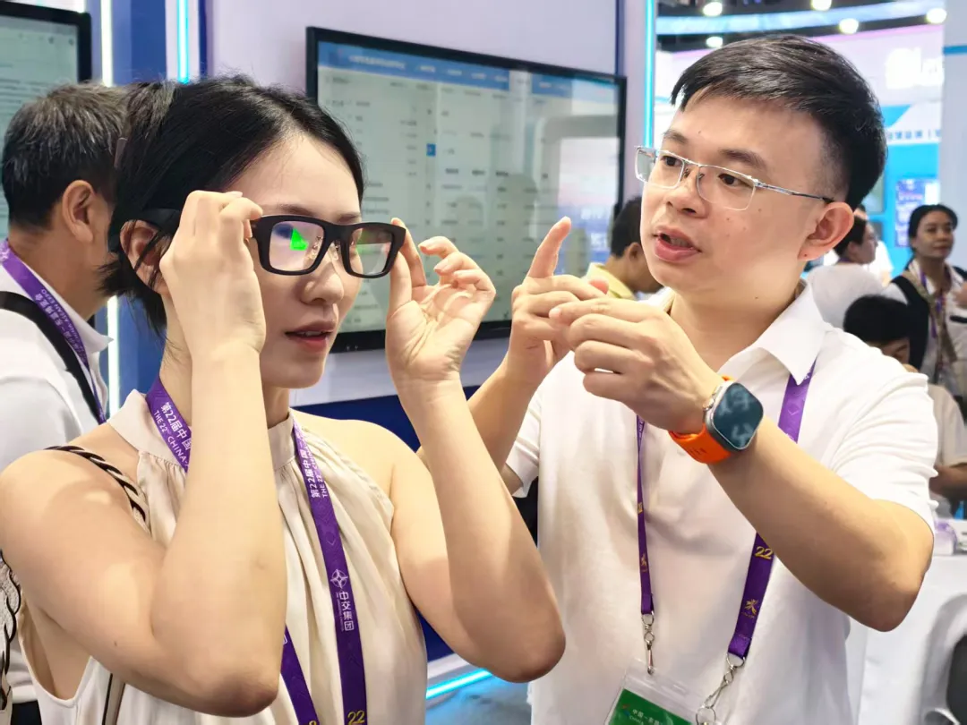 在第22届中国—东盟博览会AI专馆,观众试戴AI智能眼镜。记者 宋延康 摄