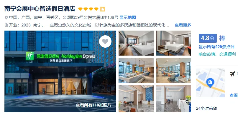 南宁会展中心智选假日酒店(网评4钻,服务评分4.8分前台热情、交通便利)(或同级酒店)酒店地理位置优越,毗邻南宁民歌湖景区、青秀山风景区,省去您的舟车劳顿。出行交通便捷,可步行前往地铁3号线琅西站A口。