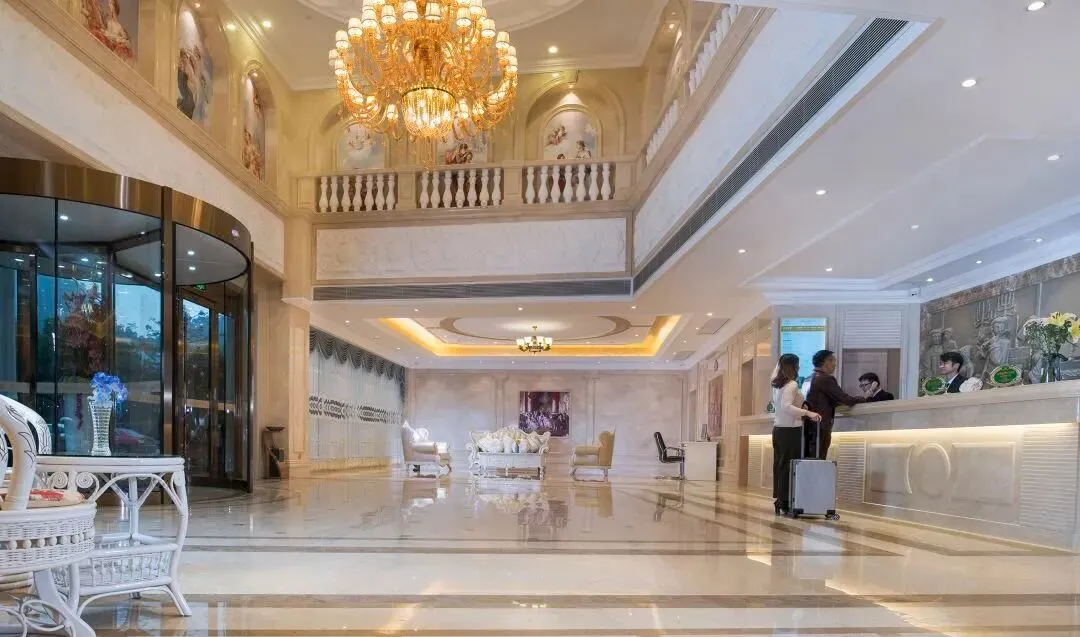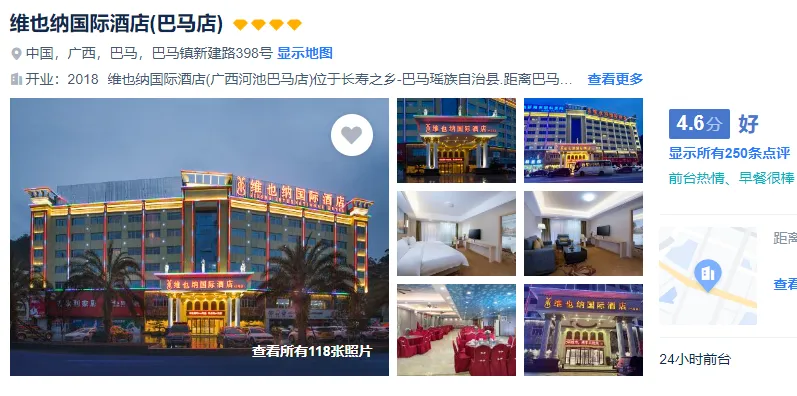 维也纳国际酒店(巴马店)(网评4钻,服务评分4.6分前台热情、早餐很棒)位于长寿之乡,距离巴马汽车总站步行2分钟.酒店背山面水,环境清幽,门前即是音乐喷泉巴马河。