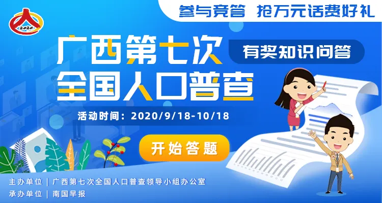 2020年9月18日~10月18日,广西第七次全国人口普查领导小组办公室邀请你来参与“第七次全国人口普查有奖知识问答”游戏。