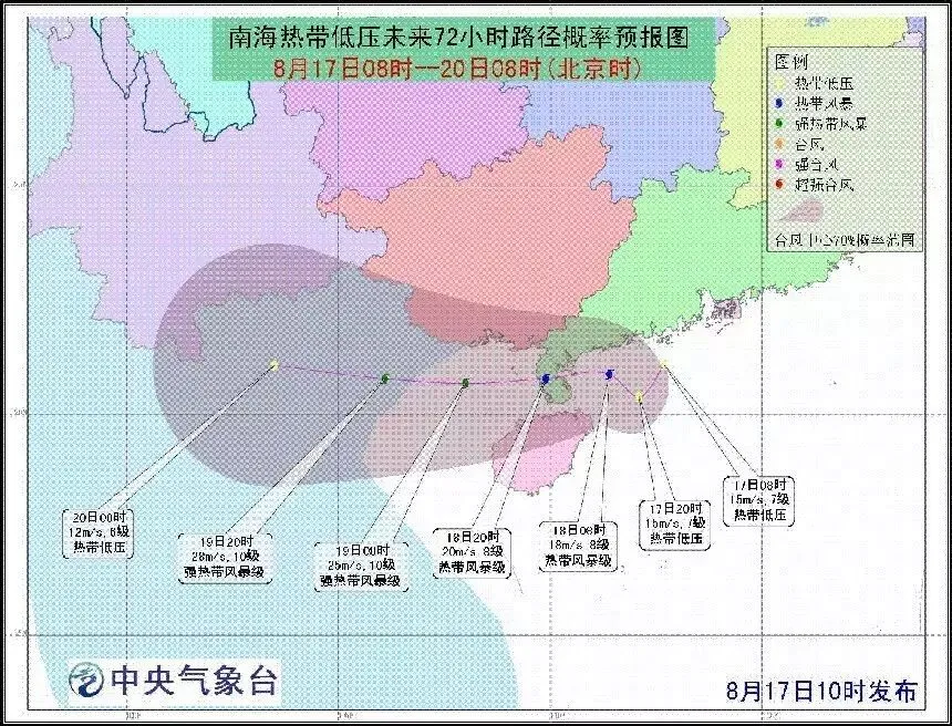 央视网消息:中央气象台监测显示,南海热带低压今天上午在南海北部海面上生成,预计它将于今天夜间至明天上午加强为今年第8号台风(热带风暴级)。18日下午将登陆广东雷州半岛,登陆时强度为热带风暴级(18~23米/秒,8~9级)。18日傍晚前后移入北部湾,强度继续加强,最强可达强热带风暴级(25~30米/秒,10~11级)。19日下午将在越南北部沿海再次登陆,之后强度逐渐减弱。