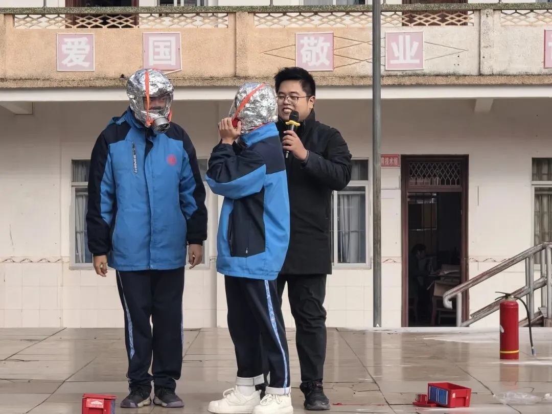疏散环节结束后,政教处干事黄良正现场详细讲解并示范了干粉灭火器的正确操作步骤——“提、拔、握、压”,以及消防过滤式自救呼吸器的快速佩戴方法。为了让知识转化为技能,现场邀请了多名学生代表上前进行实操体验,亲身体验了灭火器的操作,掌握了扑灭初起火灾的基本技能。