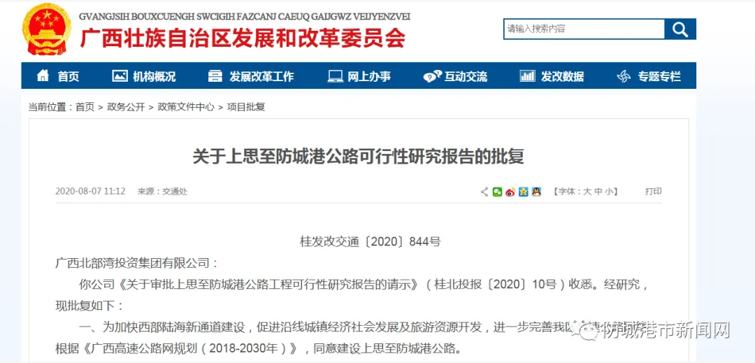今年8月6日,自治区发改委批复《上思至防城港公路可行性研究报告》,同意建设上思至防城港公路,公路等级为高速公路;10月27日,上思至防城港公路两阶段初步设计获自治区交通运输厅批复,标志着项目建设又向前迈进了一步。