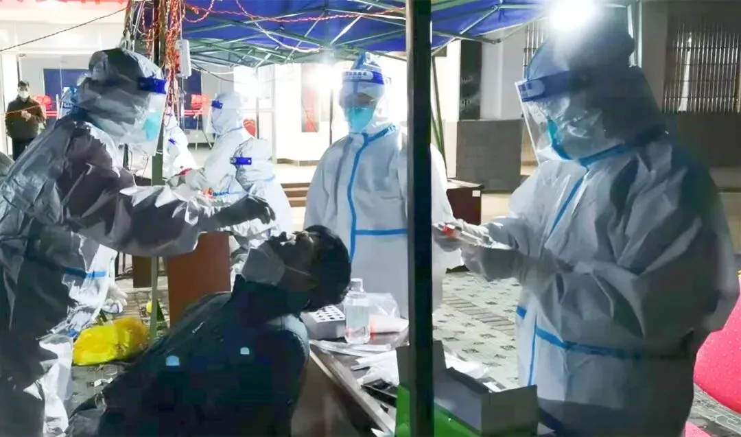 流调队员卢婵,韦爱竟,黄苑芸同时参与当地核酸采样工作。(韦凤琴 供图)