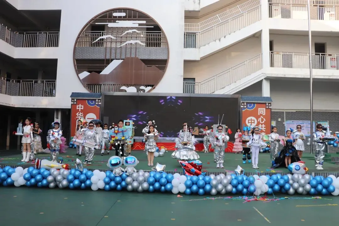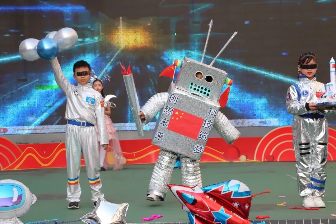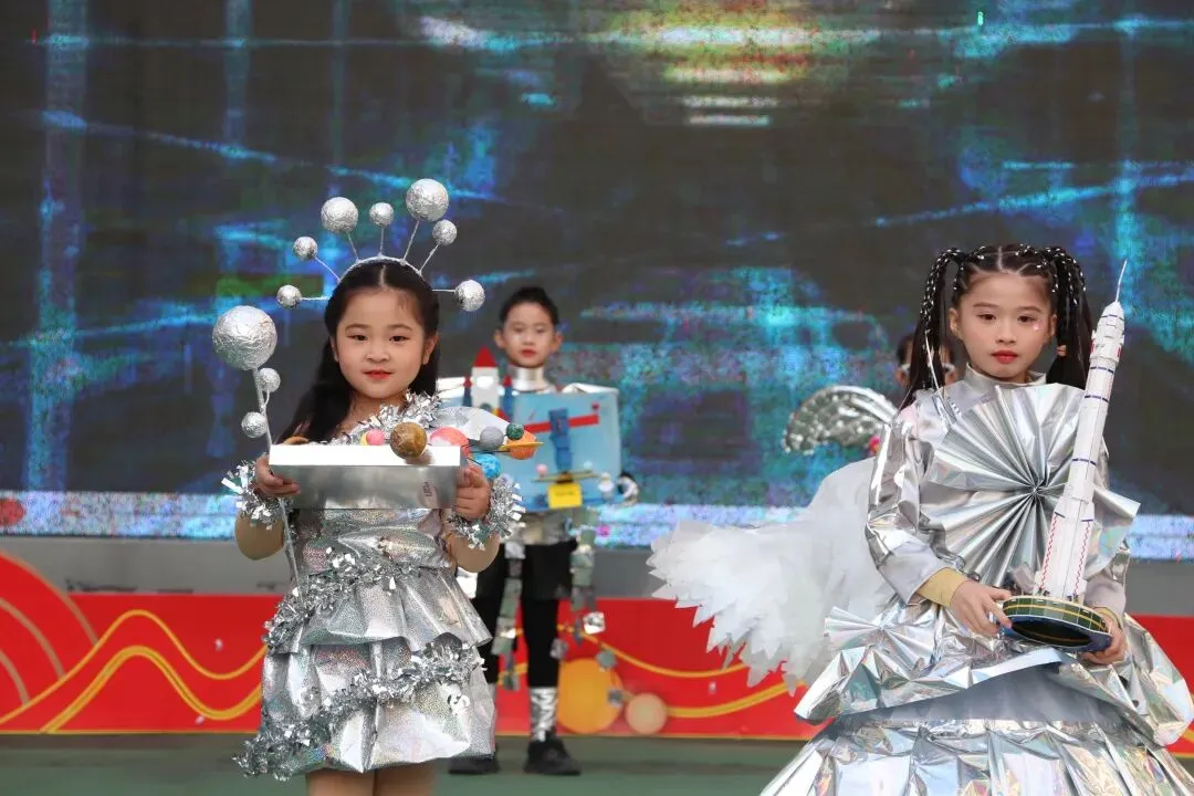 随后进入最受期待的“我与未来”科技秀场环节。各班学生代表化身“科技小使者”,身着创意科技主题服装,拿着和家长一起制作的科技展品,自信满满地走上台进行展示。这些作品既有对未来生活的奇思妙想,也有对科技原理的生动呈现,充分展现了窑小学子天马行空的想象力与扎实的科学素养。