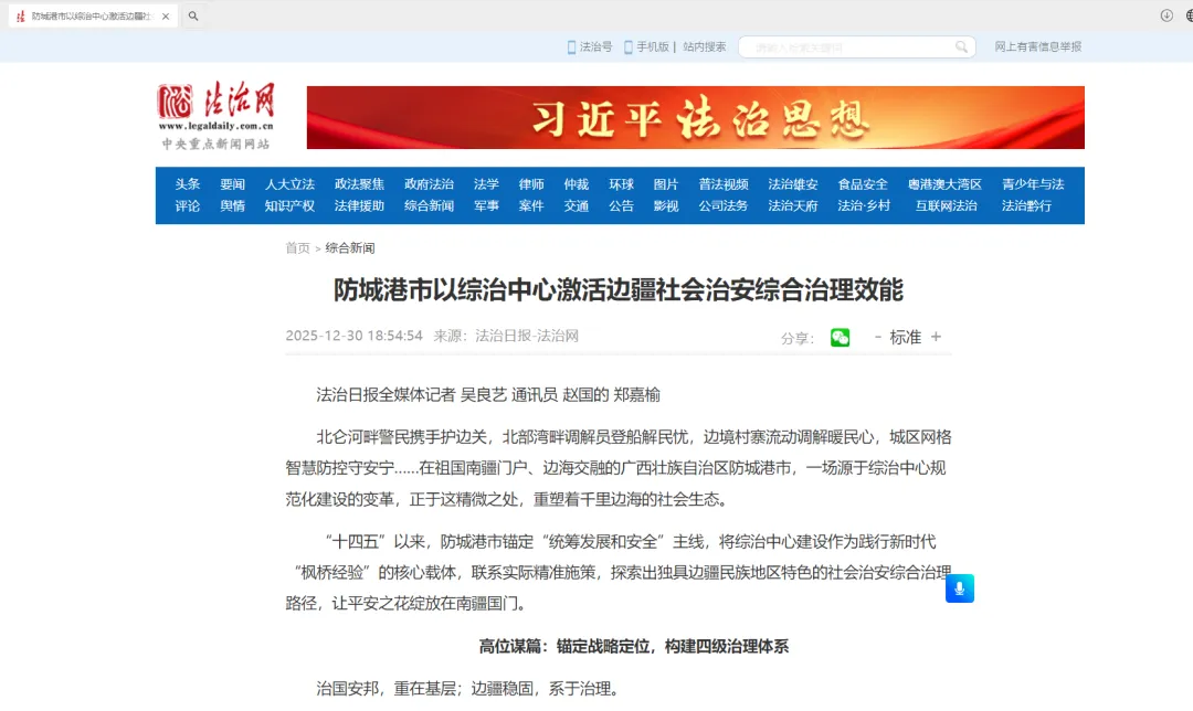 北仑河畔警民携手护边关,北部湾畔调解员登船解民忧,边境村寨流动调解暖民心,城区网格智慧防控守安宁……在祖国南疆门户、边海交融的广西壮族自治区防城港市,一场源于综治中心规范化建设的变革,正于这精微之处,重塑着千里边海的社会生态。