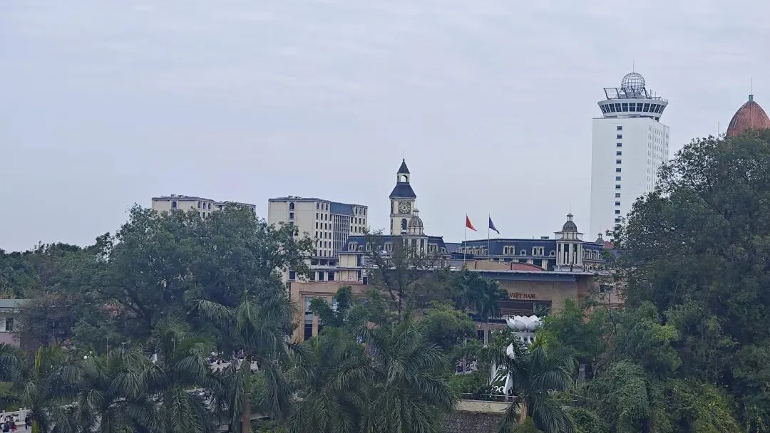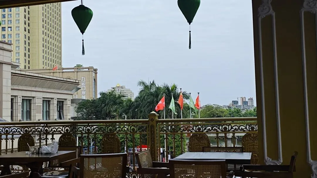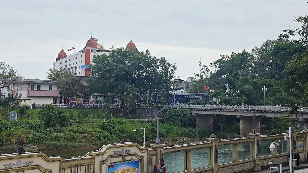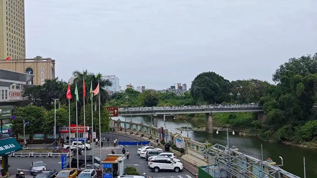登高至西贡咖啡三楼国门观景台,无需消费亦可静坐凭栏,北仑河对岸的越南芒街清晰可辨,相较于万众国际批发市场五楼的朦胧远眺,此处更添几分边境相望的真切。