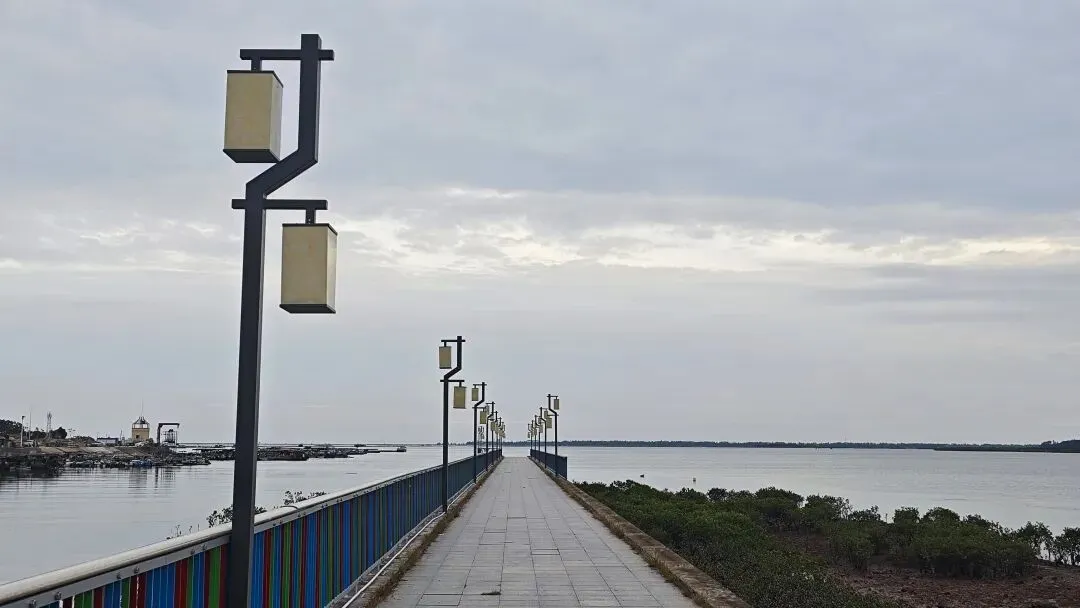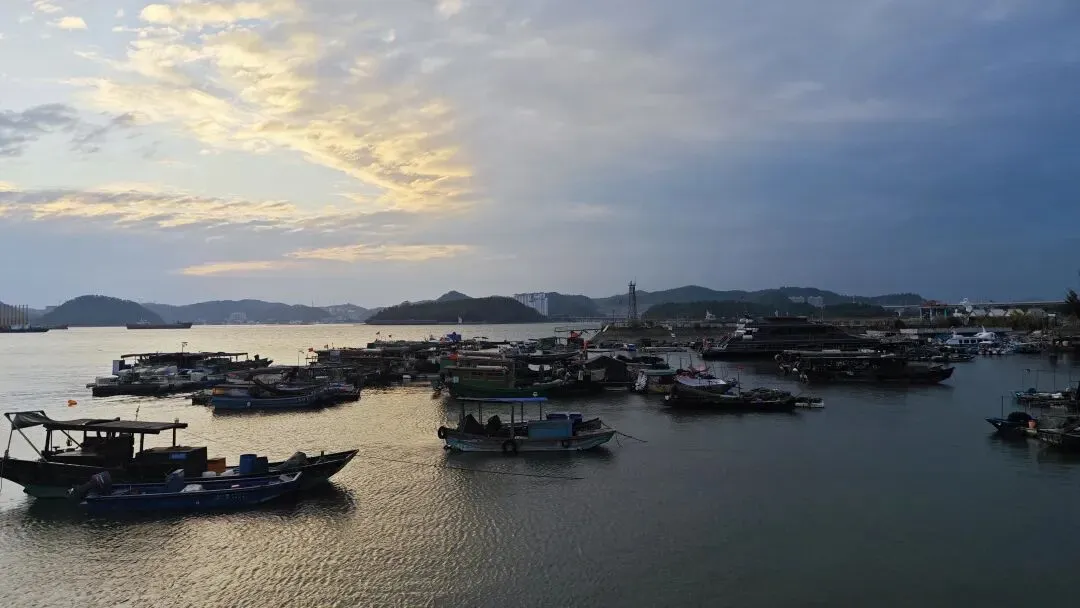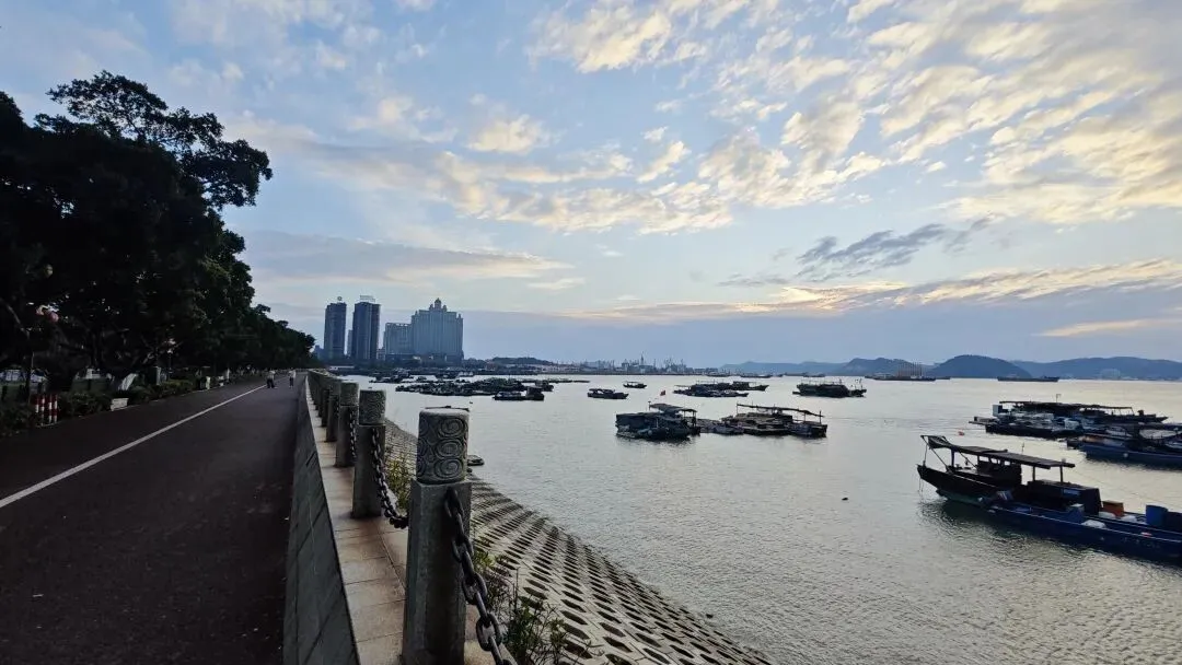 滨海道路旁的路灯渐次亮起,与海面的落日倒影连成一片,海风卷着咸湿的气息拂过,远处的渔船在金红的暮色里只剩剪影,光影交织间,边境海港的温柔与壮阔尽数显现。