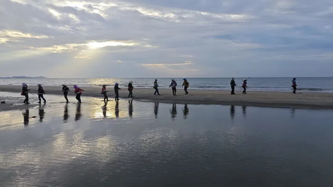 金色沙滩之上,渔民们踏着晨露集体拉网,吆喝声伴着海浪声,勾勒出最鲜活的京族渔家画卷。