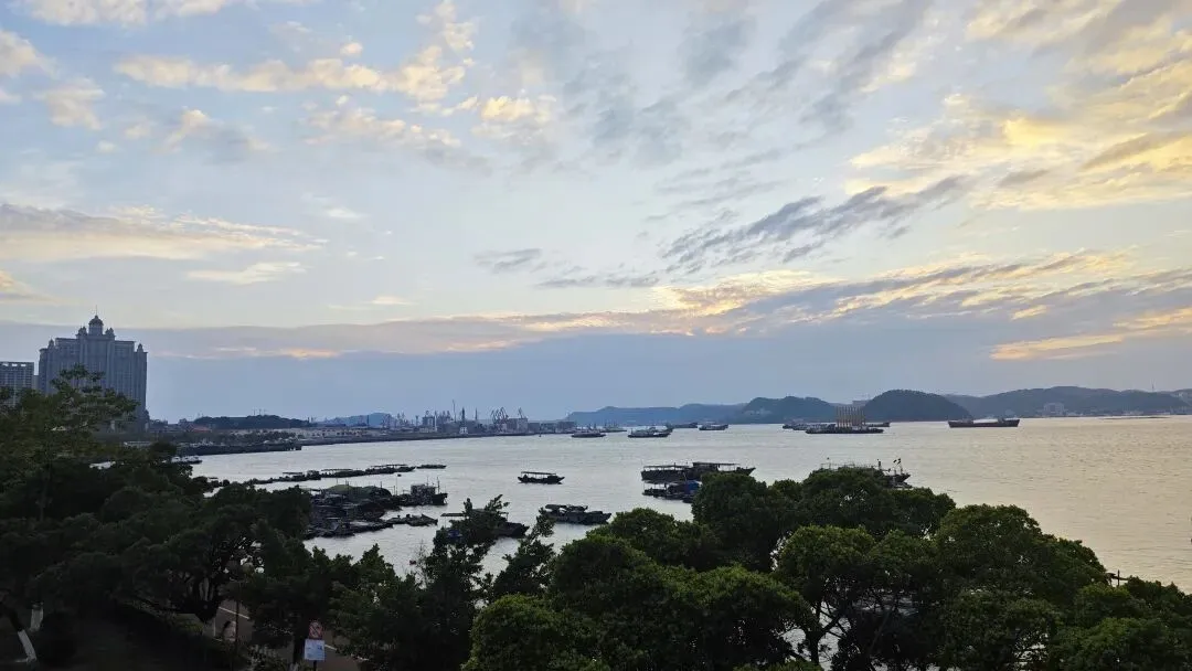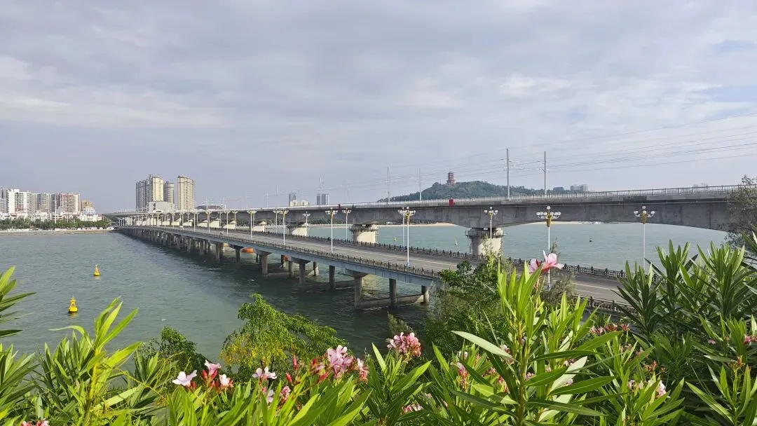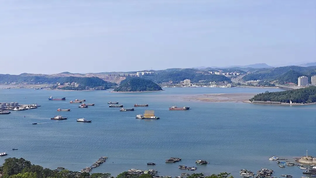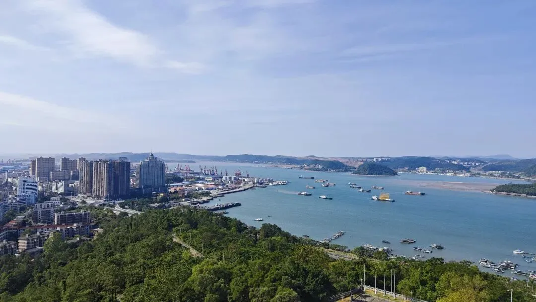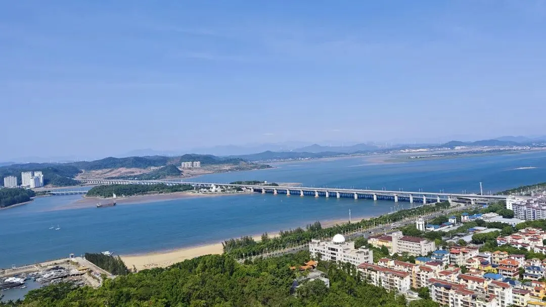 西湾海域的渔船如散落的星子,跨海大桥似银龙横卧海面,城市楼宇在山海间错落,仙人山的葱郁林木与海岸的碧蓝波光相映,远处的江山半岛在薄雾中若隐若现,边境烟火、海防历史、滨海风光在此交织汇聚,万般情愫涌上心头。