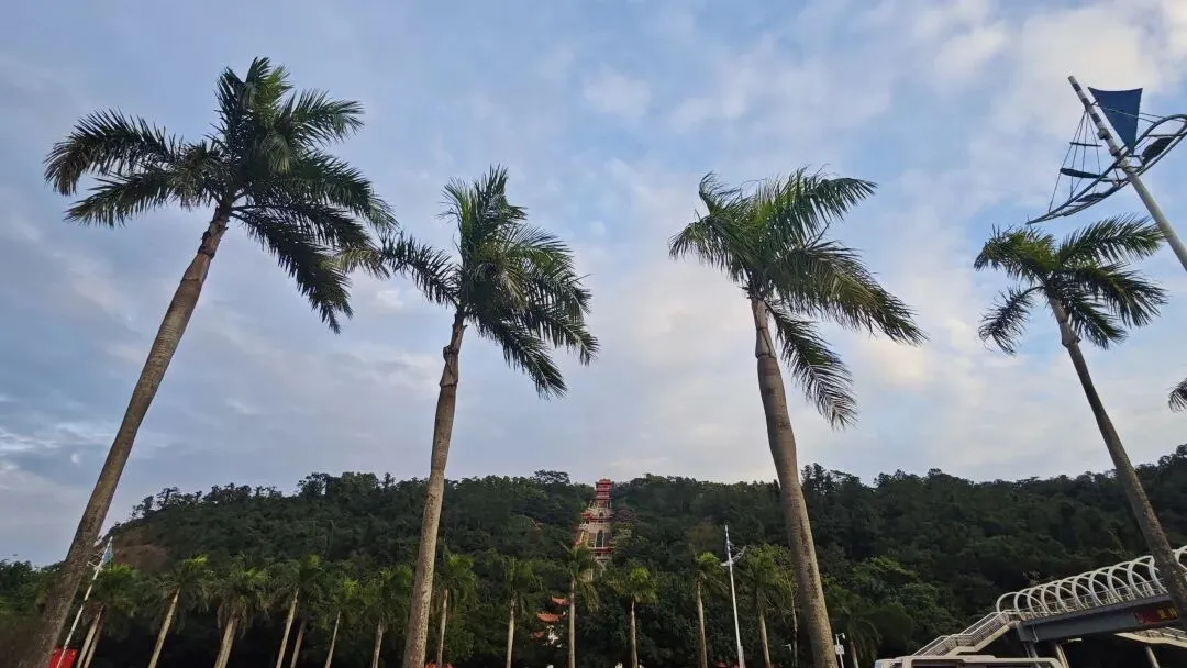 行至万尾金滩主观海平台,瞭望哨塔静静伫立,冬日里虽暂闭泳区,却更显海岸辽阔,沙软滩平,碧海蓝天,藏着南国滨海的无限暖意。