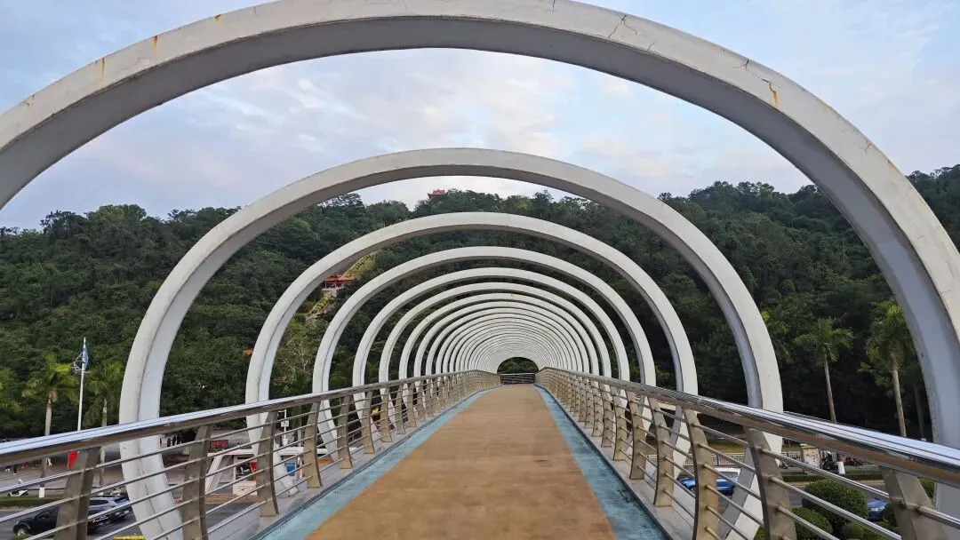 落日余晖里,西湾大桥的钢架在霞光中镀上一层金红,海面波光粼粼,将天空的橘粉与浅蓝揉碎在碧波里;弧形钢架步行桥的白色环廊层层叠叠,与岸边的棕榈树相映,余晖穿过钢架缝隙,在步道上投下交错的光影。