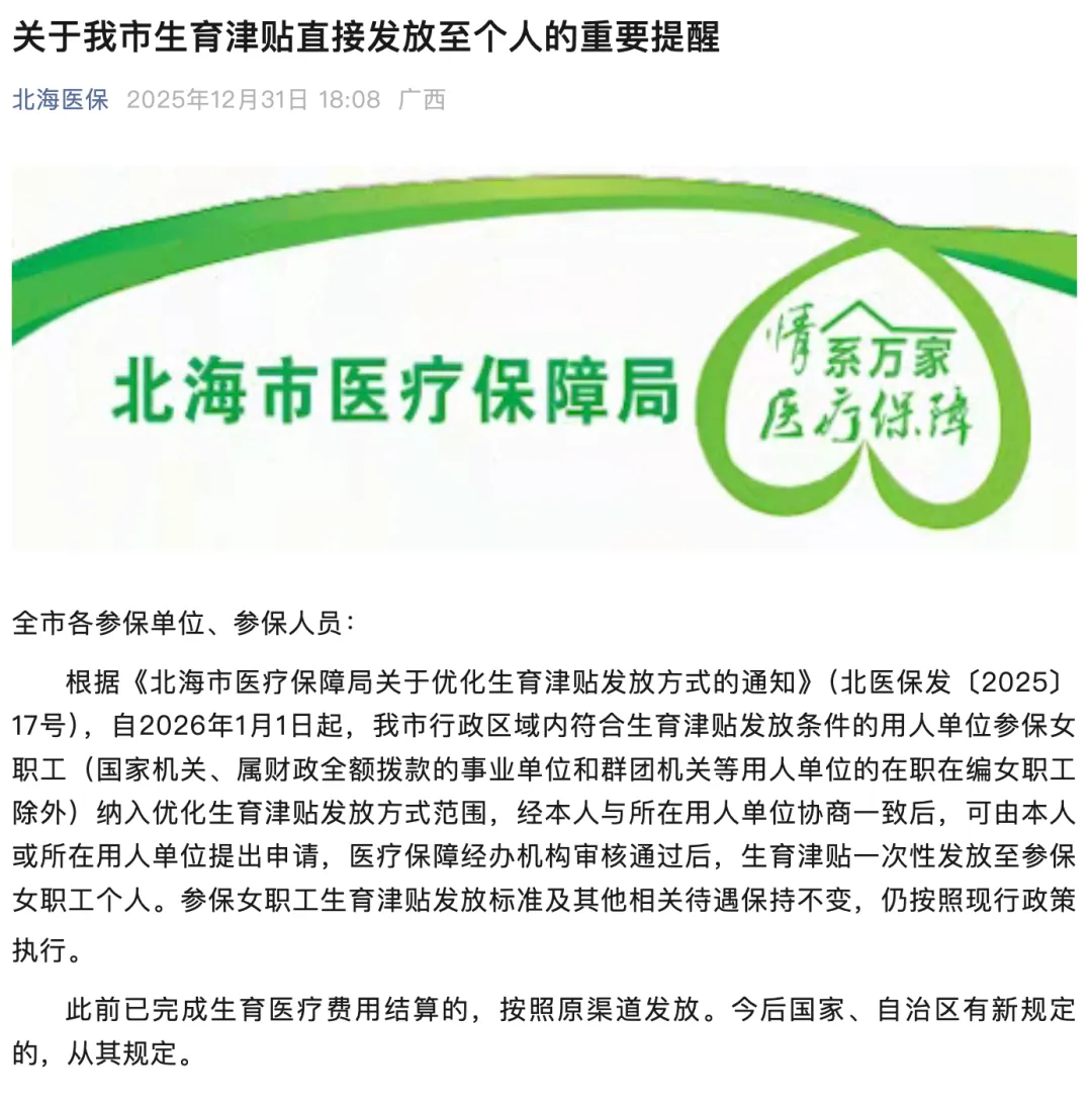 2025年12月23日,据来宾市融媒体中心消息,为落实民生保障要求,来宾市优化生育津贴发放方式,自2026年1月1日起,参保女职工的生育津贴,在原拨付到用人单位账户的基础上,增加了直接发放至个人银行账户的渠道。