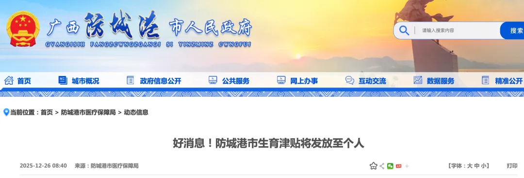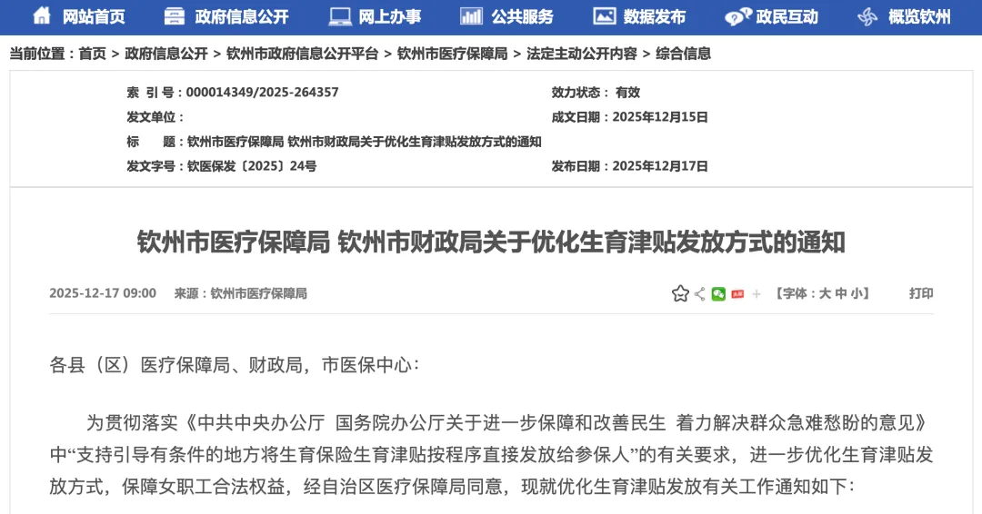 2025年12月15日,钦州市医疗保障局、钦州市财政局发布关于优化生育津贴发放方式的通知,2026年1月1日起,按照规定参加钦州市生育保险,符合生育津贴发放条件的用人单位参保职工,其生育津贴可以由医保经办机构直接发放给个人。