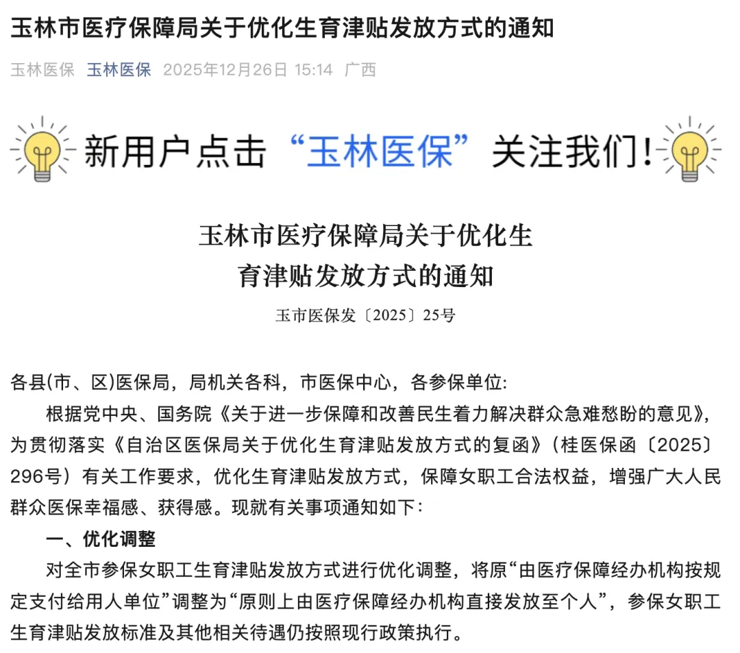 2025年12月25日,玉林市医疗保障局发布了关于优化生育津贴发放方式的通知,对全市参保女职工生育津贴发放方式进行优化调整,将原“由医疗保障经办机构按规定支付给用人单位”调整为“原则上由医疗保障经办机构直接发放至个人”,参保女职工生育津贴发放标准及其他相关待遇仍按照现行政策执行。本通知自2026年1月1日起执行,此前生育或终止妊娠的玉林市生育保险参保女职工,生育津贴仍拨付至参保单位账户。