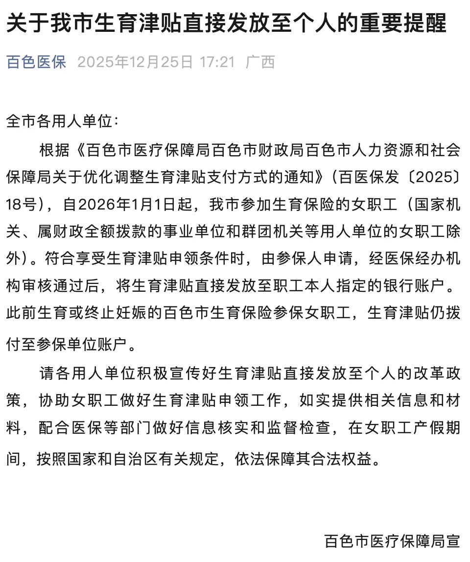 2025年12月25日,百色市医疗保障局发布关于生育津贴直接发放至个人的重要提醒,自2026年1月1日起,百色市参加生育保险的女职工(国家机关、属财政全额拨款的事业单位和群团机关等用人单位的女职工除外)。符合享受生育津贴申领条件时,由参保人申请,经医保经办机构审核通过后,将生育津贴直接发放至职工本人指定的银行账户。此前生育或终止妊娠的百色市生育保险参保女职工,生育津贴仍拨付至参保单位账户。