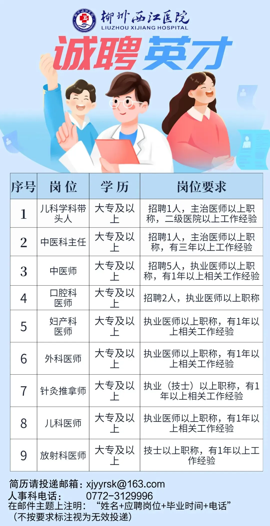 2.报名方式:网络投递,请对照招聘岗位需求表的要求,将个人简历、学历学位证书、专业技术资格证书、执业证、身份证等扫描件以附件的形式打包压缩发送到我院邮箱,并在邮件主题上注明:“姓名+应聘岗位+毕业时间+电话”(不按要求标注视为无效投递)。