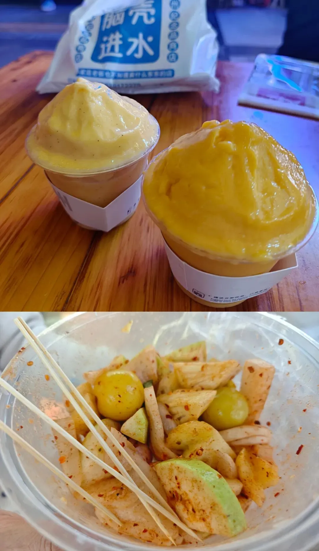心心念念的广西酸嘢,万万没想到蔬果都是提前泡过盐水的,咸得发齁,吃几块就吃不下了。又点了网上吹炸天的卢姐炒冰,点了一杯百香果和一杯芒果,都是儿童杯的,也没吃完。芒果口味还行,百香果口味怎么这么酸!