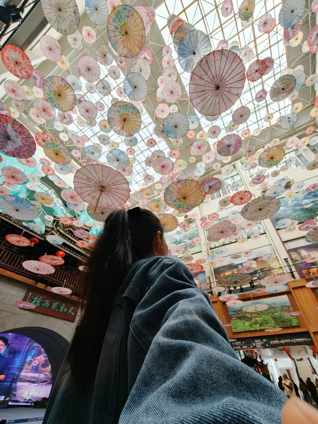 游客大概都是冲着博物馆中庭顶上的油纸伞而来,看到两个女生在拍照,很有意思,忍不住夸了一句“好会拍”,女生兴奋地说是旁边的小哥教的。旁边小哥听到有人夸他,自来熟地又过来指导我们拍,说包教包会,超认真,还夸张地说“姐姐的高马尾拍出来好绝”。情绪价值拉满的男大,真叫人喜欢。