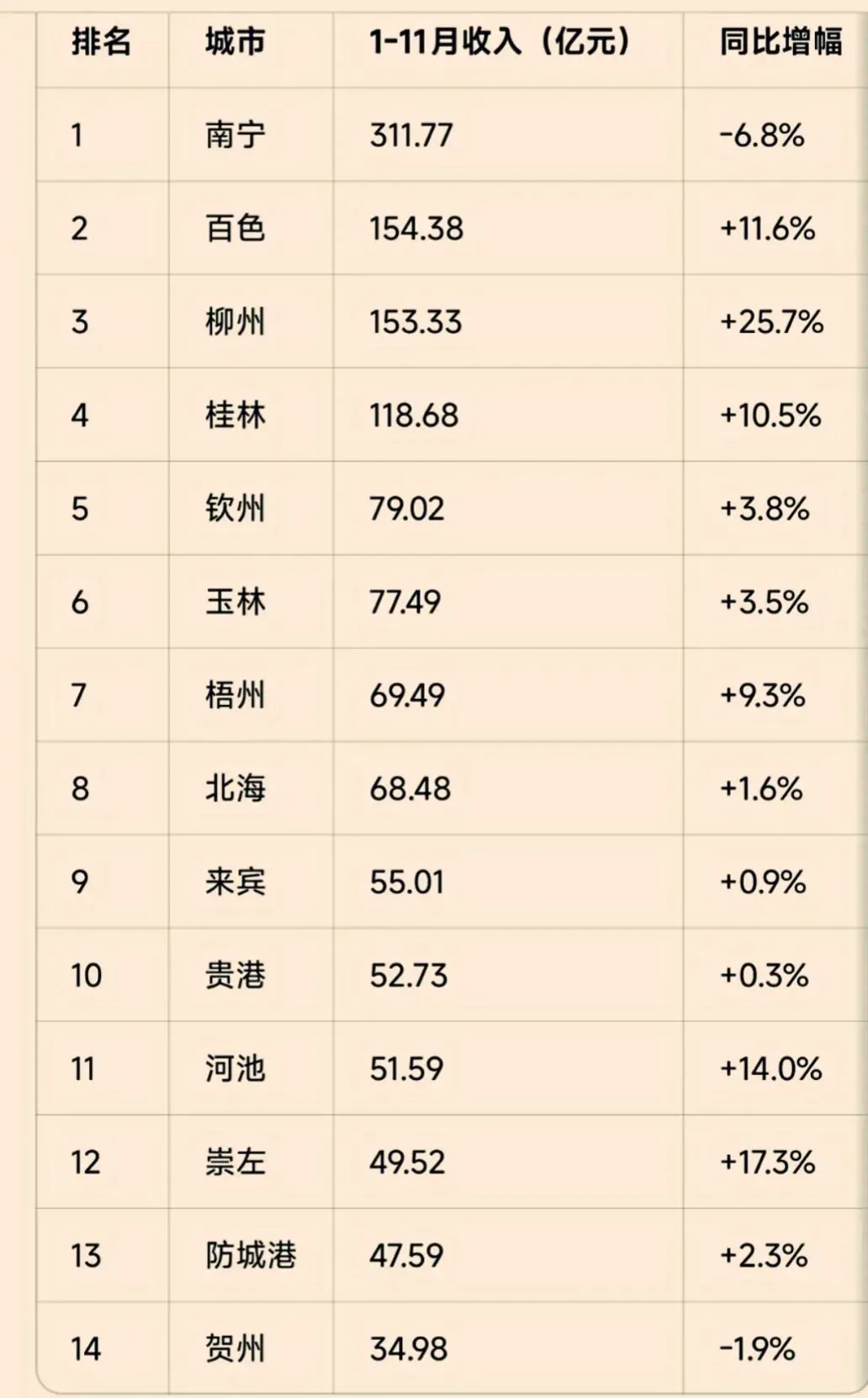 化债显成效,收入同增25.7%,柳州领先广西各市一般公共预算收入增速。2025 年 1-11 月广西各市一般公共预算收入,总量南宁、百色、柳州、桂林、钦州与玉林前六名,南宁312亿遥遥领先。柳州、百色、崇左、河池与桂林五市增速录得两位数增长。 全广西共1639亿,同比增长3.7%。沿海钦北防3市,钦州双双领先,总额多于北海约11亿,但3市总体增长乏力,无论总额或增速,总体排中后,总量钦州排第5、北海第8、防城港第13。