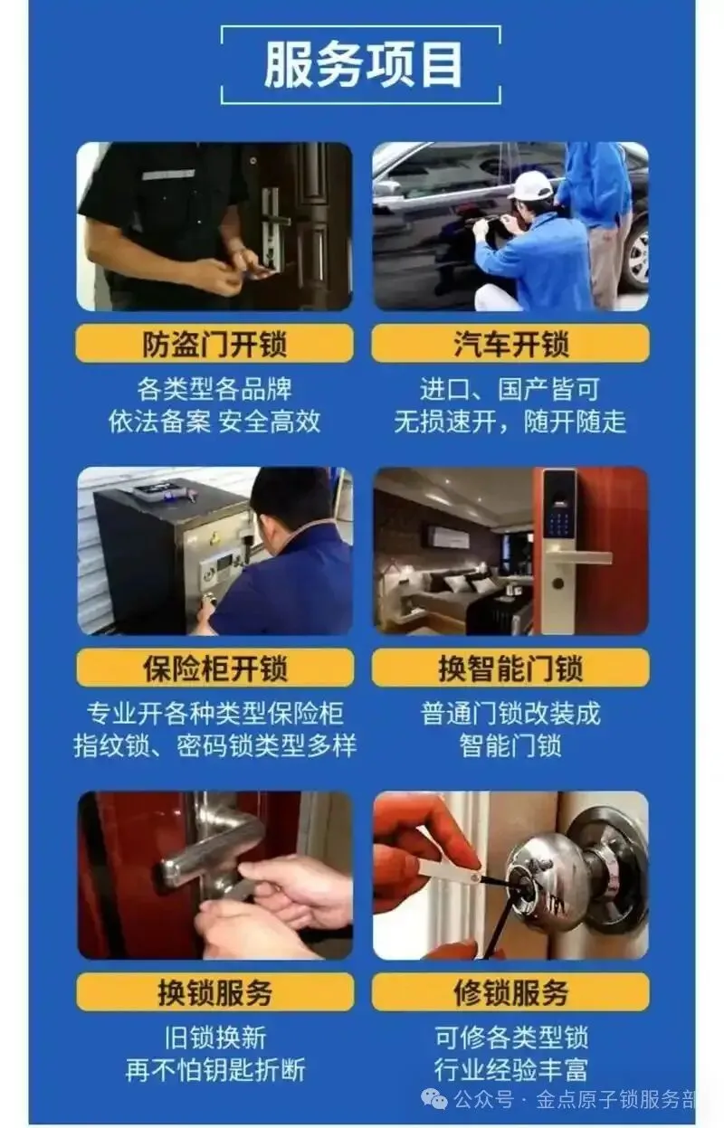专业开锁,开锁,换锁体,更换指纹锁,开指纹锁,换指纹锁,开智能锁,开门锁,开地库锁,开车锁一、开锁服务:1、专业开各种防盗门锁,开车门锁,开房门锁,开卧室门锁,开声控锁,开感应锁2、开车锁(奔驰宝马奥迪别客、捷达等)3、开单元门锁,开门锁,开智能锁。4、开锁 换锁芯 开防盗门 开汽车锁二、换锁/修服务:1、换锁芯:专业更换超B级锁芯,超C级锁芯,换防盗门专用锁芯,换锁芯,锁体,换智能锁,换指纹锁,电子锁,磁卡锁,电控锁等等。2、修服务:各种,车锁,地库锁,单元门锁等。【服务内容】1、开各种防盗门锁、入户门、换各种国产进口锁芯3、专开换写字楼大厦门锁、密码锁4、开汽车锁、奔驰、宝马、凌志、帕萨特、大切诺基、别客、捷达5、地库锁 开锁换锁 换锁芯 门锁 正规开锁公司 开汽车锁 电子锁6、承接各种锁具工程、防盗门、换好锁芯保一。开换各种防盗门锁,汽车锁、奥迪、宝马、奔驰 、凌志、大宇丰田桑塔纳、别克、大众、帕萨特等各种汽车,城内各区域设有开锁分部 让顾客满意是本永远的宗旨。